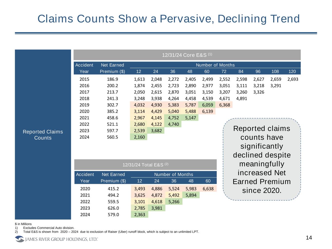13 We Have Driven a Number of Defensive and Proactive Underwriting Actions Over the Last Three Years • Representative actions include – • Broad deployment of exclusions and sub-limits, such as Firearms, Cyber and Assault & Battery (A&B). • Revised underwriting guidelines and rates by geography and risk in several classes. • Exited more volatile classes such as RideShare, Fraternities and Firearm Manufacturing. • Meaningful reduction in commercial auto appetite. • Thoughtful use of reinsurance to minimize volatility. Deep and Broad Underwriting Actions Over The Past Three Years Significantly Increased Oversight and Pricing Granularity • The Chief Underwriting Officer, who joined in 2021 with over thirty years of experience at Allied World, Chubb and Everest, works closely with Segment leadership, Claims and Actuarial Pricing. • Willing to shed business to improve profitability. • Non-renewed several large accounts that did not meet our underwriting standards and ultimately impacted top line production by over $50 MM. • Amidst talent upgrades have established meaningful disciplined processes to build broad collaboration across Underwriting, Pricing and Claims and improve underwriting performance feedback loops. Early Results Are Positive • The Company has not yet incorporated early signs or “green shoots” from demonstrated underwriting actions into our assumptions for the most recent accident years. • Our expectation is that these actions should improve profitability over time.