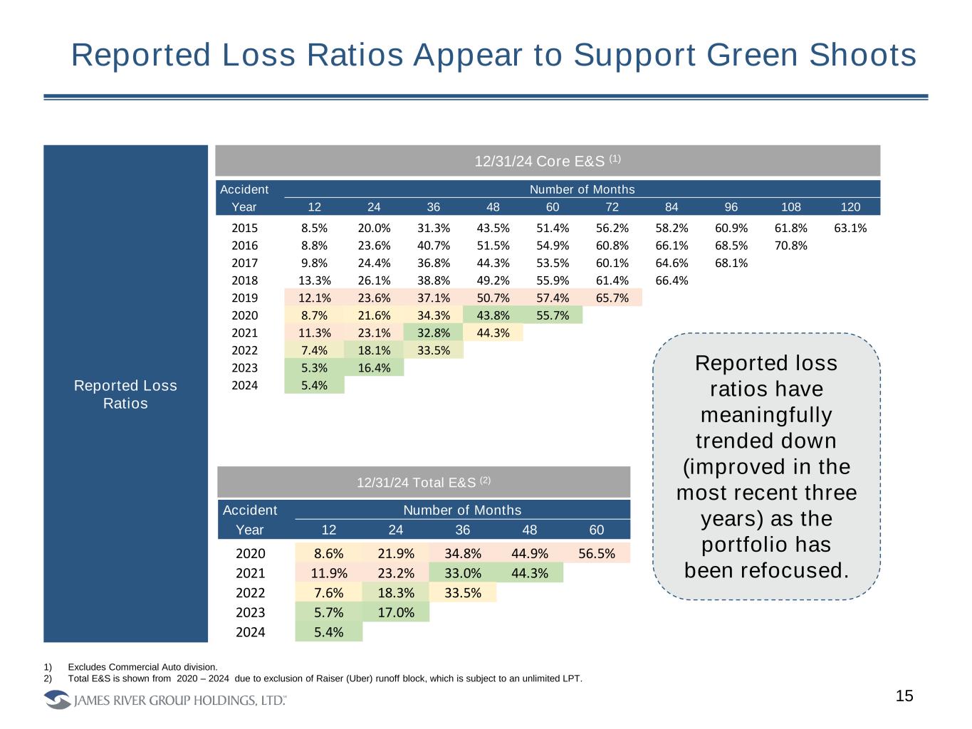 14 12/31/24 Total E&S (2) 12/31/24 Core E&S (1) Reported Claims Counts $ in Millions 1) Excludes Commercial Auto division. 2) Total E&S is shown from 2020 – 2024 due to exclusion of Raiser (Uber) runoff block, which is subject to an unlimited LPT. Claims Counts Show a Pervasive, Declining Trend Reported claims counts have significantly declined despite meaningfully increased Net Earned Premium since 2020. Accident Net Earned Number of Months Year Premium ($) 12 24 36 48 60 72 84 96 108 120 2015 186.9 1,613 2,048 2,272 2,405 2,499 2,552 2,598 2,627 2,659 2,693 2016 200.2 1,874 2,455 2,723 2,890 2,977 3,051 3,111 3,218 3,291 2017 213.7 2,050 2,615 2,870 3,051 3,150 3,207 3,260 3,326 2018 241.3 3,248 3,938 4,264 4,458 4,539 4,671 4,891 2019 302.7 4,032 4,930 5,383 5,787 6,059 6,368 2020 385.2 3,114 4,429 5,040 5,488 6,139 2021 458.6 2,967 4,145 4,752 5,147 2022 521.1 2,680 4,122 4,740 2023 597.7 2,539 3,682 2024 560.5 2,160 Accident Net Earned Number of Months Year Premium ($) 12 24 36 48 60 2020 415.2 3,493 4,886 5,524 5,983 6,638 2021 494.2 3,625 4,872 5,492 5,894 2022 559.5 3,101 4,618 5,266 2023 626.0 2,785 3,981 2024 579.0 2,363