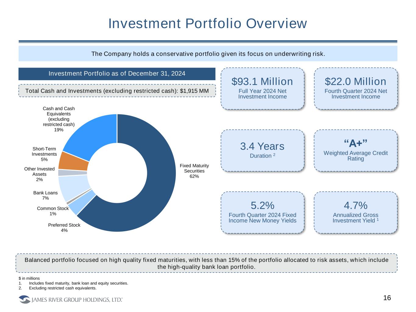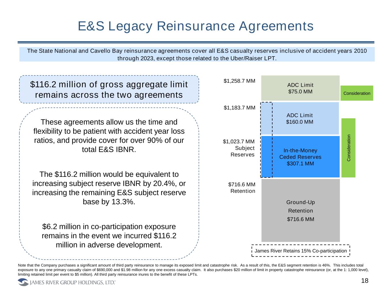 Capital Position 17 Our strong balance sheet enables us to continue to capitalize on an extremely attractive P&C market. Commentary • Balance sheet characterized by low financial and operating leverage levels, securities that provide meaningful equity / rating agency credit, a high-quality investment portfolio, high rated reinsurers, and meaningful credit and collateral. • Actions taken over the last four years – and especially over the last quarter – add meaningful common equity to the balance sheet and provide significant adverse development capacity. • These actions position the business for strong and profitable growth, in order to generate a compelling and stable return on operating return on average common equity. • During the revaluation of the Series A Preferred Shares due to the Amendment announced in November 2024, $27 million was accounted for as a deemed dividend. This dynamic reduced tangible common equity per share by approximately $0.60. • Healthy operating and financial leverage ratios leave significant capacity for growth. $ and shares in millions, except per share figures. (1) Excluding restricted cash equivalents. (2) Leverage ratio, in accordance with the Company’s credit agreements, is calculated as adjusted consolidated debt / total capital. Adjusted consolidated debt treats hybrid securities as equity capital up to 15% of total capitalization. Total capital is defined as total debt plus tangible equity excluding accumulated other comprehensive income. (3) Net written premium presented on an LTM basis as of the period indicated. Balance Sheet as of: 4Q 2023 1Q 2024 2Q 2024 3Q 2024 4Q 2024 Assets Total Invested Assets $1,705.9 $1,706.8 $1,490.1 $1,575.1 $1,552.4 Cash and Cash Equivalents (1) 274.3 305.5 672.5 359.8 362.3 Reinsurance Recoverables 1,516.5 1,520.2 1,578.3 2,072.6 2,098.1 Goodwill and Intangible Assets 214.6 214.6 214.5 214.4 214.3 Total Assets 5,317.3 5,250.9 4,738.2 4,958.7 5,007.1 Liabilities and Shareholders' Equity Reserve for Losses and LAE 2,606.1 2,661.9 2,720.2 3,001.9 3,084.4 Deferred Reinsurance Gain 20.7 16.7 13.0 31.0 58.0 Senior Debt 222.3 222.3 200.8 200.8 200.8 Junior Subordinated Debt 104.1 104.1 104.1 104.1 104.1 Total Debt 326.4 326.4 304.9 304.9 304.9 Accumulated Other Comprehensive Income (AOCI) (63.7) (71.5) (73.9) (42.8) (70.0) Series A Redeemable Preferred Shares 144.9 144.9 144.9 144.9 133.1 Shareholders' Equity 534.6 539.5 541.8 530.3 460.9 Tangible Equity 485.6 486.6 485.3 491.9 437.7 Tangible Equity (Leverage Ratio) 464.9 469.9 472.2 460.9 379.7 Tangible Common Equity 340.7 341.7 340.4 347.0 304.6 Leverage Metrics Leverage Ratio (2) 26% 26% 24% 25% 27% Net Written Premium / Tangible Equity (3) 1.43x 1.36x 1.31x 1.30x 1.33x Per Share Metrics Shareholders’ Equity per Share $14.20 $14.27 $14.32 $14.02 $10.10 Tangible Equity per Share $11.13 $10.92 $10.86 $11.01 $7.40 Tangible Common Equity per Share $9.05 $9.03 $9.00 $9.17 $6.67