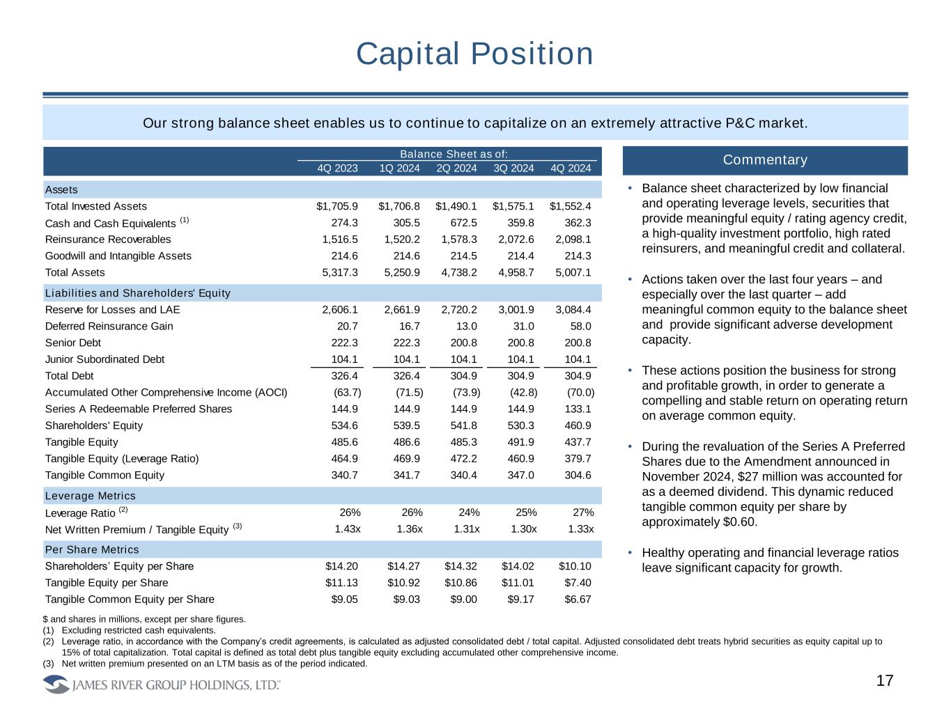 Fixed Maturity Securities 62% Preferred Stock 4% Common Stock 1% Bank Loans 7% Other Invested Assets 2% Short-Term Investments 5% Cash and Cash Equivalents (excluding restricted cash) 19% Investment Portfolio Overview 16 Investment Portfolio as of December 31, 2024 The Company holds a conservative portfolio given its focus on underwriting risk. $ in millions 1. Includes fixed maturity, bank loan and equity securities. 2. Excluding restricted cash equivalents. “A+” Weighted Average Credit Rating 3.4 Years Duration 2 $22.0 Million Fourth Quarter 2024 Net Investment Income 4.7% Annualized Gross Investment Yield 1 Total Cash and Investments (excluding restricted cash): $1,915 MM 5.2% Fourth Quarter 2024 Fixed Income New Money Yields Balanced portfolio focused on high quality fixed maturities, with less than 15% of the portfolio allocated to risk assets, which include the high-quality bank loan portfolio. $93.1 Million Full Year 2024 Net Investment Income