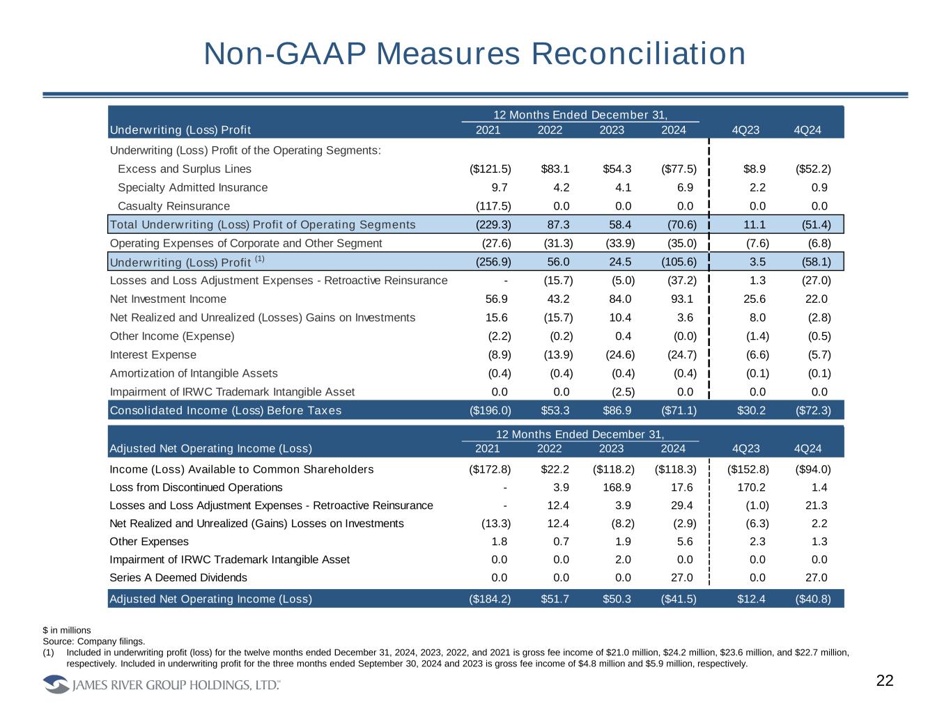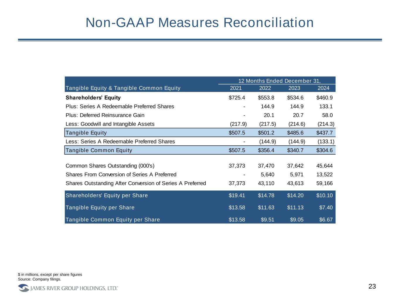 Non-GAAP Measures Reconciliation 22 $ in millions Source: Company filings. (1) Included in underwriting profit (loss) for the twelve months ended December 31, 2024, 2023, 2022, and 2021 is gross fee income of $21.0 million, $24.2 million, $23.6 million, and $22.7 million, respectively. Included in underwriting profit for the three months ended September 30, 2024 and 2023 is gross fee income of $4.8 million and $5.9 million, respectively. 12 Months Ended December 31, Underwriting (Loss) Profit 2021 2022 2023 2024 4Q23 4Q24 Underwriting (Loss) Profit of the Operating Segments: Excess and Surplus Lines ($121.5) $83.1 $54.3 ($77.5) $8.9 ($52.2) Specialty Admitted Insurance 9.7 4.2 4.1 6.9 2.2 0.9 Casualty Reinsurance (117.5) 0.0 0.0 0.0 0.0 0.0 Total Underwriting (Loss) Profit of Operating Segments (229.3) 87.3 58.4 (70.6) 11.1 (51.4) Operating Expenses of Corporate and Other Segment (27.6) (31.3) (33.9) (35.0) (7.6) (6.8) Underwriting (Loss) Profit (1) (256.9) 56.0 24.5 (105.6) 3.5 (58.1) Losses and Loss Adjustment Expenses - Retroactive Reinsurance - (15.7) (5.0) (37.2) 1.3 (27.0) Net Investment Income 56.9 43.2 84.0 93.1 25.6 22.0 Net Realized and Unrealized (Losses) Gains on Investments 15.6 (15.7) 10.4 3.6 8.0 (2.8) Other Income (Expense) (2.2) (0.2) 0.4 (0.0) (1.4) (0.5) Interest Expense (8.9) (13.9) (24.6) (24.7) (6.6) (5.7) Amortization of Intangible Assets (0.4) (0.4) (0.4) (0.4) (0.1) (0.1) Impairment of IRWC Trademark Intangible Asset 0.0 0.0 (2.5) 0.0 0.0 0.0 Consolidated Income (Loss) Before Taxes ($196.0) $53.3 $86.9 ($71.1) $30.2 ($72.3) 12 Months Ended December 31, Adjusted Net Operating Income (Loss) 2021 2022 2023 2024 4Q23 4Q24 Income (Loss) Available to Common Shareholders ($172.8) $22.2 ($118.2) ($118.3) ($152.8) ($94.0) Loss from Discontinued Operations - 3.9 168.9 17.6 170.2 1.4 Losses and Loss Adjustment Expenses - Retroactive Reinsurance - 12.4 3.9 29.4 (1.0) 21.3 Net Realized and Unrealized (Gains) Losses on Investments (13.3) 12.4 (8.2) (2.9) (6.3) 2.2 Other Expenses 1.8 0.7 1.9 5.6 2.3 1.3 Impairment of IRWC Trademark Intangible Asset 0.0 0.0 2.0 0.0 0.0 0.0 Series A Deemed Dividends 0.0 0.0 0.0 27.0 0.0 27.0 Adjusted Net Operating Income (Loss) ($184.2) $51.7 $50.3 ($41.5) $12.4 ($40.8)