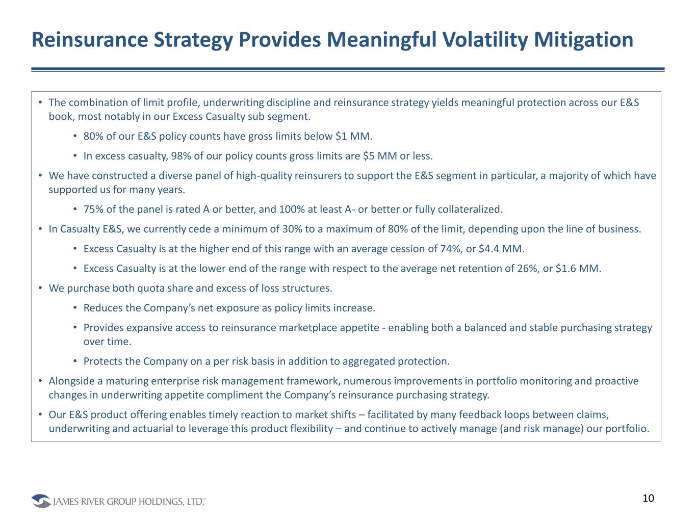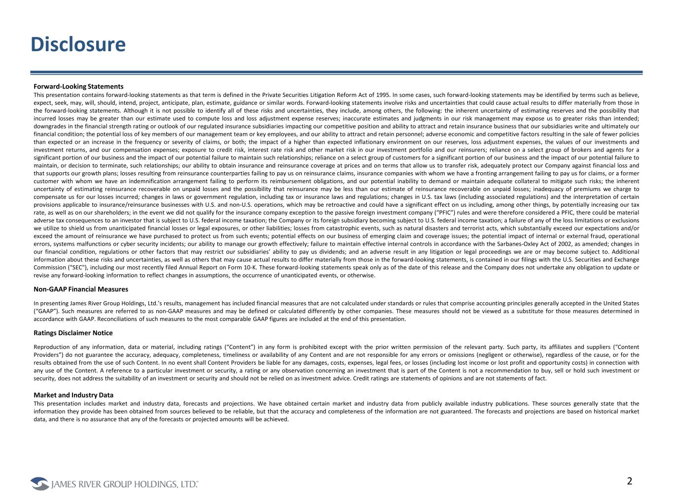Disclosure 2 Forward-Looking Statements This presentation contains forward-looking statements as that term is defined in the Private Securities Litigation Reform Act of 1995. In some cases, such forward-looking statements may be identified by terms such as believe, expect, seek, may, will, should, intend, project, anticipate, plan, estimate, guidance or similar words. Forward-looking statements involve risks and uncertainties that could cause actual results to differ materially from those in the forward-looking statements. Although it is not possible to identify all of these risks and uncertainties, they include, among others, the following: the inherent uncertainty of estimating reserves and the possibility that incurred losses may be greater than our estimate used to compute loss and loss adjustment expense reserves; inaccurate estimates and judgments in our risk management may expose us to greater risks than intended; downgrades in the financial strength rating or outlook of our regulated insurance subsidiaries impacting our competitive position and ability to attract and retain insurance business that our subsidiaries write and ultimately our financial condition; the potential loss of key members of our management team or key employees, and our ability to attract and retain personnel; adverse economic and competitive factors resulting in the sale of fewer policies than expected or an increase in the frequency or severity of claims, or both; the impact of a higher than expected inflationary environment on our reserves, loss adjustment expenses, the values of our investments and investment returns, and our compensation expenses; exposure to credit risk, interest rate risk and other market risk in our investment portfolio and our reinsurers; reliance on a select group of brokers and agents for a significant portion of our business and the impact of our potential failure to maintain such relationships; reliance on a select group of customers for a significant portion of our business and the impact of our potential failure to maintain, or decision to terminate, such relationships; our ability to obtain insurance and reinsurance coverage at prices and on terms that allow us to transfer risk, adequately protect our Company against financial loss and that supports our growth plans; losses resulting from reinsurance counterparties failing to pay us on reinsurance claims, insurance companies with whom we have a fronting arrangement failing to pay us for claims, or a former customer with whom we have an indemnification arrangement failing to perform its reimbursement obligations, and our potential inability to demand or maintain adequate collateral to mitigate such risks; the inherent uncertainty of estimating reinsurance recoverable on unpaid losses and the possibility that reinsurance may be less than our estimate of reinsurance recoverable on unpaid losses; inadequacy of premiums we charge to compensate us for our losses incurred; changes in laws or government regulation, including tax or insurance laws and regulations; changes in U.S. tax laws (including associated regulations) and the interpretation of certain provisions applicable to insurance/reinsurance businesses with U.S. and non-U.S. operations, which may be retroactive and could have a significant effect on us including, among other things, by potentially increasing our tax rate, as well as on our shareholders; in the event we did not qualify for the insurance company exception to the passive foreign investment company (“PFIC”) rules and were therefore considered a PFIC, there could be material adverse tax consequences to an investor that is subject to U.S. federal income taxation; the Company or its foreign subsidiary becoming subject to U.S. federal income taxation; a failure of any of the loss limitations or exclusions we utilize to shield us from unanticipated financial losses or legal exposures, or other liabilities; losses from catastrophic events, such as natural disasters and terrorist acts, which substantially exceed our expectations and/or exceed the amount of reinsurance we have purchased to protect us from such events; potential effects on our business of emerging claim and coverage issues; the potential impact of internal or external fraud, operational errors, systems malfunctions or cyber security incidents; our ability to manage our growth effectively; failure to maintain effective internal controls in accordance with the Sarbanes-Oxley Act of 2002, as amended; changes in our financial condition, regulations or other factors that may restrict our subsidiaries’ ability to pay us dividends; and an adverse result in any litigation or legal proceedings we are or may become subject to. Additional information about these risks and uncertainties, as well as others that may cause actual results to differ materially from those in the forward-looking statements, is contained in our filings with the U.S. Securities and Exchange Commission ("SEC"), including our most recently filed Annual Report on Form 10-K. These forward-looking statements speak only as of the date of this release and the Company does not undertake any obligation to update or revise any forward-looking information to reflect changes in assumptions, the occurrence of unanticipated events, or otherwise. Non-GAAP Financial Measures In presenting James River Group Holdings, Ltd.’s results, management has included financial measures that are not calculated under standards or rules that comprise accounting principles generally accepted in the United States (“GAAP”). Such measures are referred to as non-GAAP measures and may be defined or calculated differently by other companies. These measures should not be viewed as a substitute for those measures determined in accordance with GAAP. Reconciliations of such measures to the most comparable GAAP figures are included at the end of this presentation. Ratings Disclaimer Notice Reproduction of any information,