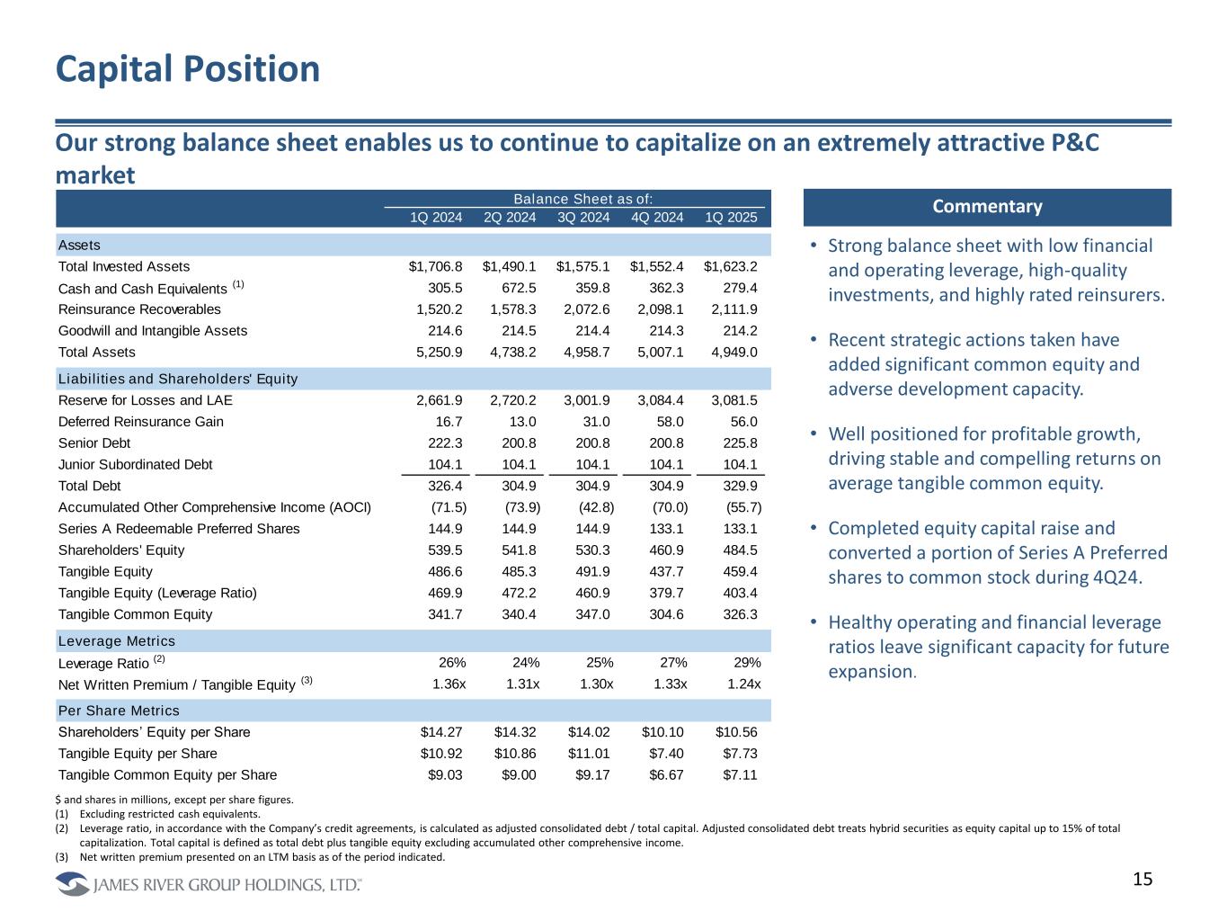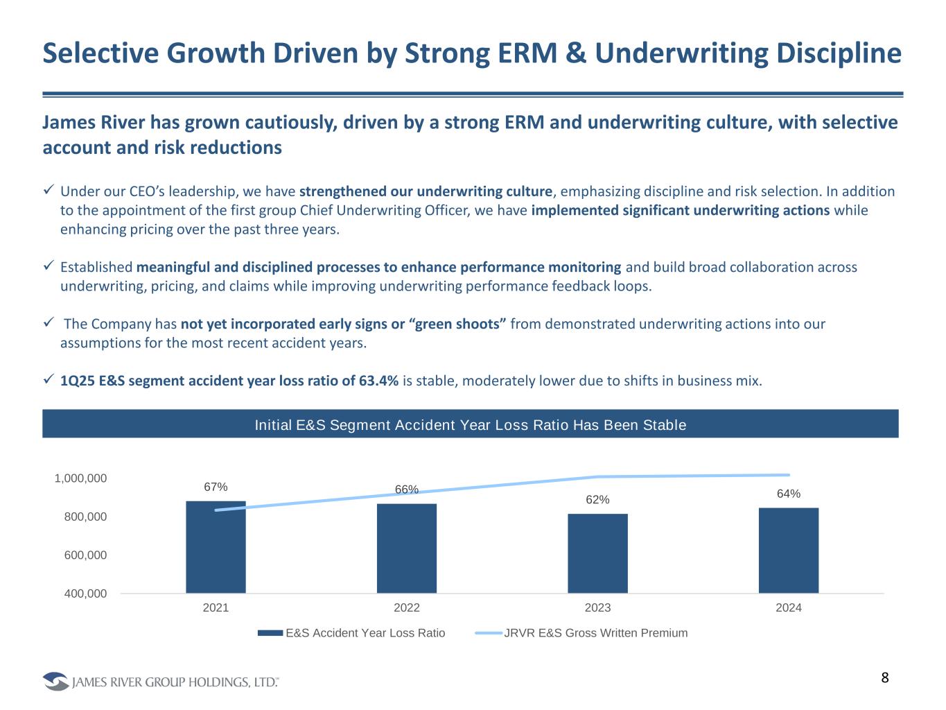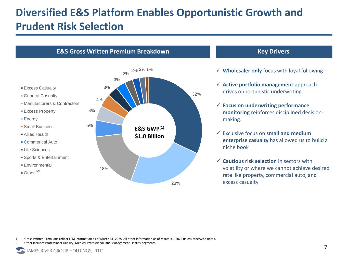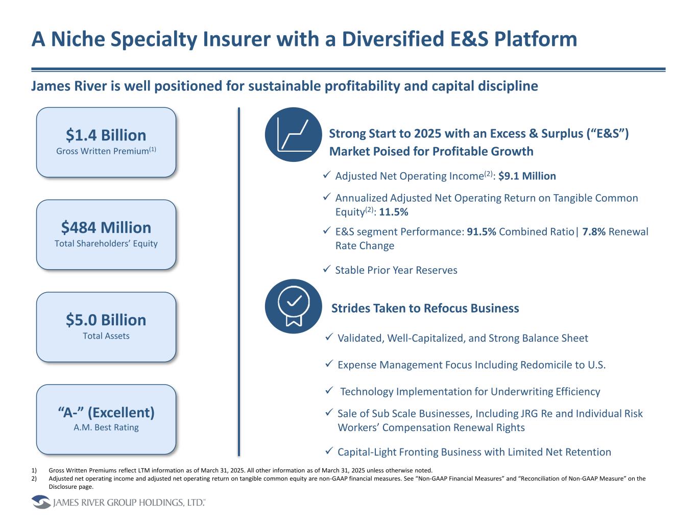 A Niche Specialty Insurer with a Diversified E&S Platform $484 Million Total Shareholders’ Equity $5.0 Billion Total Assets $1.4 Billion Gross Written Premium(1) “A-” (Excellent) A.M. Best Rating James River is well positioned for sustainable profitability and capital discipline 1) Gross Written Premiums reflect LTM information as of March 31, 2025. All other information as of March 31, 2025 unless otherwise noted. 2) Adjusted net operating income and adjusted net operating return on tangible common equity are non-GAAP financial measures. See “Non-GAAP Financial Measures” and “Reconciliation of Non-GAAP Measure” on the Disclosure page. Strides Taken to Refocus Business ✓ Validated, Well-Capitalized, and Strong Balance Sheet ✓ Expense Management Focus Including Redomicile to U.S. ✓ Technology Implementation for Underwriting Efficiency ✓ Sale of Sub Scale Businesses, Including JRG Re and Individual Risk Workers’ Compensation Renewal Rights ✓ Capital-Light Fronting Business with Limited Net Retention Strong Start to 2025 with an Excess & Surplus (“E&S”) Market Poised for Profitable Growth ✓ Adjusted Net Operating Income(2): $9.1 Million ✓ Annualized Adjusted Net Operating Return on Tangible Common Equity(2): 11.5% ✓ E&S segment Performance: 91.5% Combined Ratio| 7.8% Renewal Rate Change ✓ Stable Prior Year Reserves
