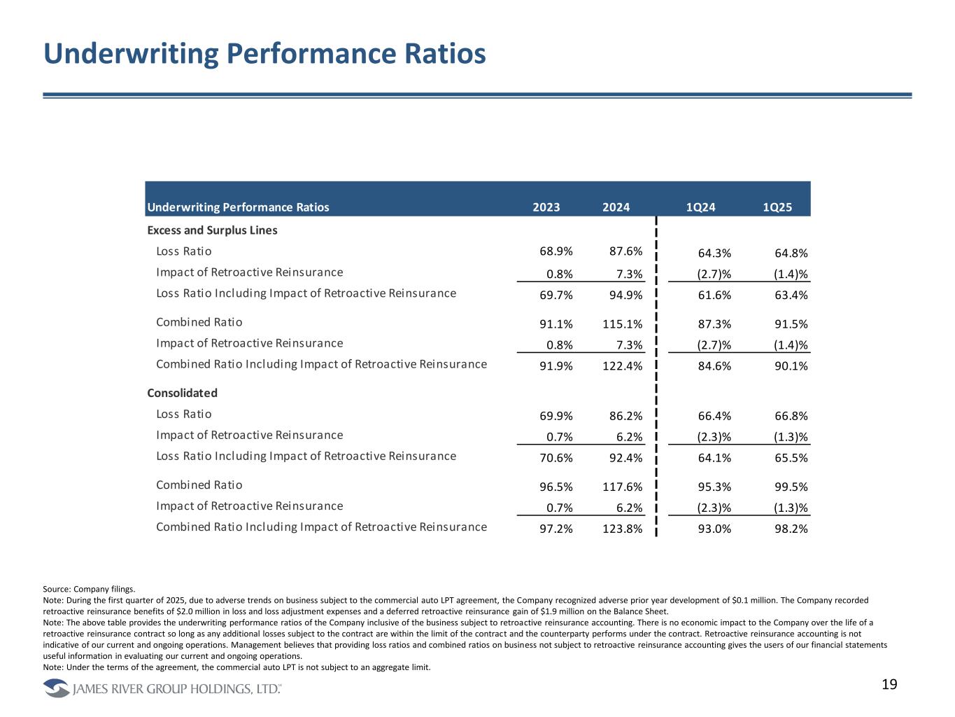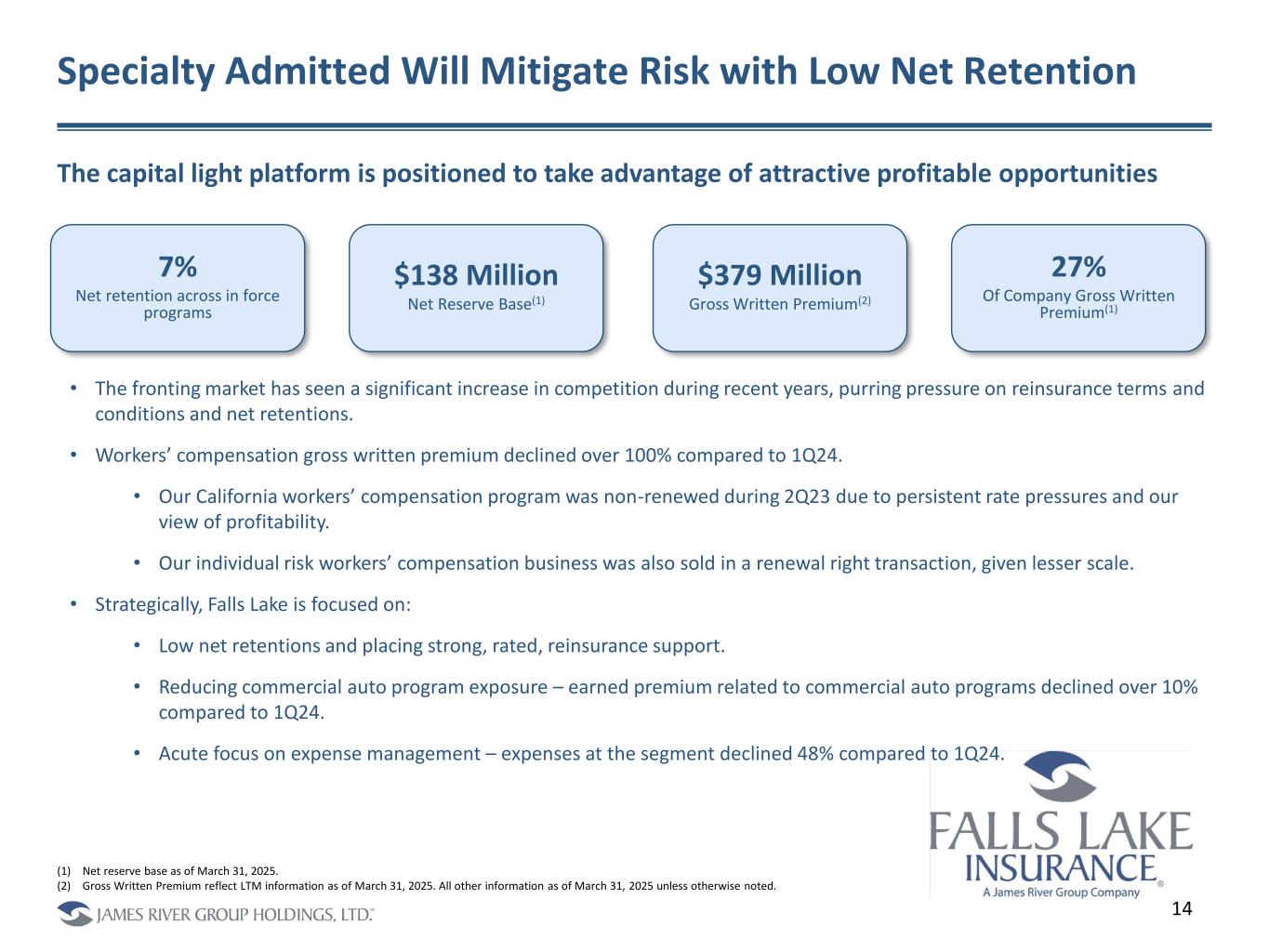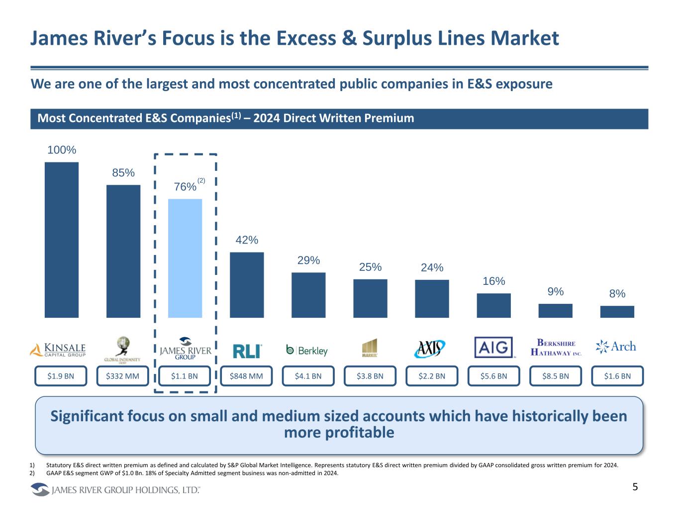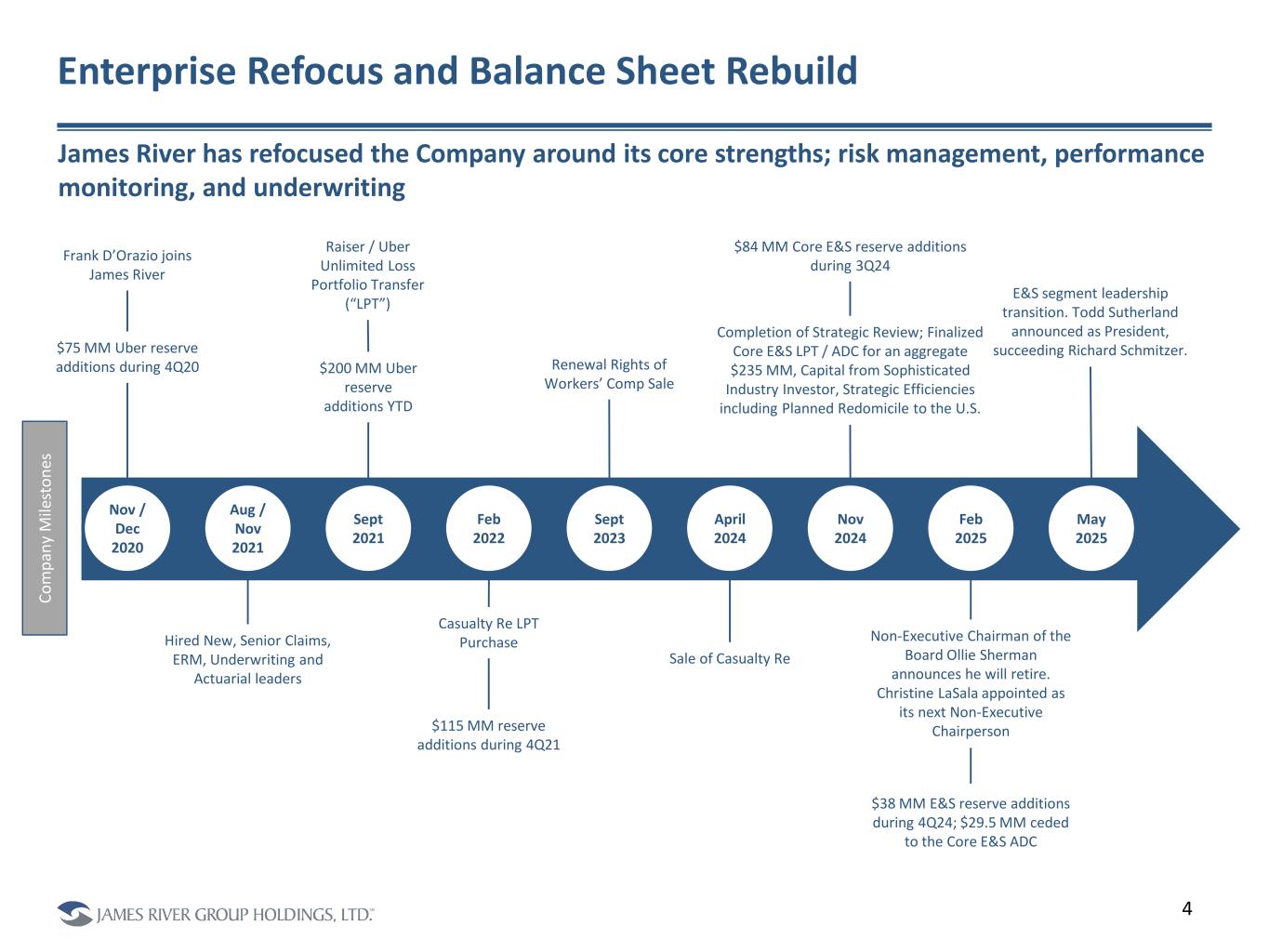 A Niche Specialty Insurer with a Diversified E&S Platform $484 Million Total Shareholders’ Equity $5.0 Billion Total Assets $1.4 Billion Gross Written Premium(1) “A-” (Excellent) A.M. Best Rating James River is well positioned for sustainable profitability and capital discipline 1) Gross Written Premiums reflect LTM information as of March 31, 2025. All other information as of March 31, 2025 unless otherwise noted. 2) Adjusted net operating income and adjusted net operating return on tangible common equity are non-GAAP financial measures. See “Non-GAAP Financial Measures” and “Reconciliation of Non-GAAP Measure” on the Disclosure page. Strides Taken to Refocus Business ✓ Validated, Well-Capitalized, and Strong Balance Sheet ✓ Expense Management Focus Including Redomicile to U.S. ✓ Technology Implementation for Underwriting Efficiency ✓ Sale of Sub Scale Businesses, Including JRG Re and Individual Risk Workers’ Compensation Renewal Rights ✓ Capital-Light Fronting Business with Limited Net Retention Strong Start to 2025 with an Excess & Surplus (“E&S”) Market Poised for Profitable Growth ✓ Adjusted Net Operating Income(2): $9.1 Million ✓ Annualized Adjusted Net Operating Return on Tangible Common Equity(2): 11.5% ✓ E&S segment Performance: 91.5% Combined Ratio| 7.8% Renewal Rate Change ✓ Stable Prior Year Reserves