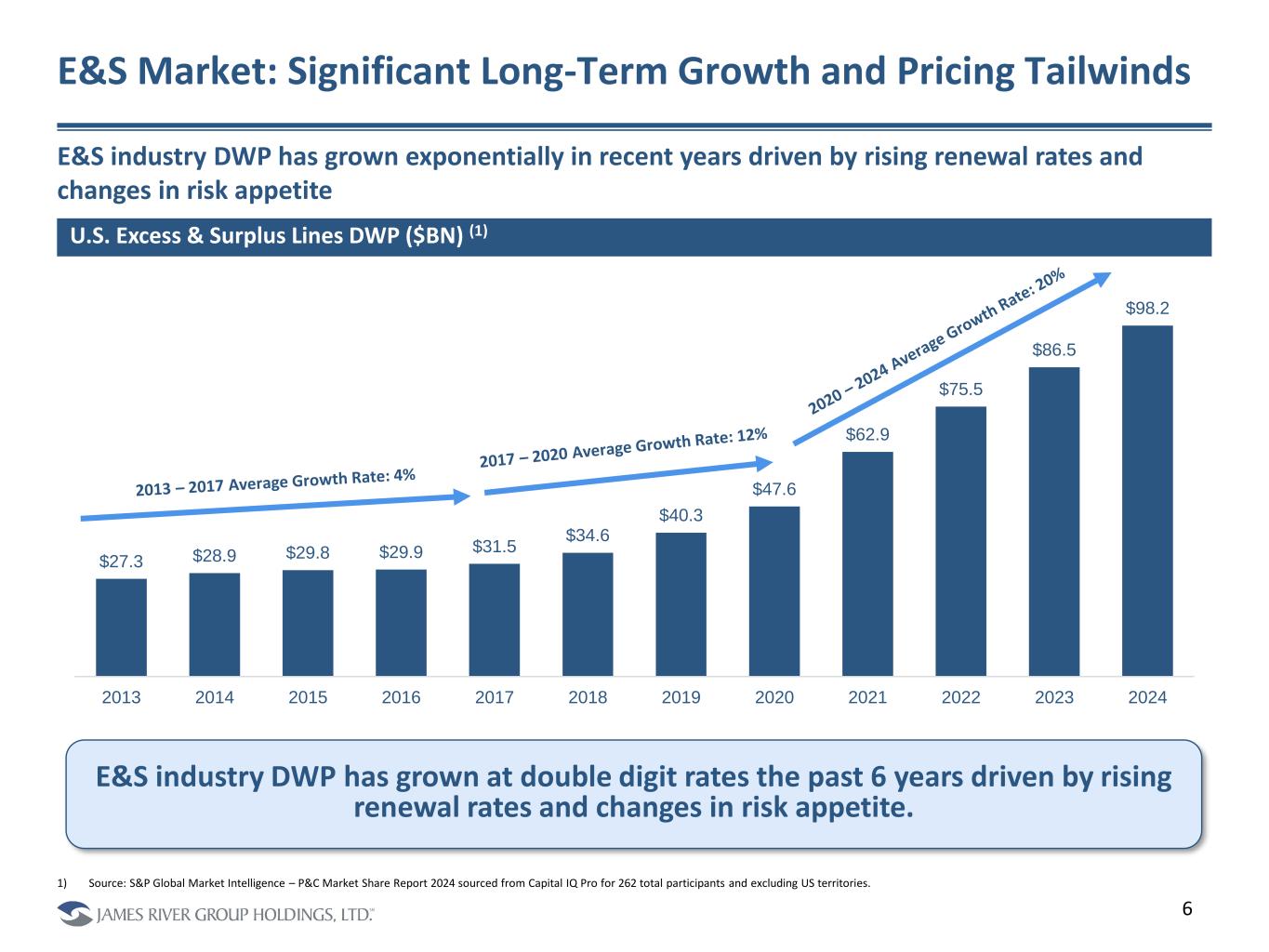 5 James River’s Focus is the Excess & Surplus Lines Market 1) Statutory E&S direct written premium as defined and calculated by S&P Global Market Intelligence. Represents statutory E&S direct written premium divided by GAAP consolidated gross written premium for 2024. 2) GAAP E&S segment GWP of $1.0 Bn. 18% of Specialty Admitted segment business was non-admitted in 2024. Most Concentrated E&S Companies(1) – 2024 Direct Written Premium $1.9 BN $332 MM $1.1 BN $848 MM $4.1 BN $3.8 BN $2.2 BN $5.6 BN $8.5 BN $1.6 BN We are one of the largest and most concentrated public companies in E&S exposure Significant focus on small and medium sized accounts which have historically been more profitable 100% 85% 76% 42% 29% 25% 24% 16% 9% 8% (2)