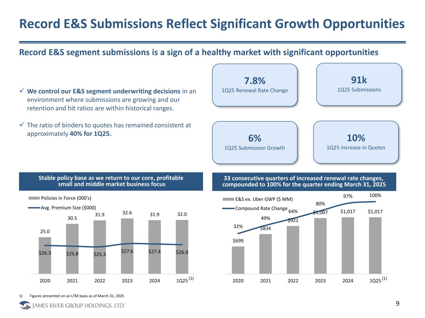 8 Selective Growth Driven by Strong ERM & Underwriting Discipline James River has grown cautiously, driven by a strong ERM and underwriting culture, with selective account and risk reductions ✓ Under our CEO’s leadership, we have strengthened our underwriting culture, emphasizing discipline and risk selection. In addition to the appointment of the first group Chief Underwriting Officer, we have implemented significant underwriting actions while enhancing pricing over the past three years. ✓ Established meaningful and disciplined processes to enhance performance monitoring and build broad collaboration across underwriting, pricing, and claims while improving underwriting performance feedback loops. ✓ The Company has not yet incorporated early signs or “green shoots” from demonstrated underwriting actions into our assumptions for the most recent accident years. ✓ 1Q25 E&S segment accident year loss ratio of 63.4% is stable, moderately lower due to shifts in business mix. Initial E&S Segment Accident Year Loss Ratio Has Been Stable 67% 66% 62% 64% 400,000 600,000 800,000 1,000,000 2021 2022 2023 2024 E&S Accident Year Loss Ratio JRVR E&S Gross Written Premium