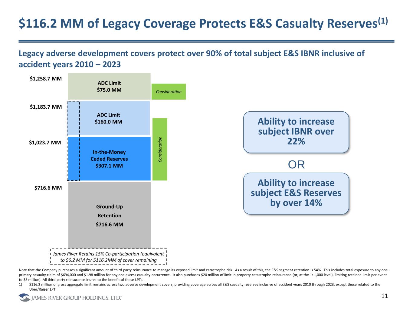 10 Reinsurance Strategy Provides Meaningful Volatility Mitigation • The combination of limit profile, underwriting discipline and reinsurance strategy yields meaningful protection across our E&S book, most notably in our Excess Casualty sub segment. • 80% of our E&S policy counts have gross limits below $1 MM. • In excess casualty, 98% of our policy counts gross limits are $5 MM or less. • We have constructed a diverse panel of high-quality reinsurers to support the E&S segment in particular, a majority of which have supported us for many years. • 75% of the panel is rated A or better, and 100% at least A- or better or fully collateralized. • In Casualty E&S, we currently cede a minimum of 30% to a maximum of 80% of the limit, depending upon the line of business. • Excess Casualty is at the higher end of this range with an average cession of 74%, or $4.4 MM. • Excess Casualty is at the lower end of the range with respect to the average net retention of 26%, or $1.6 MM. • We purchase both quota share and excess of loss structures. • Reduces the Company’s net exposure as policy limits increase. • Provides expansive access to reinsurance marketplace appetite - enabling both a balanced and stable purchasing strategy over time. • Protects the Company on a per risk basis in addition to aggregated protection. • Alongside a maturing enterprise risk management framework, numerous improvements in portfolio monitoring and proactive changes in underwriting appetite compliment the Company’s reinsurance purchasing strategy. • Our E&S product offering enables timely reaction to market shifts – facilitated by many feedback loops between claims, underwriting and actuarial to leverage this product flexibility – and continue to actively manage (and risk manage) our portfolio.