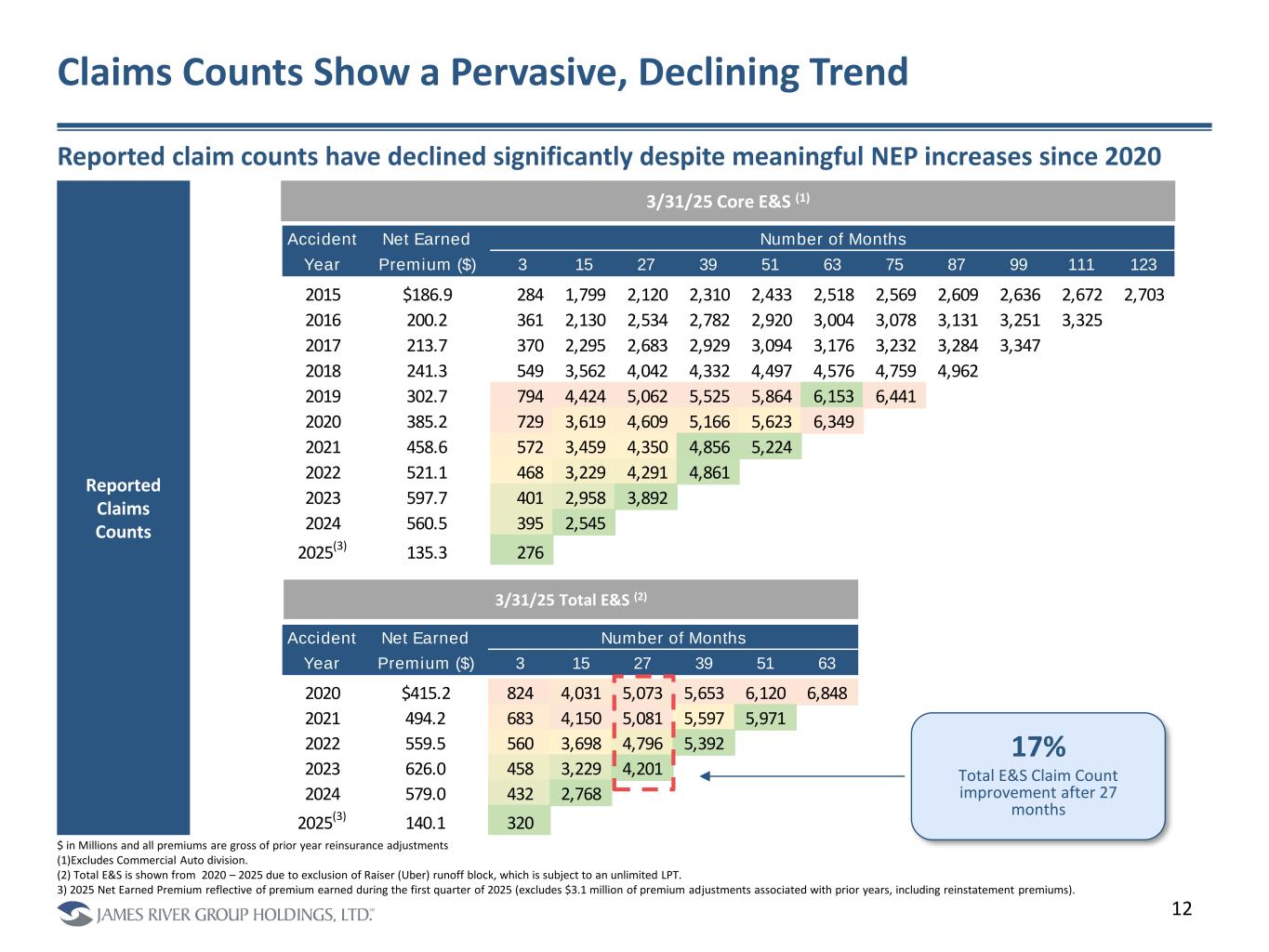 11 $116.2 MM of Legacy Coverage Protects E&S Casualty Reserves(1) In-the-Money Ceded Reserves $307.1 MM Ground-Up Retention $716.6 MM ADC Limit $160.0 MM $1,023.7 MM $1,183.7 MM $716.6 MM C o n si d er a ti o n James River Retains 15% Co-participation (equivalent to $6.2 MM for $116.2MM of cover remaining ADC Limit $75.0 MM $1,258.7 MM Note that the Company purchases a significant amount of third party reinsurance to manage its exposed limit and catastrophe risk. As a result of this, the E&S segment retention is 54%. This includes total exposure to any one primary casualty claim of $694,000 and $1.98 million for any one excess casualty occurrence. It also purchases $20 million of limit in property catastrophe reinsurance (or, at the 1: 1,000 level), limiting retained limit per event to $5 million). All third party reinsurance inures to the benefit of these LPTs. 1) $116.2 million of gross aggregate limit remains across two adverse development covers, providing coverage across all E&S casualty reserves inclusive of accident years 2010 through 2023, except those related to the Uber/Raiser LPT. Consideration Ability to increase subject IBNR over 22% Ability to increase subject E&S Reserves by over 14% OR Legacy adverse development covers protect over 90% of total subject E&S IBNR inclusive of accident years 2010 – 2023