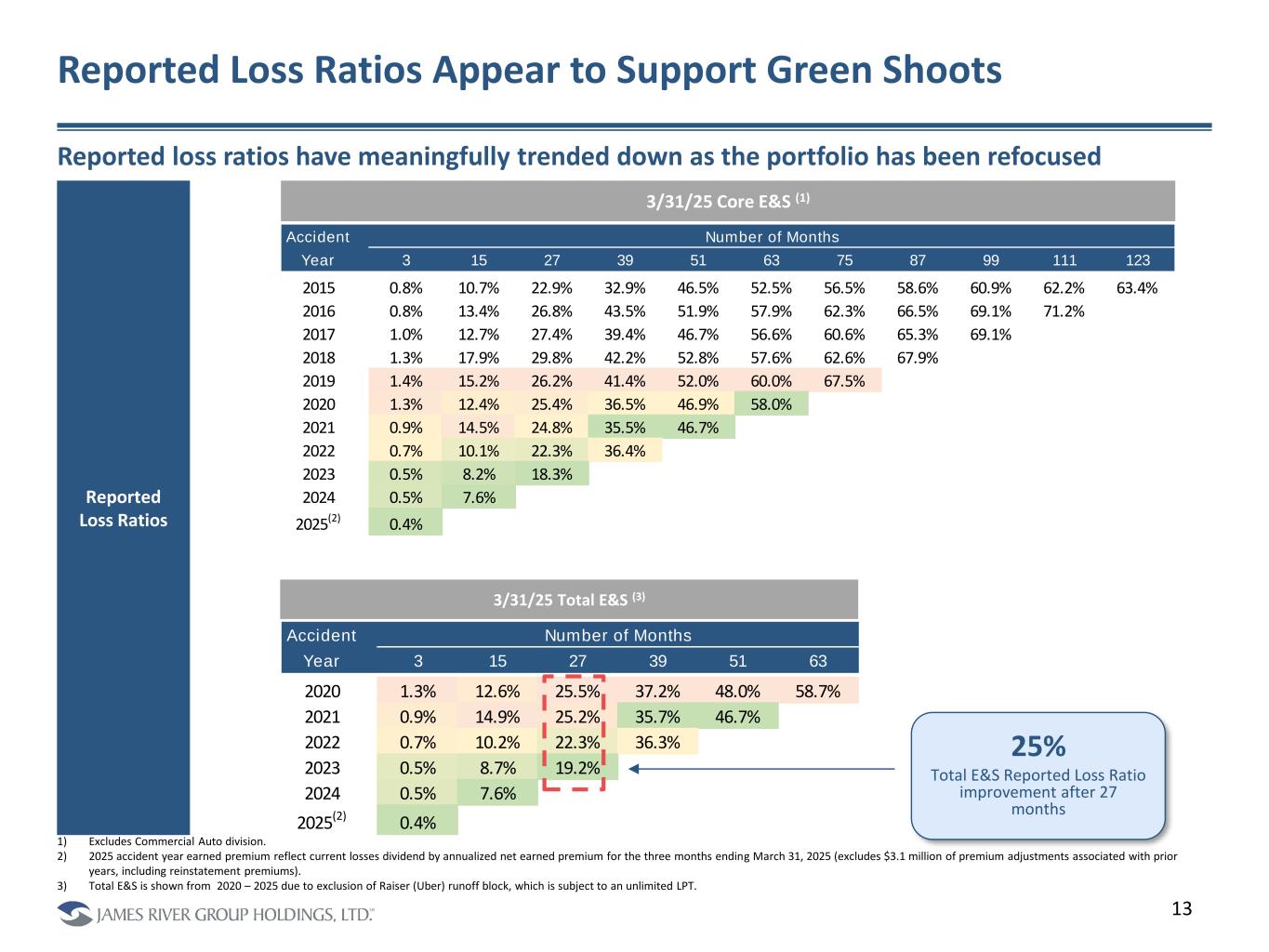 Accident Net Earned Number of Months Year Premium ($) 3 15 27 39 51 63 2020 $415.2 824 4,031 5,073 5,653 6,120 6,848 2021 494.2 683 4,150 5,081 5,597 5,971 2022 559.5 560 3,698 4,796 5,392 2023 626.0 458 3,229 4,201 2024 579.0 432 2,768 2025(3) 140.1 320 12 3/31/25 Total E&S (2) 3/31/25 Core E&S (1) Reported Claims Counts $ in Millions and all premiums are gross of prior year reinsurance adjustments (1)Excludes Commercial Auto division. (2) Total E&S is shown from 2020 – 2025 due to exclusion of Raiser (Uber) runoff block, which is subject to an unlimited LPT. 3) 2025 Net Earned Premium reflective of premium earned during the first quarter of 2025 (excludes $3.1 million of premium adjustments associated with prior years, including reinstatement premiums). Claims Counts Show a Pervasive, Declining Trend Accident Net Earned Number of Months Year Premium ($) 3 15 27 39 51 63 75 87 99 111 123 2015 $186.9 284 1,799 2,120 2,310 2,433 2,518 2,569 2,609 2,636 2,672 2,703 2016 200.2 361 2,130 2,534 2,782 2,920 3,004 3,078 3,131 3,251 3,325 2017 213.7 370 2,295 2,683 2,929 3,094 3,176 3,232 3,284 3,347 2018 241.3 549 3,562 4,042 4,332 4,497 4,576 4,759 4,962 2019 302.7 794 4,424 5,062 5,525 5,864 6,153 6,441 2020 385.2 729 3,619 4,609 5,166 5,623 6,349 2021 458.6 572 3,459 4,350 4,856 5,224 2022 521.1 468 3,229 4,291 4,861 2023 597.7 401 2,958 3,892 2024 560.5 395 2,545 2025(3) 135.3 276 17% Total E&S Claim Count improvement after 27 months Reported claim counts have declined significantly despite meaningful NEP increases since 2020