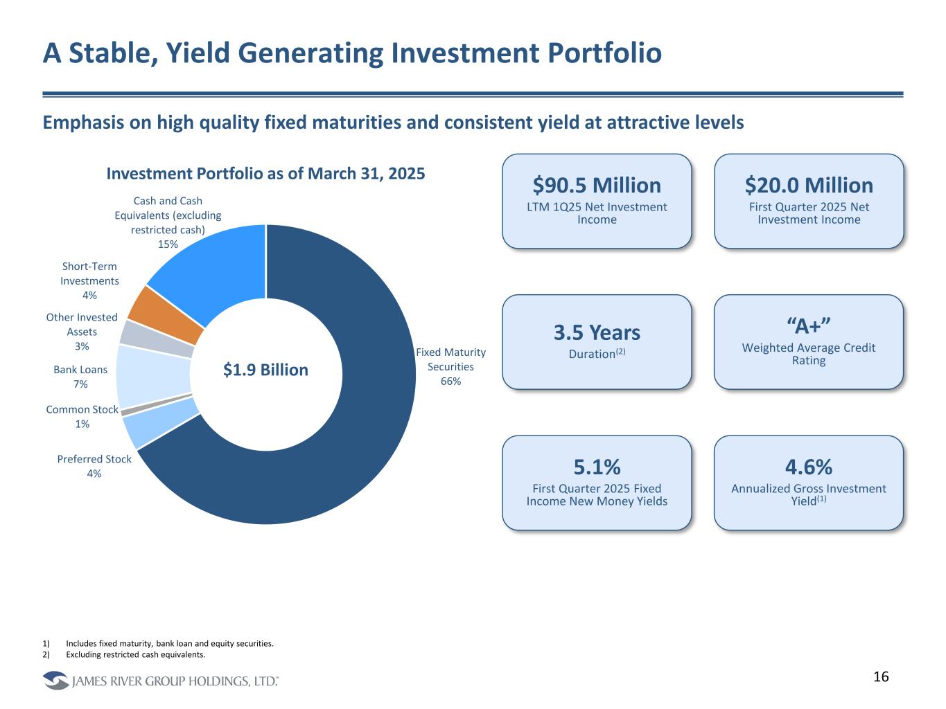 Capital Position 15 Our strong balance sheet enables us to continue to capitalize on an extremely attractive P&C market Commentary • Strong balance sheet with low financial and operating leverage, high-quality investments, and highly rated reinsurers. • Recent strategic actions taken have added significant common equity and adverse development capacity. • Well positioned for profitable growth, driving stable and compelling returns on average tangible common equity. • Completed equity capital raise and converted a portion of Series A Preferred shares to common stock during 4Q24. • Healthy operating and financial leverage ratios leave significant capacity for future expansion. $ and shares in millions, except per share figures. (1) Excluding restricted cash equivalents. (2) Leverage ratio, in accordance with the Company’s credit agreements, is calculated as adjusted consolidated debt / total capital. Adjusted consolidated debt treats hybrid securities as equity capital up to 15% of total capitalization. Total capital is defined as total debt plus tangible equity excluding accumulated other comprehensive income. (3) Net written premium presented on an LTM basis as of the period indicated. Balance Sheet as of: 1Q 2024 2Q 2024 3Q 2024 4Q 2024 1Q 2025 Assets Total Invested Assets $1,706.8 $1,490.1 $1,575.1 $1,552.4 $1,623.2 Cash and Cash Equivalents (1) 305.5 672.5 359.8 362.3 279.4 Reinsurance Recoverables 1,520.2 1,578.3 2,072.6 2,098.1 2,111.9 Goodwill and Intangible Assets 214.6 214.5 214.4 214.3 214.2 Total Assets 5,250.9 4,738.2 4,958.7 5,007.1 4,949.0 Liabilities and Shareholders' Equity Reserve for Losses and LAE 2,661.9 2,720.2 3,001.9 3,084.4 3,081.5 Deferred Reinsurance Gain 16.7 13.0 31.0 58.0 56.0 Senior Debt 222.3 200.8 200.8 200.8 225.8 Junior Subordinated Debt 104.1 104.1 104.1 104.1 104.1 Total Debt 326.4 304.9 304.9 304.9 329.9 Accumulated Other Comprehensive Income (AOCI) (71.5) (73.9) (42.8) (70.0) (55.7) Series A Redeemable Preferred Shares 144.9 144.9 144.9 133.1 133.1 Shareholders' Equity 539.5 541.8 530.3 460.9 484.5 Tangible Equity 486.6 485.3 491.9 437.7 459.4 Tangible Equity (Leverage Ratio) 469.9 472.2 460.9 379.7 403.4 Tangible Common Equity 341.7 340.4 347.0 304.6 326.3 Leverage Metrics Leverage Ratio (2) 26% 24% 25% 27% 29% Net Written Premium / Tangible Equity (3) 1.36x 1.31x 1.30x 1.33x 1.24x Per Share Metrics Shareholders’ Equity per Share $14.27 $14.32 $14.02 $10.10 $10.56 Tangible Equity per Share $10.92 $10.86 $11.01 $7.40 $7.73 Tangible Common Equity per Share $9.03 $9.00 $9.17 $6.67 $7.11