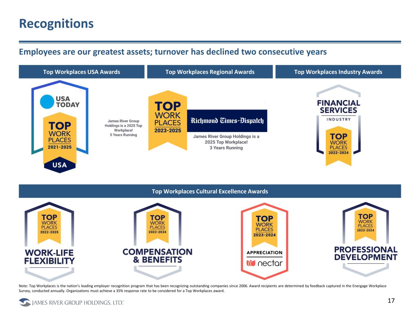 A Stable, Yield Generating Investment Portfolio 16 Investment Portfolio as of March 31, 2025 1) Includes fixed maturity, bank loan and equity securities. 2) Excluding restricted cash equivalents. “A+” Weighted Average Credit Rating 3.5 Years Duration(2) $20.0 Million First Quarter 2025 Net Investment Income 4.6% Annualized Gross Investment Yield(1) 5.1% First Quarter 2025 Fixed Income New Money Yields $90.5 Million LTM 1Q25 Net Investment Income Fixed Maturity Securities 66% Preferred Stock 4% Common Stock 1% Bank Loans 7% Other Invested Assets 3% Short-Term Investments 4% Cash and Cash Equivalents (excluding restricted cash) 15% $1.9 Billion Emphasis on high quality fixed maturities and consistent yield at attractive levels