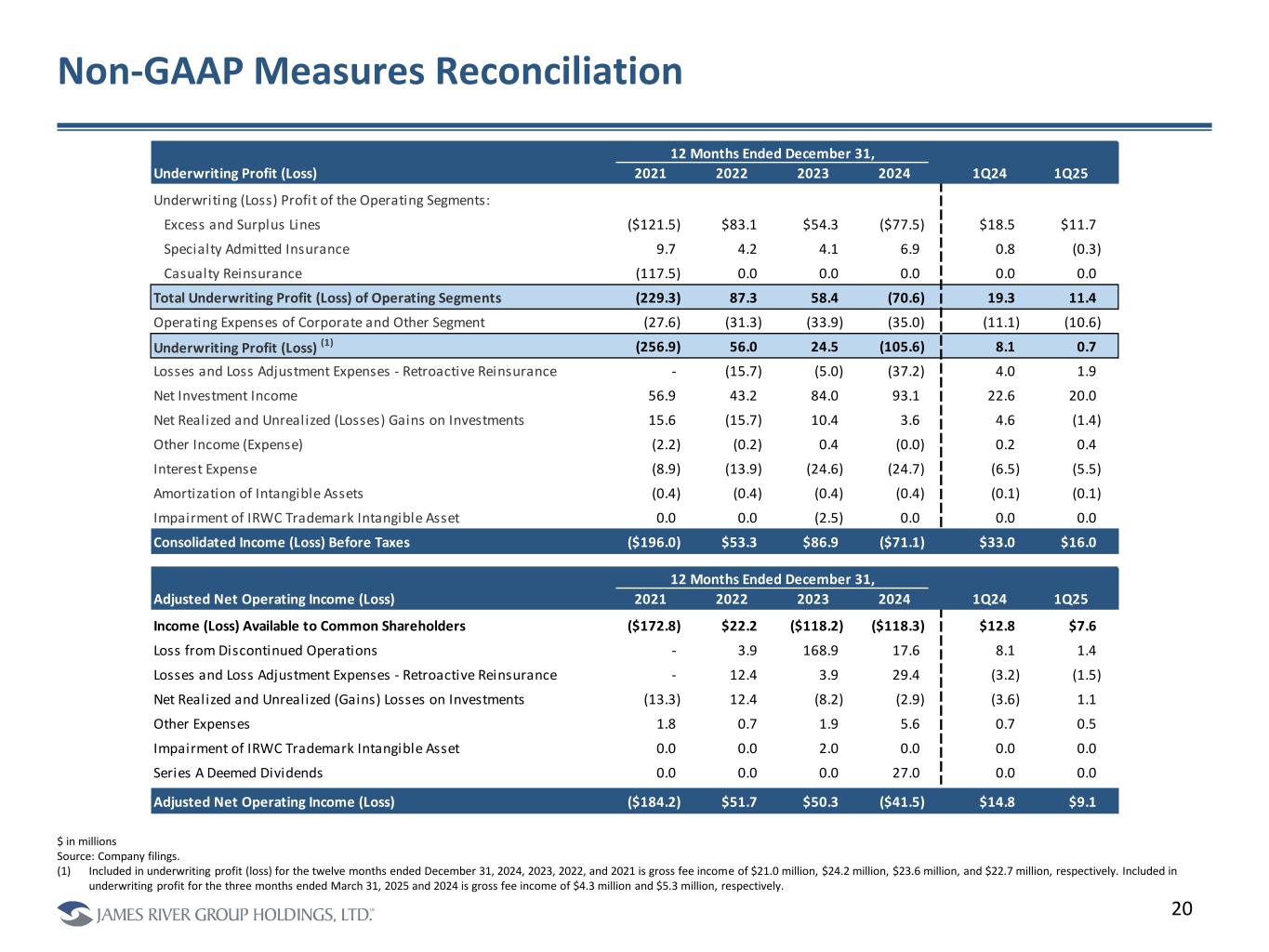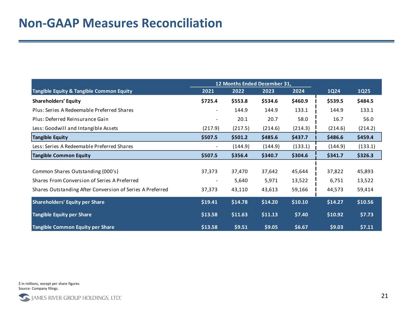 Non-GAAP Measures Reconciliation 20 $ in millions Source: Company filings. (1) Included in underwriting profit (loss) for the twelve months ended December 31, 2024, 2023, 2022, and 2021 is gross fee income of $21.0 million, $24.2 million, $23.6 million, and $22.7 million, respectively. Included in underwriting profit for the three months ended March 31, 2025 and 2024 is gross fee income of $4.3 million and $5.3 million, respectively. 12 Months Ended December 31, Underwriting Profit (Loss) 2021 2022 2023 2024 1Q24 1Q255 Underwriting (Loss) Profit of the Operating Segments: Excess and Surplus Lines ($121.5) $83.1 $54.3 ($77.5) $18.5 $11.7 Specialty Admitted Insurance 9.7 4.2 4.1 6.9 0.8 (0.3) Casualty Reinsurance (117.5) 0.0 0.0 0.0 0.0 0.0 Total Underwriting Profit (Loss) of Operating Segments (229.3) 87.3 58.4 (70.6) 19.3 11.4 Operating Expenses of Corporate and Other Segment (27.6) (31.3) (33.9) (35.0) (11.1) (10.6) Underwriting Profit (Loss) (1) (256.9) 56.0 24.5 (105.6) 8.1 0.7 Losses and Loss Adjustment Expenses - Retroactive Reinsurance - (15.7) (5.0) (37.2) 4.0 1.9 Net Investment Income 56.9 43.2 84.0 93.1 22.6 20.0 Net Realized and Unrealized (Losses) Gains on Investments 15.6 (15.7) 10.4 3.6 4.6 (1.4) Other Income (Expense) (2.2) (0.2) 0.4 (0.0) 0.2 0.4 Interest Expense (8.9) (13.9) (24.6) (24.7) (6.5) (5.5) Amortization of Intangible Assets (0.4) (0.4) (0.4) (0.4) (0.1) (0.1) Impairment of IRWC Trademark Intangible Asset 0.0 0.0 (2.5) 0.0 0.0 0.0 Consolidated Income (Loss) Before Taxes ($196.0) $53.3 $86.9 ($71.1) $33.0 $16.0 12 Months Ended December 31, Adjusted Net Operating Income (Loss) 2021 2022 2023 2024 1Q24 1Q25 Income (Loss) Available to Common Shareholders ($172.8) $22.2 ($118.2) ($118.3) $12.8 $7.6 Loss from Discontinued Operations - 3.9 168.9 17.6 8.1 1.4 Losses and Loss Adjustment Expenses - Retroactive Reinsurance - 12.4 3.9 29.4 (3.2) (1.5) Net Realized and Unrealized (Gains) Losses on Investments (13.3) 12.4 (8.2) (2.9) (3.6) 1.1 Other Expenses 1.8 0.7 1.9 5.6 0.7 0.5 Impairment of IRWC Trademark Intangible Asset 0.0 0.0 2.0 0.0 0.0 0.0 Series A Deemed Dividends 0.0 0.0 0.0 27.0 0.0 0.0 Adjusted Net Operating Income (Loss) ($184.2) $51.7 $50.3 ($41.5) $14.8 $9.1