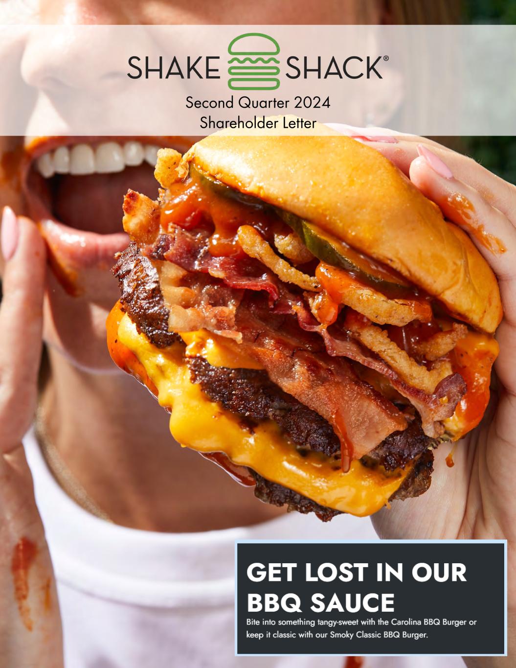 4 TO O U R S H A R E H O L D E R S We are proud of the progress that we have shown in the first half of the year and are on a solid path to accomplish our 2024 Strategic Priorities and achieve our FY2024 guidance. Our execution against our 2024 Strategic Priorities, including operational focus and investments in marketing and culinary offerings, drove many record highs for our business in the quarter, including the highest Total revenue, System-wide sales, Restaurant-level profit, Adjusted EBITDA, and free cash flow. We grew SSS by 4% and Total revenue by16.4% year-over-year. We generated 100 bps of Restaurant-level profit margin expansion to 22.0%, marking the highest quarterly result since 2019. Here at Shake Shack, we pride ourselves on food that raises the bar against traditional fast food options, with premium, no antibiotic and no added hormone proteins. We use cane sugar instead of corn syrup, and we use cage-free eggs and fresh dairy in our custard. These are critical investments which are expensive but we do it because it’s worth it for our guests. We are sharing our premium ingredient story through new packaging and we are launching more messaging around this key differentiator in our Shacks and with broader advertising initiatives. As an example, we use no antibiotics / no-added hormone chicken in our Chicken Shack sandwich which is a premium to many competitor offerings. We leaned into that ingredient messaging in April and drove a strong boost in chicken sandwich sales and broader brand awareness. We also stayed true to our culinary roots, with a Summer BBQ limited time offering featuring BBQ spiced fries and two premium Summer BBQ burgers, including one that features a mustard-based BBQ sauce and hand battered fried pickles. In addition to our core commitments to premium ingredients and culinary offerings, we are focused on delivering a great and consistent guest experience, with hospitality and consistency being at the front of our minds. We have invested more in hiring and training to make sure that we are building strong teams and showing progress against our goal to provide our guests with the order time experience and accuracy that they expect. Improving the guest experience and raising our brand awareness are two critical drivers of sustainable sales growth and higher frequency over the long term. The results of the first half place us on a solid path to execute on our FY2024 guidance to grow Total revenue by 14% – 15% year-over-year to ~$1.24b – $1.25b, expand Restaurant-level profit margin to 20.6% – 21.0%, grow Adjusted EBITDA by 25% - 29% year-over-year to $165m – $170m, and achieve positive free cash flow for the year – a first since 2017. August 1, 2024 The Terminal, Pennsylvania