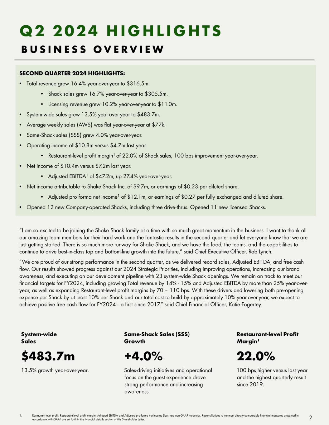 “I am so excited to be joining the Shake Shack family at a time with so much great momentum in the business. I want to thank all our amazing team members for their hard work and the fantastic results in the second quarter and let everyone know that we are just getting started. There is so much more runway for Shake Shack, and we have the food, the teams, and the capabilities to continue to drive best-in-class top and bottom-line growth into the future,” said Chief Executive Officer, Rob Lynch. “We are proud of our strong performance in the second quarter, as we delivered record sales, Adjusted EBITDA, and free cash flow. Our results showed progress against our 2024 Strategic Priorities, including improving operations, increasing our brand awareness, and executing on our development pipeline with 23 system-wide Shack openings. We remain on track to meet our financial targets for FY2024, including growing Total revenue by 14% - 15% and Adjusted EBITDA by more than 25% year-over- year, as well as expanding Restaurant-level profit margins by 70 – 110 bps. With these drivers and lowering both pre-opening expense per Shack by at least 10% per Shack and our total cost to build by approximately 10% year-over-year, we expect to achieve positive free cash flow for FY2024– a first since 2017,” said Chief Financial Officer, Katie Fogertey. Q 2 2 0 2 4 H I G H L I G H T S System-wide Sales $483.7m 13.5% growth year-over-year. Same-Shack Sales (SSS) Growth +4.0% Sales-driving initiatives and operational focus on the guest experience drove strong performance and increasing awareness. Restaurant-level Profit Margin1 22.0% 100 bps higher versus last year and the highest quarterly result since 2019. 2 B U S I N E S S O V E R V I E W 1. Restaurant-level profit, Restaurant-level profit margin, Adjusted EBITDA and Adjusted pro forma net income (loss) are non-GAAP measures. Reconciliations to the most directly comparable financial measures presented in accordance with GAAP are set forth in the financial details section of this Shareholder Letter. SECOND QUARTER 2024 HIGHLIGHTS: • Total revenue grew 16.4% year-over-year to $316.5m. • Shack sales grew 16.7% year-over-year to $305.5m. • Licensing revenue grew 10.2% year-over-year to $11.0m. • System-wide sales grew 13.5% year-over-year to $483.7m. • Average weekly sales (AWS) was flat year-over-year at $77k. • Same-Shack sales (SSS) grew 4.0% year-over-year. • Operating income of $10.8m versus $4.7m last year. • Restaurant-level profit margin1 of 22.0% of Shack sales, 100 bps improvement year-over-year. • Net income of $10.4m versus $7.2m last year. • Adjusted EBITDA1 of $47.2m, up 27.4% year-over-year. • Net income attributable to Shake Shack Inc. of $9.7m, or earnings of $0.23 per diluted share. • Adjusted pro forma net income1 of $12.1m, or earnings of $0.27 per fully exchanged and diluted share. • Opened 12 new Company-operated Shacks, including three drive-thrus. Opened 11 new licensed Shacks.