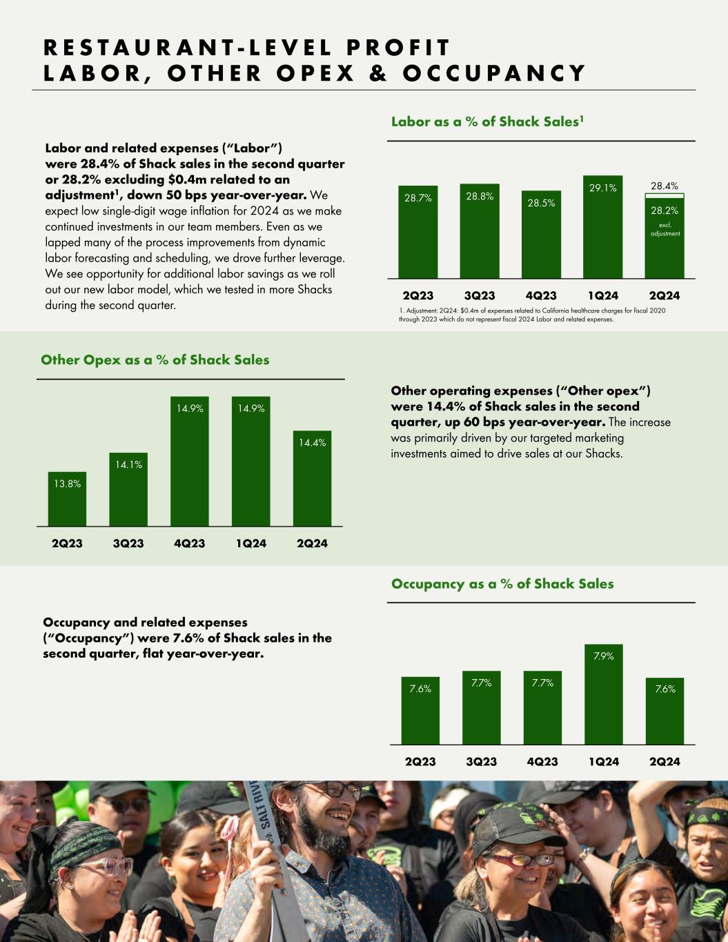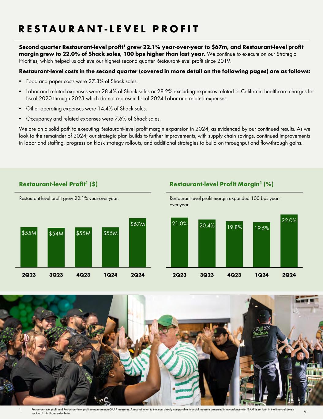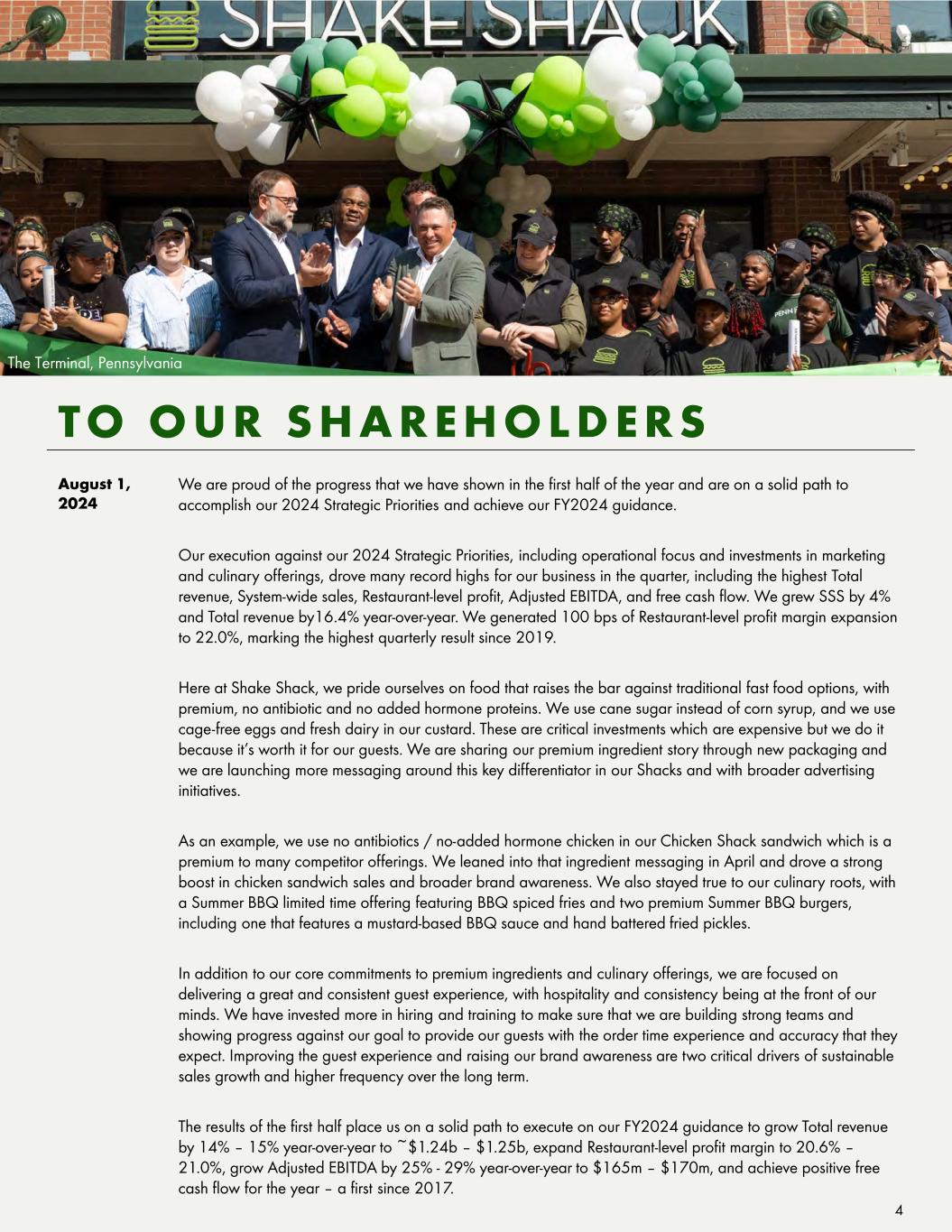 $77K $74K $76K $73K $77K 2Q23 3Q23 4Q23 1Q24 2Q24 $272M $276M $286M $291M $316M 2Q23 3Q23 4Q23 1Q24 2Q24 471 495 518 525 547 2Q23 3Q23 4Q23 1Q24 2Q24 $426M $439M $442M $443M $484M 2Q23 3Q23 4Q23 1Q24 2Q24 1. Restaurant-level profit, Restaurant-level profit margin, and Adjusted EBITDA are non-GAAP measures. Reconciliations to the most directly comparable financial measures presented in accordance with GAAP are set forth in the financial details section of this Shareholder Letter. The Company revised its definition of Adjusted EBITDA in Q1 2023 to exclude deferred lease costs and executive transition costs as adjustments to the measure. Previously reported periods have been revised to conform to the current period presentation. Total Revenue Adjusted EBITDA Average Weekly Sales (AWS) System-wide Shack Count System-wide Sales Q 2 2 0 2 4 H I G H L I G H T S S A M E - S H A C K S A L E S G R E W 4 % I N T H E Q U A R T E R W I T H C O N T I N U E D R E S T A U R A N T - L E V E L P R O F I T M A R G I N E X P A N S I O N O F 1 0 0 B P S Y O Y 3 Total revenue grew 16.4% year-over-year. System-wide sales grew 13.5% year-over-year. AWS trends in 2Q24 were stronger than prior year seasonality patterns. System-wide unit count grew 16.1% year-over-year, including versus 2Q23: • 41 new Company-operated Shack openings. • 35 net new licensed Shack openings. $37M $36M $31M $36M $47M 2Q23 3Q23 4Q23 1Q24 2Q24 Adjusted EBITDA grew 27.4% year-over-year to 14.9% of Total revenue, a marked improvement versus 13.6% of Total revenue in 2Q23. $55M $54M $55M $55M $67M 21.0% 20.4% 19.8% 19.5% 22.0% 18.0% 18.5% 19.0% 19.5% 20.0% 20.5% 21.0% 21.5% 22.0% 22.5% $10.0 $20.0 $30.0 $40.0 $50.0 $60.0 $70.0 2Q23 3Q23 4Q23 1Q24 2Q24 Restaurant-level Profit1 % label indicates Restaurant-level profit margin.1 Restaurant-level profit grew 22.1% year-over-year.