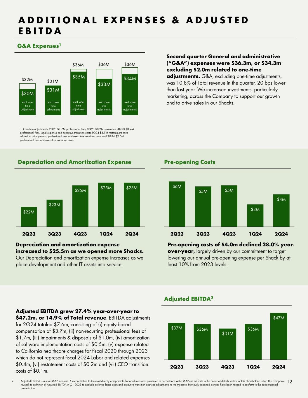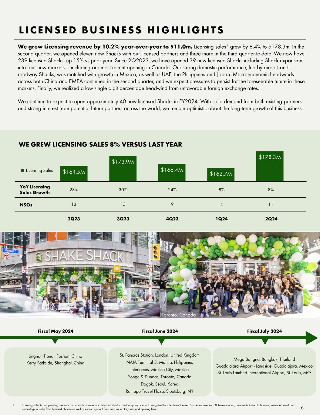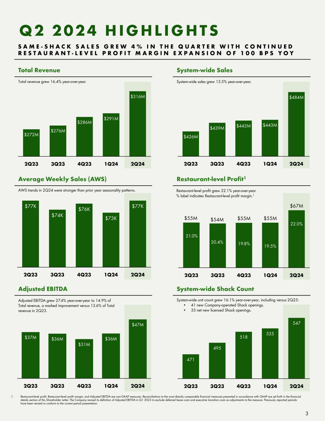 $77K $74K $76K $73K $77K 2Q23 3Q23 4Q23 1Q24 2Q24 $272M $276M $286M $291M $316M 2Q23 3Q23 4Q23 1Q24 2Q24 471 495 518 525 547 2Q23 3Q23 4Q23 1Q24 2Q24 $426M $439M $442M $443M $484M 2Q23 3Q23 4Q23 1Q24 2Q24 1. Restaurant-level profit, Restaurant-level profit margin, and Adjusted EBITDA are non-GAAP measures. Reconciliations to the most directly comparable financial measures presented in accordance with GAAP are set forth in the financial details section of this Shareholder Letter. The Company revised its definition of Adjusted EBITDA in Q1 2023 to exclude deferred lease costs and executive transition costs as adjustments to the measure. Previously reported periods have been revised to conform to the current period presentation. Total Revenue Adjusted EBITDA Average Weekly Sales (AWS) System-wide Shack Count System-wide Sales Q 2 2 0 2 4 H I G H L I G H T S S A M E - S H A C K S A L E S G R E W 4 % I N T H E Q U A R T E R W I T H C O N T I N U E D R E S T A U R A N T - L E V E L P R O F I T M A R G I N E X P A N S I O N O F 1 0 0 B P S Y O Y 3 Total revenue grew 16.4% year-over-year. System-wide sales grew 13.5% year-over-year. AWS trends in 2Q24 were stronger than prior year seasonality patterns. System-wide unit count grew 16.1% year-over-year, including versus 2Q23: • 41 new Company-operated Shack openings. • 35 net new licensed Shack openings. $37M $36M $31M $36M $47M 2Q23 3Q23 4Q23 1Q24 2Q24 Adjusted EBITDA grew 27.4% year-over-year to 14.9% of Total revenue, a marked improvement versus 13.6% of Total revenue in 2Q23. $55M $54M $55M $55M $67M 21.0% 20.4% 19.8% 19.5% 22.0% 18.0% 18.5% 19.0% 19.5% 20.0% 20.5% 21.0% 21.5% 22.0% 22.5% $10.0 $20.0 $30.0 $40.0 $50.0 $60.0 $70.0 2Q23 3Q23 4Q23 1Q24 2Q24 Restaurant-level Profit1 % label indicates Restaurant-level profit margin.1 Restaurant-level profit grew 22.1% year-over-year.