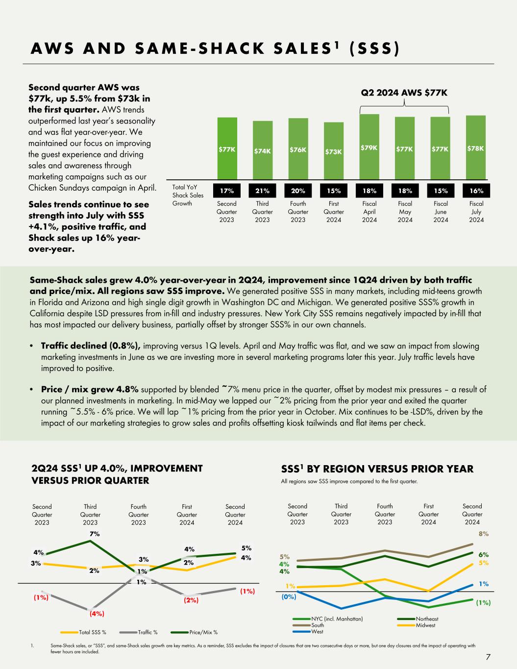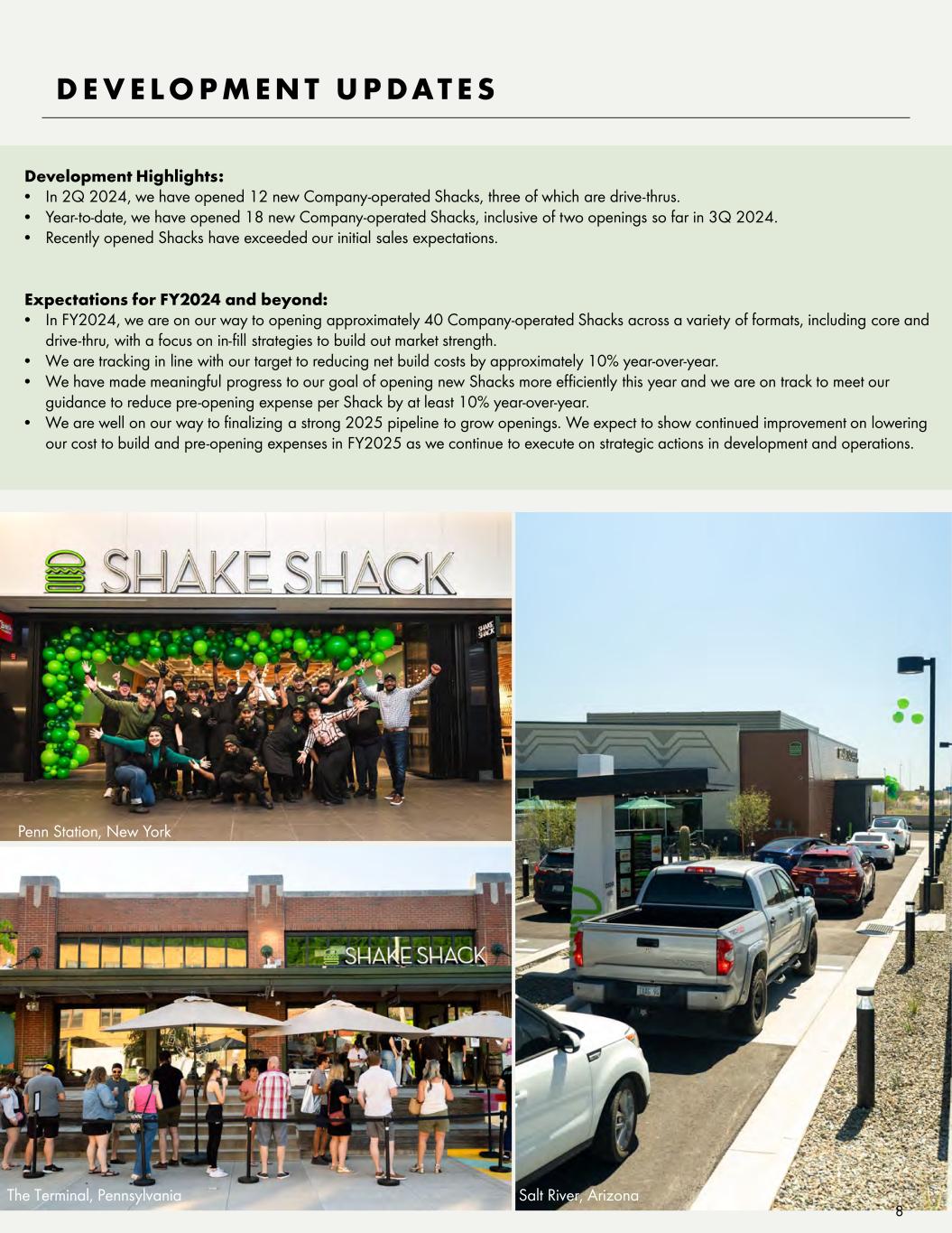 3% 2% 3% 2% 4% (1%) (4%) 1% (2%) (1%) 4% 7% 1% 4% 5% Second Quarter 2023 Third Quarter 2023 Fourth Quarter 2023 First Quarter 2024 Second Quarter 2024 Total SSS % Traffic % Price/Mix % Same-Shack sales grew 4.0% year-over-year in 2Q24, improvement since 1Q24 driven by both traffic and price/mix. All regions saw SSS improve. We generated positive SSS in many markets, including mid-teens growth in Florida and Arizona and high single digit growth in Washington DC and Michigan. We generated positive SSS% growth in California despite LSD pressures from in-fill and industry pressures. New York City SSS remains negatively impacted by in-fill that has most impacted our delivery business, partially offset by stronger SSS% in our own channels. • Traffic declined (0.8%), improving versus 1Q levels. April and May traffic was flat, and we saw an impact from slowing marketing investments in June as we are investing more in several marketing programs later this year. July traffic levels have improved to positive. • Price / mix grew 4.8% supported by blended ~7% menu price in the quarter, offset by modest mix pressures – a result of our planned investments in marketing. In mid-May we lapped our ~2% pricing from the prior year and exited the quarter running ~5.5% - 6% price. We will lap ~1% pricing from the prior year in October. Mix continues to be -LSD%, driven by the impact of our marketing strategies to grow sales and profits offsetting kiosk tailwinds and flat items per check. 2Q24 SSS1 UP 4.0%, IMPROVEMENT VERSUS PRIOR QUARTER AW S A N D S A M E - S H A C K S A L E S 1 ( S S S ) 7 1. Same-Shack sales, or “SSS”, and same-Shack sales growth are key metrics. As a reminder, SSS excludes the impact of closures that are two consecutive days or more, but one day closures and the impact of operating with fewer hours are included. SSS1 BY REGION VERSUS PRIOR YEAR 4% (1%) 4% 6% 5% 8% 1% 5% (0%) 1% Second Quarter 2023 Third Quarter 2023 Fourth Quarter 2023 First Quarter 2024 Second Quarter 2024 NYC (incl. Manhattan) Northeast South Midwest West Second quarter AWS was $77k, up 5.5% from $73k in the first quarter. AWS trends outperformed last year’s seasonality and was flat year-over-year. We maintained our focus on improving the guest experience and driving sales and awareness through marketing campaigns such as our Chicken Sundays campaign in April. $77K $74K $76K $73K $79K $77K $77K $78K Q2 2024 AWS $77K Total YoY Shack Sales Growth Fiscal June 2024 17% Fourth Quarter 2023 15% 18% First Quarter 2024 21% Second Quarter 2023 20% Third Quarter 2023 15% Fiscal May 2024 18% Fiscal April 2024 Fiscal July 2024 16% Sales trends continue to see strength into July with SSS +4.1%, positive traffic, and Shack sales up 16% year- over-year. All regions saw SSS improve compared to the first quarter.