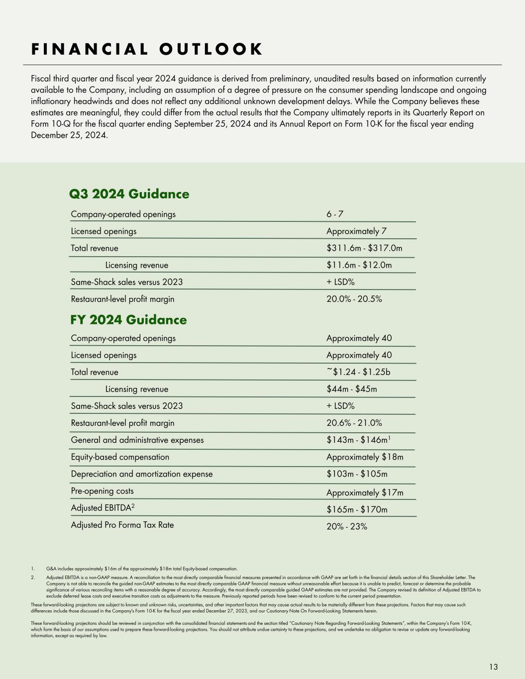 $30M $31M $35M $33M $34M G&A Expenses1 Second quarter General and administrative (“G&A”) expenses were $36.3m, or $34.3m excluding $2.0m related to one-time adjustments. G&A, excluding one-time adjustments, was 10.8% of Total revenue in the quarter, 20 bps lower than last year. We increased investments, particularly marketing, across the Company to support our growth and to drive sales in our Shacks. $22M $23M $25M $25M $25M 2Q23 3Q23 4Q23 1Q24 2Q24 Depreciation and Amortization Expense $6M $5M $5M $3M $4M 2Q23 3Q23 4Q23 1Q24 2Q24 Pre-opening Costs A D D I T I O N A L E X P E N S E S & A D J U S T E D E B I T D A 2. Adjusted EBITDA is a non-GAAP measure. A reconciliation to the most directly comparable financial measures presented in accordance with GAAP are set forth in the financial details section of this Shareholder Letter. The Company revised its definition of Adjusted EBITDA in Q1 2023 to exclude deferred lease costs and executive transition costs as adjustments to the measure. Previously reported periods have been revised to conform to the current period presentation. Adjusted EBITDA grew 27.4% year-over-year to $47.2m, or 14.9% of Total revenue. EBITDA adjustments for 2Q24 totaled $7.6m, consisting of (i) equity-based compensation of $3.7m, (ii) non-recurring professional fees of $1.7m, (iii) impairments & disposals of $1.0m, (iv) amortization of software implementation costs of $0.5m, (v) expense related to California healthcare charges for fiscal 2020 through 2023 which do not represent fiscal 2024 Labor and related expenses $0.4m, (vi) restatement costs of $0.2m and (vii) CEO transition costs of $0.1m. $37M $36M $31M $36M $47M 2Q23 3Q23 4Q23 1Q24 2Q24 Adjusted EBITDA2 12 1. One-time adjustments: 2Q23 $1.7M professional fees, 3Q23 $0.2M severance, 4Q23 $0.9M professional fees, legal expense and executive transition costs,1Q24 $3.1M restatement costs related to prior periods, professional fees and executive transition costs and 2Q24 $2.0M professional fees and executive transition costs. excl. one- time adjustments $31M $36M Depreciation and amortization expense increased to $25.5m as we opened more Shacks. Our Depreciation and amortization expense increases as we place development and other IT assets into service. Pre-opening costs of $4.0m declined 28.0% year- over-year, largely driven by our commitment to target lowering our annual pre-opening expense per Shack by at least 10% from 2023 levels. $36M $32M $36M excl. one- time adjustments excl. one- time adjustments excl. one- time adjustments excl. one- time adjustments