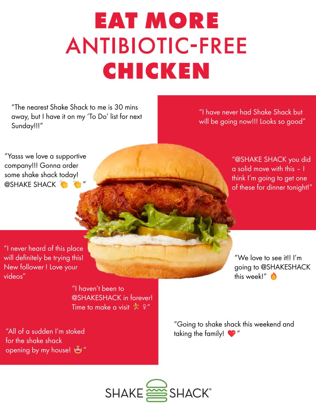 “Going to shake shack this weekend and taking the family! ” “The nearest Shake Shack to me is 30 mins away, but I have it on my ‘To Do’ list for next Sunday!!!” “I have never had Shake Shack but will be going now!!! Looks so good” “I never heard of this place will definitely be trying this! New follower ! Love your videos” “@SHAKE SHACK you did a solid move with this – I think I’m going to get one of these for dinner tonight!” “Yasss we love a supportive company!!! Gonna order some shake shack today! @SHAKE SHACK ” “We love to see it!! I’m going to @SHAKESHACK this week!” “I haven’t been to @SHAKESHACK in forever! Time to make a visit ” “All of a sudden I’m stoked for the shake shack opening by my house! ”