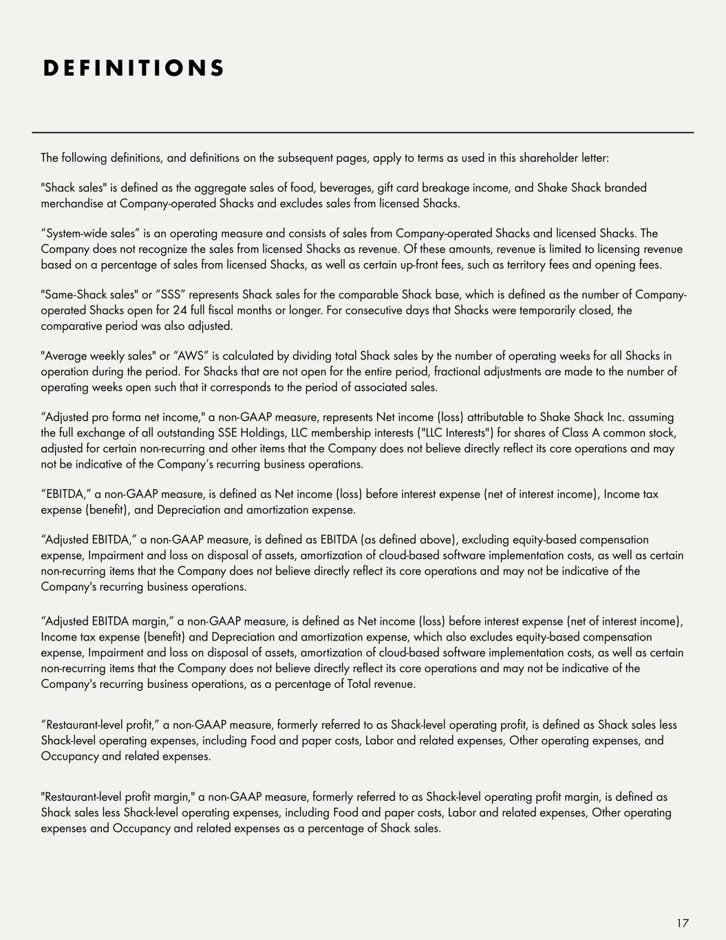 D E F I N I T I O N S 17 The following definitions, and definitions on the subsequent pages, apply to terms as used in this shareholder letter: "Shack sales" is defined as the aggregate sales of food, beverages, gift card breakage income, and Shake Shack branded merchandise at Company-operated Shacks and excludes sales from licensed Shacks. “System-wide sales” is an operating measure and consists of sales from Company-operated Shacks and licensed Shacks. The Company does not recognize the sales from licensed Shacks as revenue. Of these amounts, revenue is limited to licensing revenue based on a percentage of sales from licensed Shacks, as well as certain up-front fees, such as territory fees and opening fees. "Same-Shack sales" or “SSS” represents Shack sales for the comparable Shack base, which is defined as the number of Company- operated Shacks open for 24 full fiscal months or longer. For consecutive days that Shacks were temporarily closed, the comparative period was also adjusted. "Average weekly sales" or “AWS” is calculated by dividing total Shack sales by the number of operating weeks for all Shacks in operation during the period. For Shacks that are not open for the entire period, fractional adjustments are made to the number of operating weeks open such that it corresponds to the period of associated sales. “Adjusted pro forma net income," a non-GAAP measure, represents Net income (loss) attributable to Shake Shack Inc. assuming the full exchange of all outstanding SSE Holdings, LLC membership interests ("LLC Interests") for shares of Class A common stock, adjusted for certain non-recurring and other items that the Company does not believe directly reflect its core operations and may not be indicative of the Company’s recurring business operations. “EBITDA,” a non-GAAP measure, is defined as Net income (loss) before interest expense (net of interest income), Income tax expense (benefit), and Depreciation and amortization expense. “Adjusted EBITDA,” a non-GAAP measure, is defined as EBITDA (as defined above), excluding equity-based compensation expense, Impairment and loss on disposal of assets, amortization of cloud-based software implementation costs, as well as certain non-recurring items that the Company does not believe directly reflect its core operations and may not be indicative of the Company's recurring business operations. “Adjusted EBITDA margin,” a non-GAAP measure, is defined as Net income (loss) before interest expense (net of interest income), Income tax expense (benefit) and Depreciation and amortization expense, which also excludes equity-based compensation expense, Impairment and loss on disposal of assets, amortization of cloud-based software implementation costs, as well as certain non-recurring items that the Company does not believe directly reflect its core operations and may not be indicative of the Company's recurring business operations, as a percentage of Total revenue. “Restaurant-level profit,” a non-GAAP measure, formerly referred to as Shack-level operating profit, is defined as Shack sales less Shack-level operating expenses, including Food and paper costs, Labor and related expenses, Other operating expenses, and Occupancy and related expenses. "Restaurant-level profit margin," a non-GAAP measure, formerly referred to as Shack-level operating profit margin, is defined as Shack sales less Shack-level operating expenses, including Food and paper costs, Labor and related expenses, Other operating expenses and Occupancy and related expenses as a percentage of Shack sales.