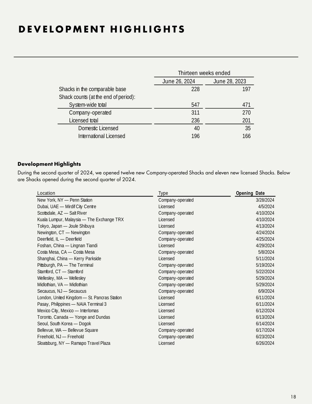 June 26, 2024 June 28, 2023 Shacks in the comparable base 228 197 Shack counts (at the end of period): System-wide total 547 471 Company-operated 311 270 Licensed total 236 201 Domestic Licensed 40 35 International Licensed 196 166 Thirteen weeks ended D E V E L O P M E N T H I G H L I G H T S 18 Development Highlights During the second quarter of 2024, we opened twelve new Company-operated Shacks and eleven new licensed Shacks. Below are Shacks opened during the second quarter of 2024. Location Type Opening Date New York, NY — Penn Station Company-operated 3/28/2024 Dubai, UAE — Mirdif City Centre Licensed 4/5/2024 Scottsdale, AZ — Salt River Company-operated 4/10/2024 Kuala Lumpur, Malaysia — The Exchange TRX Licensed 4/10/2024 Tokyo, Japan — Joule Shibuya Licensed 4/13/2024 Newington, CT — Newington Company-operated 4/24/2024 Deerfield, IL — Deerfield Company-operated 4/25/2024 Foshan, China — Lingnan Tiandi Licensed 4/29/2024 Costa Mesa, CA — Costa Mesa Company-operated 5/8/2024 Shanghai, China — Kerry Parkside Licensed 5/11/2024 Pittsburgh, PA — The Terminal Company-operated 5/19/2024 Stamford, CT — Stamford Company-operated 5/22/2024 Wellesley, MA — Wellesley Company-operated 5/29/2024 Midlothian, VA — Midlothian Company-operated 5/29/2024 Secaucus, NJ — Secaucus Company-operated 6/9/2024 London, United Kingdom — St. Pancras Station Licensed 6/11/2024 Pasay, Philippines — NAIA Terminal 3 Licensed 6/11/2024 Mexico City, Mexico — Interlomas Licensed 6/12/2024 Toronto, Canada — Yonge and Dundas Licensed 6/13/2024 Seoul, South Korea — Dogok Licensed 6/14/2024 Bellevue, WA — Bellevue Square Company-operated 6/17/2024 Freehold, NJ — Freehold Company-operated 6/23/2024 Sloatsburg, NY — Ramapo Travel Plaza Licensed 6/26/2024