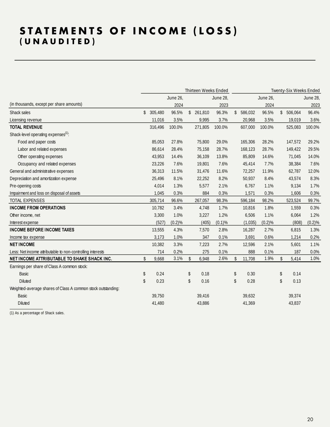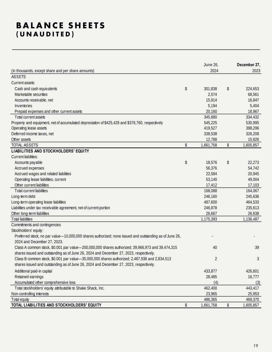 B A L A N C E S H E E T S ( U N A U D I T E D ) 19 June 26, December 27, 2024 2023 ASSETS Current assets: Cash and cash equivalents 301,838$ 224,653$ Marketable securities 2,574 68,561 Accounts receivable, net 15,914 16,847 Inventories 5,194 5,404 Prepaid expenses and other current assets 20,160 18,967 Total current assets 345,680 334,432 Property and equipment, net of accumulated depreciation of $425,428 and $376,760, respectively 545,225 530,995 Operating lease assets 419,527 398,296 Deferred income taxes, net 338,538 326,208 Other assets 12,788 15,926 TOTAL ASSETS 1,661,758$ 1,605,857$ LIABILITIES AND STOCKHOLDERS' EQUITY Current liabilities: Accounts payable 18,576$ 22,273$ Accrued expenses 56,376 54,742 Accrued wages and related liabilities 22,584 20,945 Operating lease liabilities, current 53,140 49,004 Other current liabilities 17,412 17,103 Total current liabilities 168,088 164,067 Long-term debt 246,160 245,636 Long-term operating lease liabilities 487,600 464,533 Liabilities under tax receivable agreement, net of current portion 246,878 235,613 Other long-term liabilities 26,667 26,638 Total liabilities 1,175,393 1,136,487 Commitments and contingencies Stockholders' equity: Preferred stock, no par value—10,000,000 shares authorized; none issued and outstanding as of June 26, 2024 and December 27, 2023. - - Class A common stock, $0.001 par value—200,000,000 shares authorized; 39,966,973 and 39,474,315 shares issued and outstanding as of June 26, 2024 and December 27, 2023, respectively. 40 39 Class B common stock, $0.001 par value—35,000,000 shares authorized; 2,487,936 and 2,834,513 shares issued and outstanding as of June 26, 2024 and December 27, 2023, respectively. 2 3 Additional paid-in capital 433,877 426,601 Retained earnings 28,485 16,777 Accumulated other comprehensive loss (4) (3) Total stockholders' equity attributable to Shake Shack, Inc. 462,400 443,417 Non-controlling interests 23,965 25,953 Total equity 486,365 469,370 TOTAL LIABILITIES AND STOCKHOLDERS' EQUITY 1,661,758$ 1,605,857$ (in thousands, except share and per share amounts)