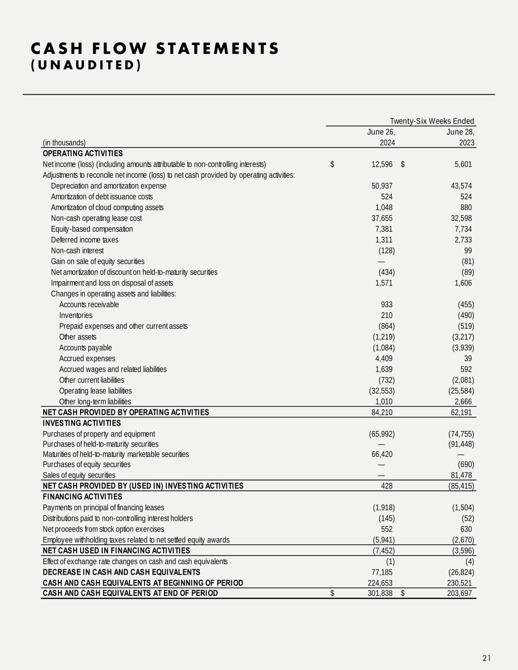C A S H F L O W S TAT E M E N T S ( U N A U D I T E D ) 21 June 26, June 28, (in thousands) 2024 2023 OPERATING ACTIVITIES Net income (loss) (including amounts attributable to non-controlling interests) 12,596$ 5,601$ Adjustments to reconcile net income (loss) to net cash provided by operating activities: Depreciation and amortization expense 50,937 43,574 Amortization of debt issuance costs 524 524 Amortization of cloud computing assets 1,048 880 Non-cash operating lease cost 37,655 32,598 Equity-based compensation 7,381 7,734 Deferred income taxes 1,311 2,733 Non-cash interest (128) 99 Gain on sale of equity securities — (81) Net amortization of discount on held-to-maturity securities (434) (89) Impairment and loss on disposal of assets 1,571 1,606 Changes in operating assets and liabilities: Accounts receivable 933 (455) Inventories 210 (490) Prepaid expenses and other current assets (864) (519) Other assets (1,219) (3,217) Accounts payable (1,084) (3,939) Accrued expenses 4,409 39 Accrued wages and related liabilities 1,639 592 Other current liabilities (732) (2,081) Operating lease liabilities (32,553) (25,584) Other long-term liabilities 1,010 2,666 NET CASH PROVIDED BY OPERATING ACTIVITIES 84,210 62,191 INVESTING ACTIVITIES Purchases of property and equipment (65,992) (74,755) Purchases of held-to-maturity securities — (91,448) Maturities of held-to-maturity marketable securities 66,420 — Purchases of equity securities — (690) Sales of equity securities — 81,478 NET CASH PROVIDED BY (USED IN) INVESTING ACTIVITIES 428 (85,415) FINANCING ACTIVITIES Payments on principal of financing leases (1,918) (1,504) Distributions paid to non-controlling interest holders (145) (52) Net proceeds from stock option exercises 552 630 Employee withholding taxes related to net settled equity awards (5,941) (2,670) NET CASH USED IN FINANCING ACTIVITIES (7,452) (3,596) Effect of exchange rate changes on cash and cash equivalents (1) (4) DECREASE IN CASH AND CASH EQUIVALENTS 77,185 (26,824) CASH AND CASH EQUIVALENTS AT BEGINNING OF PERIOD 224,653 230,521 CASH AND CASH EQUIVALENTS AT END OF PERIOD 301,838$ 203,697$ Twenty-Six Weeks Ended