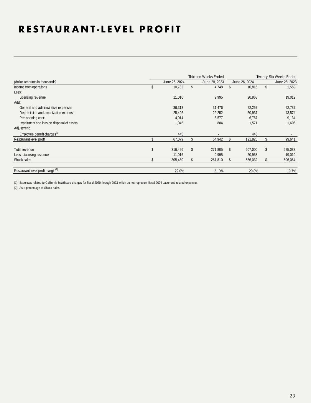 R E S TA U R A N T - L E V E L P R O F I T D E F I N I T I O N S 22 Restaurant-Level Profit “Restaurant-level profit,” a non-GAAP measure, formerly referred to as Shack-level operating profit, is defined as Shack sales less Shack-level operating expenses, including Food and paper costs, Labor and related expenses, Other operating expenses, and Occupancy and related expenses. Restaurant-level Profit Margin "Restaurant-level profit margin," a non-GAAP measure, formerly referred to as Shack-level operating profit margin, is defined as Shack sales less Shack-level operating expenses, including Food and paper costs, Labor and related expenses, Other operating expenses and Occupancy and related expenses as a percentage of Shack sales. How This Measure Is Useful When used in conjunction with GAAP financial measures, Restaurant-level profit and Restaurant-level profit margin are supplemental measures of operating performance that the Company believes are useful measures to evaluate the performance and profitability of its Shacks. Additionally, Restaurant-level profit and Restaurant-level profit margin are key metrics used internally by management to develop internal budgets and forecasts, as well as assess the performance of its Shacks relative to budget and against prior periods. It is also used to evaluate employee compensation as it serves as a metric in certain performance-based employee bonus arrangements. The Company believes presentation of Restaurant-level profit and Restaurant-level profit margin provides investors with a supplemental view of its operating performance that can provide meaningful insights to the underlying operating performance of the Shacks, as these measures depict the operating results that are directly impacted by the Shacks and exclude items that may not be indicative of, or are unrelated to, the ongoing operations of the Shacks. It may also assist investors to evaluate the Company's performance relative to peers of various sizes and maturities and provides greater transparency with respect to how management evaluates the business, as well as the financial and operational decision-making. Limitations of the Usefulness of this Measure Restaurant-level profit and Restaurant-level profit margin may differ from similarly titled measures used by other companies due to different methods of calculation. Presentation of Restaurant-level profit and Restaurant-level profit margin is not intended to be considered in isolation or as a substitute for, or superior to, the financial information prepared and presented in accordance with GAAP. Restaurant-level profit excludes certain costs, such as General and administrative expenses and Pre-opening costs, which are considered normal, recurring cash operating expenses and are essential to support the operation and development of the Company's Shacks. Therefore, this measure may not provide a complete understanding of the Company's operating results as a whole and Restaurant-level profit and Restaurant-level profit margin should be reviewed in conjunction with the Company’s GAAP financial results. A reconciliation of Restaurant-level profit to operating income (loss), the most directly comparable GAAP financial measure, is set forth on next slide.