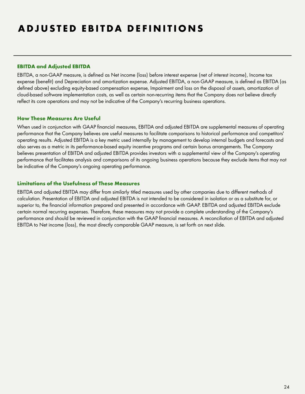 EBITDA and Adjusted EBITDA EBITDA, a non-GAAP measure, is defined as Net income (loss) before interest expense (net of interest income), Income tax expense (benefit) and Depreciation and amortization expense. Adjusted EBITDA, a non-GAAP measure, is defined as EBITDA (as defined above) excluding equity-based compensation expense, Impairment and loss on the disposal of assets, amortization of cloud-based software implementation costs, as well as certain non-recurring items that the Company does not believe directly reflect its core operations and may not be indicative of the Company's recurring business operations. How These Measures Are Useful When used in conjunction with GAAP financial measures, EBITDA and adjusted EBITDA are supplemental measures of operating performance that the Company believes are useful measures to facilitate comparisons to historical performance and competitors' operating results. Adjusted EBITDA is a key metric used internally by management to develop internal budgets and forecasts and also serves as a metric in its performance-based equity incentive programs and certain bonus arrangements. The Company believes presentation of EBITDA and adjusted EBITDA provides investors with a supplemental view of the Company's operating performance that facilitates analysis and comparisons of its ongoing business operations because they exclude items that may not be indicative of the Company's ongoing operating performance. Limitations of the Usefulness of These Measures EBITDA and adjusted EBITDA may differ from similarly titled measures used by other companies due to different methods of calculation. Presentation of EBITDA and adjusted EBITDA is not intended to be considered in isolation or as a substitute for, or superior to, the financial information prepared and presented in accordance with GAAP. EBITDA and adjusted EBITDA exclude certain normal recurring expenses. Therefore, these measures may not provide a complete understanding of the Company's performance and should be reviewed in conjunction with the GAAP financial measures. A reconciliation of EBITDA and adjusted EBITDA to Net income (loss), the most directly comparable GAAP measure, is set forth on next slide. A DJ U S T E D E B I T D A D E F I N I T I O N S 24