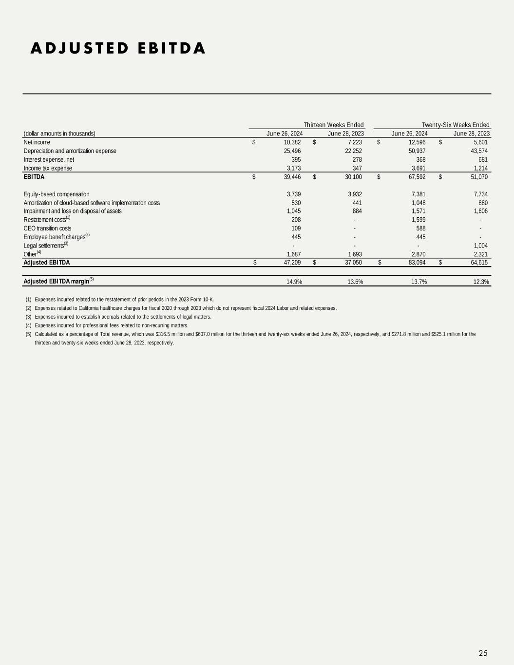 A DJ U S T E D E B I T D A 25 (dollar amounts in thousands) June 26, 2024 June 28, 2023 June 26, 2024 June 28, 2023 Net income 10,382$ 7,223$ 12,596$ 5,601$ Depreciation and amortization expense 25,496 22,252 50,937 43,574 Interest expense, net 395 278 368 681 Income tax expense 3,173 347 3,691 1,214 EBITDA 39,446$ 30,100$ 67,592$ 51,070$ Equity-based compensation 3,739 3,932 7,381 7,734 Amortization of cloud-based software implementation costs 530 441 1,048 880 Impairment and loss on disposal of assets 1,045 884 1,571 1,606 Restatement costs(1) 208 - 1,599 - CEO transition costs 109 - 588 - Employee benefit charges(2) 445 - 445 - Legal settlements(3) - - - 1,004 Other(4) 1,687 1,693 2,870 2,321 Adjusted EBITDA 47,209$ 37,050$ 83,094$ 64,615$ Adjusted EBITDA margin(5) 14.9% 13.6% 13.7% 12.3% (1) (2) (3) (4) (5) Expenses incurred to establish accruals related to the settlements of legal matters. Expenses incurred for professional fees related to non-recurring matters. Calculated as a percentage of Total revenue, which was $316.5 million and $607.0 million for the thirteen and twenty-six weeks ended June 26, 2024, respectively, and $271.8 million and $525.1 million for the thirteen and twenty-six weeks ended June 28, 2023, respectively. Expenses related to California healthcare charges for fiscal 2020 through 2023 which do not represent fiscal 2024 Labor and related expenses. Thirteen Weeks Ended Twenty-Six Weeks Ended Expenses incurred related to the restatement of prior periods in the 2023 Form 10-K.