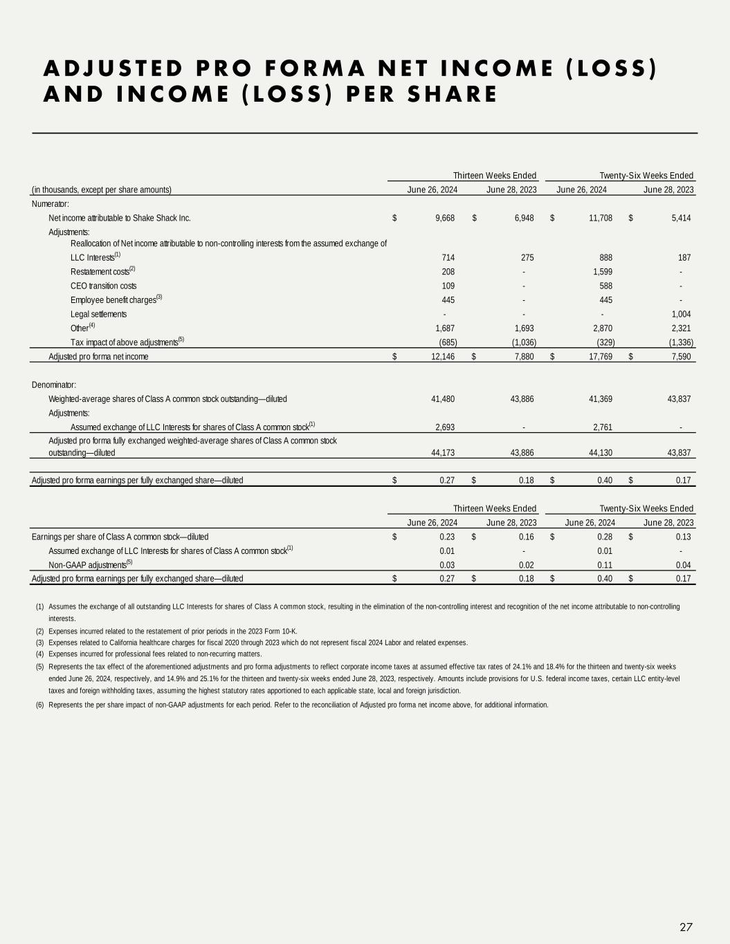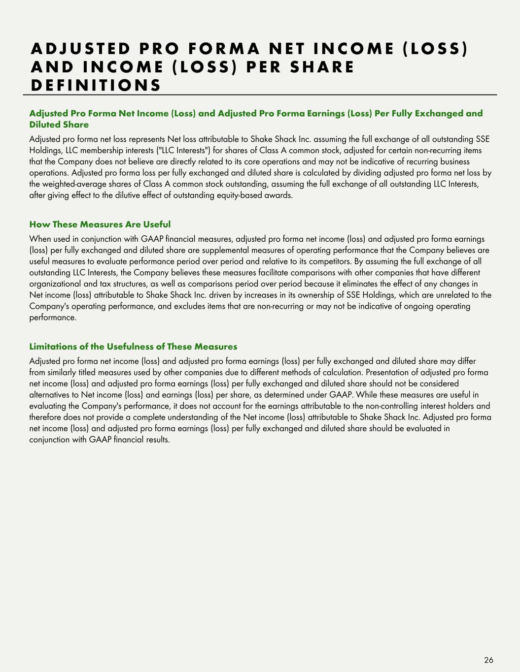 Adjusted Pro Forma Net Income (Loss) and Adjusted Pro Forma Earnings (Loss) Per Fully Exchanged and Diluted Share Adjusted pro forma net loss represents Net loss attributable to Shake Shack Inc. assuming the full exchange of all outstanding SSE Holdings, LLC membership interests ("LLC Interests") for shares of Class A common stock, adjusted for certain non-recurring items that the Company does not believe are directly related to its core operations and may not be indicative of recurring business operations. Adjusted pro forma loss per fully exchanged and diluted share is calculated by dividing adjusted pro forma net loss by the weighted-average shares of Class A common stock outstanding, assuming the full exchange of all outstanding LLC Interests, after giving effect to the dilutive effect of outstanding equity-based awards. How These Measures Are Useful When used in conjunction with GAAP financial measures, adjusted pro forma net income (loss) and adjusted pro forma earnings (loss) per fully exchanged and diluted share are supplemental measures of operating performance that the Company believes are useful measures to evaluate performance period over period and relative to its competitors. By assuming the full exchange of all outstanding LLC Interests, the Company believes these measures facilitate comparisons with other companies that have different organizational and tax structures, as well as comparisons period over period because it eliminates the effect of any changes in Net income (loss) attributable to Shake Shack Inc. driven by increases in its ownership of SSE Holdings, which are unrelated to the Company's operating performance, and excludes items that are non-recurring or may not be indicative of ongoing operating performance. Limitations of the Usefulness of These Measures Adjusted pro forma net income (loss) and adjusted pro forma earnings (loss) per fully exchanged and diluted share may differ from similarly titled measures used by other companies due to different methods of calculation. Presentation of adjusted pro forma net income (loss) and adjusted pro forma earnings (loss) per fully exchanged and diluted share should not be considered alternatives to Net income (loss) and earnings (loss) per share, as determined under GAAP. While these measures are useful in evaluating the Company's performance, it does not account for the earnings attributable to the non-controlling interest holders and therefore does not provide a complete understanding of the Net income (loss) attributable to Shake Shack Inc. Adjusted pro forma net income (loss) and adjusted pro forma earnings (loss) per fully exchanged and diluted share should be evaluated in conjunction with GAAP financial results. A DJ U S T E D P R O F O R M A N E T I N C O M E ( L O S S ) A N D I N C O M E ( L O S S ) P E R S H A R E D E F I N I T I O N S 26