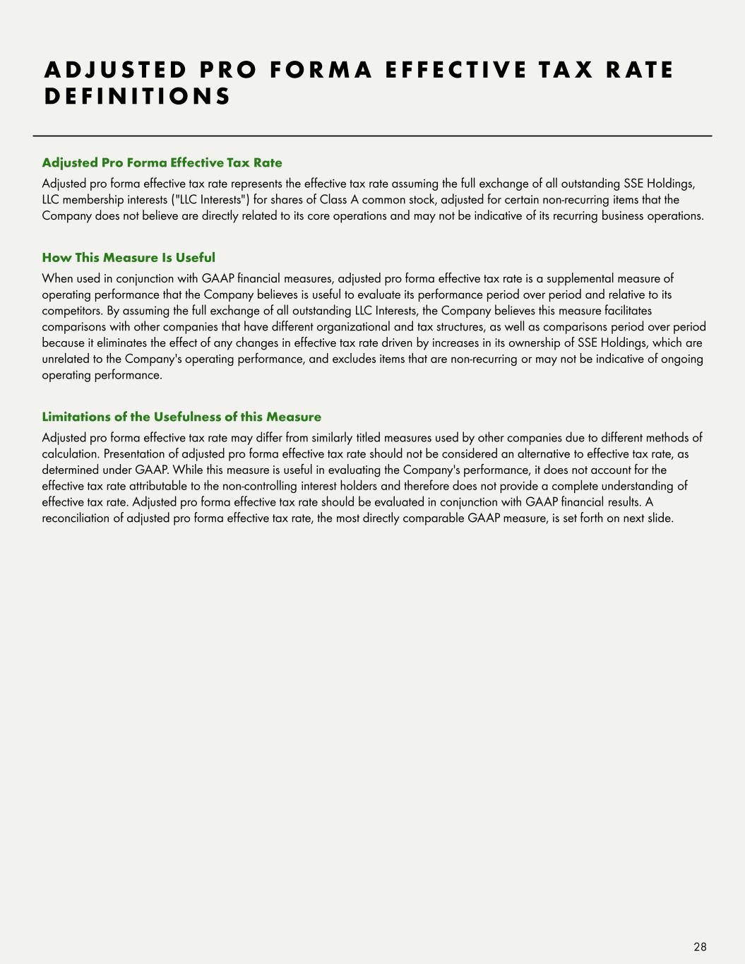 Adjusted Pro Forma Effective Tax Rate Adjusted pro forma effective tax rate represents the effective tax rate assuming the full exchange of all outstanding SSE Holdings, LLC membership interests ("LLC Interests") for shares of Class A common stock, adjusted for certain non-recurring items that the Company does not believe are directly related to its core operations and may not be indicative of its recurring business operations. How This Measure Is Useful When used in conjunction with GAAP financial measures, adjusted pro forma effective tax rate is a supplemental measure of operating performance that the Company believes is useful to evaluate its performance period over period and relative to its competitors. By assuming the full exchange of all outstanding LLC Interests, the Company believes this measure facilitates comparisons with other companies that have different organizational and tax structures, as well as comparisons period over period because it eliminates the effect of any changes in effective tax rate driven by increases in its ownership of SSE Holdings, which are unrelated to the Company's operating performance, and excludes items that are non-recurring or may not be indicative of ongoing operating performance. Limitations of the Usefulness of this Measure Adjusted pro forma effective tax rate may differ from similarly titled measures used by other companies due to different methods of calculation. Presentation of adjusted pro forma effective tax rate should not be considered an alternative to effective tax rate, as determined under GAAP. While this measure is useful in evaluating the Company's performance, it does not account for the effective tax rate attributable to the non-controlling interest holders and therefore does not provide a complete understanding of effective tax rate. Adjusted pro forma effective tax rate should be evaluated in conjunction with GAAP financial results. A reconciliation of adjusted pro forma effective tax rate, the most directly comparable GAAP measure, is set forth on next slide. A DJ U S T E D P R O F O R M A E F F E C T I V E TA X R AT E D E F I N I T I O N S 28