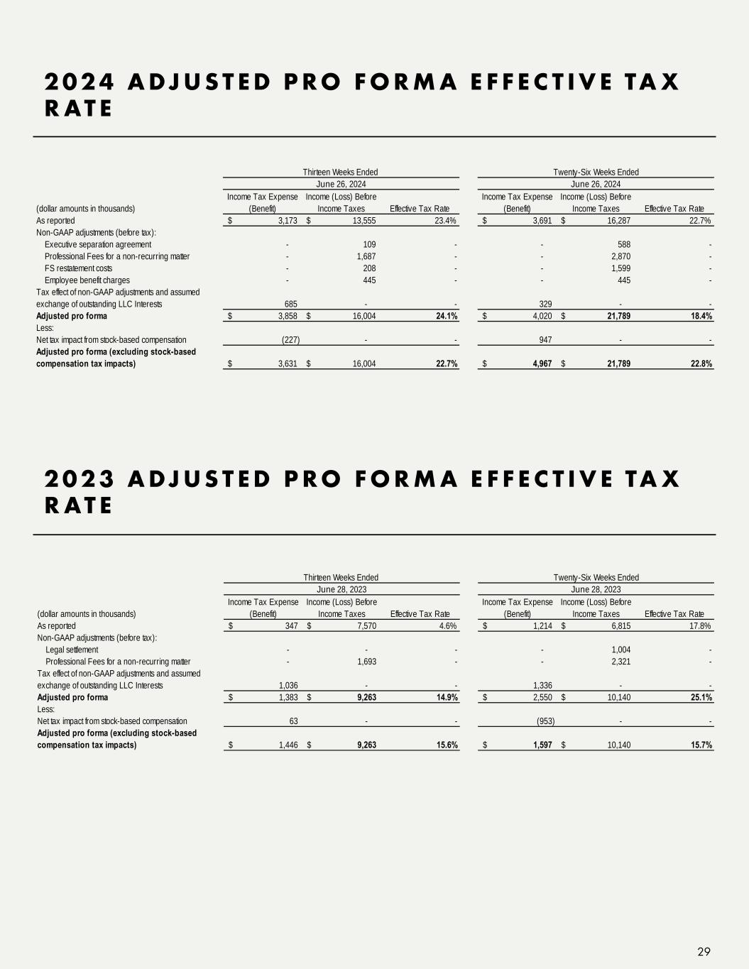 2 0 2 4 A DJ U S T E D P R O F O R M A E F F E C T I V E TA X R AT E 29 2 0 2 3 A DJ U S T E D P R O F O R M A E F F E C T I V E TA X R AT E (dollar amounts in thousands) Income Tax Expense (Benefit) Income (Loss) Before Income Taxes Effective Tax Rate Income Tax Expense (Benefit) Income (Loss) Before Income Taxes Effective Tax Rate As reported 3,173$ 13,555$ 23.4% 3,691$ 16,287$ 22.7% Non-GAAP adjustments (before tax): Executive separation agreement - 109 - - 588 - Professional Fees for a non-recurring matter - 1,687 - - 2,870 - FS restatement costs - 208 - - 1,599 - Employee benefit charges - 445 - - 445 - Tax effect of non-GAAP adjustments and assumed exchange of outstanding LLC Interests 685 - - 329 - - Adjusted pro forma 3,858$ 16,004$ 24.1% 4,020$ 21,789$ 18.4% Less: Net tax impact from stock-based compensation (227) - - 947 - - Adjusted pro forma (excluding stock-based compensation tax impacts) 3,631$ 16,004$ 22.7% 4,967$ 21,789$ 22.8% Thirteen Weeks Ended Twenty-Six Weeks Ended June 26, 2024 June 26, 2024 (dollar amounts in thousands) Income Tax Expense (Benefit) Income (Loss) Before Income Taxes Effective Tax Rate Income Tax Expense (Benefit) Income (Loss) Before Income Taxes Effective Tax Rate As reported 347$ 7,570$ 4.6% 1,214$ 6,815$ 17.8% Non-GAAP adjustments (before tax): Legal settlement - - - - 1,004 - Professional Fees for a non-recurring matter - 1,693 - - 2,321 - Tax effect of non-GAAP adjustments and assumed exchange of outstanding LLC Interests 1,036 - - 1,336 - - Adjusted pro forma 1,383$ 9,263$ 14.9% 2,550$ 10,140$ 25.1% Less: Net tax impact from stock-based compensation 63 - - (953) - - Adjusted pro forma (excluding stock-based compensation tax impacts) 1,446$ 9,263$ 15.6% 1,597$ 10,140$ 15.7% June 28, 2023 June 28, 2023 Thirteen Weeks Ended Twenty-Six Weeks Ended