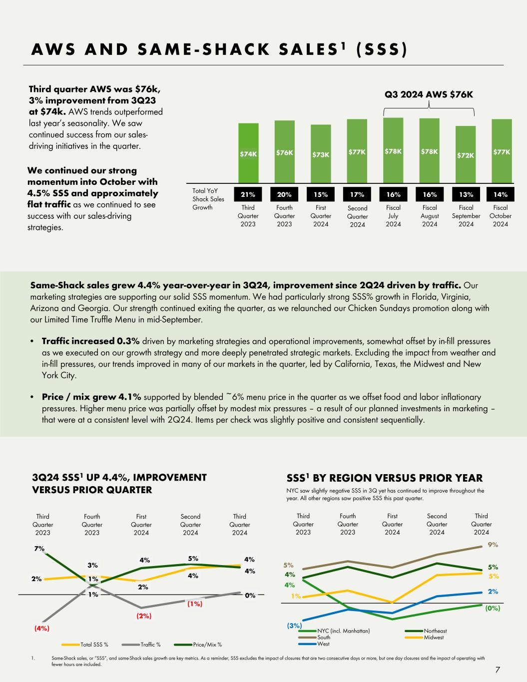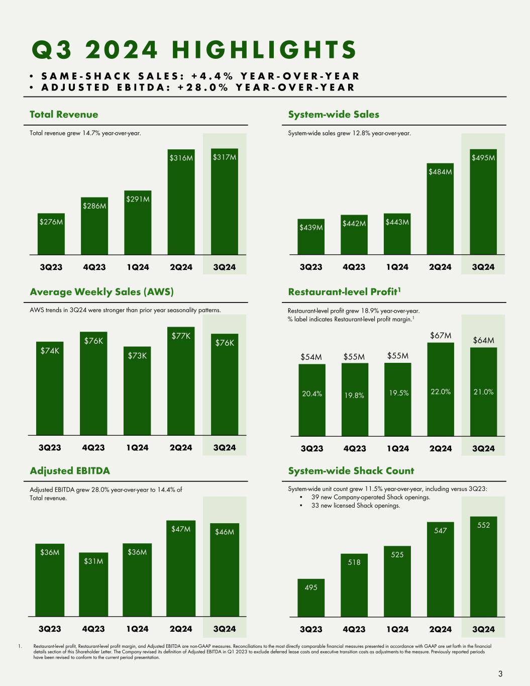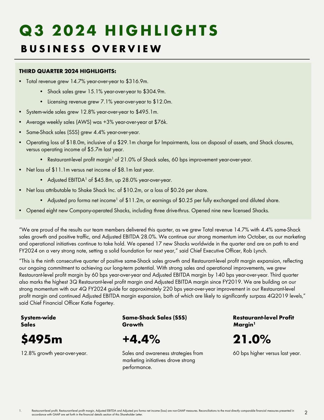 THIRD QUARTER 2024 HIGHLIGHTS: • Total revenue grew 14.7% year-over-year to $316.9m. • Shack sales grew 15.1% year-over-year to $304.9m. • Licensing revenue grew 7.1% year-over-year to $12.0m. • System-wide sales grew 12.8% year-over-year to $495.1m. • Average weekly sales (AWS) was +3% year-over-year at $76k. • Same-Shack sales (SSS) grew 4.4% year-over-year. • Operating loss of $18.0m, inclusive of a $29.1m charge for Impairments, loss on disposal of assets, and Shack closures, versus operating income of $5.7m last year. • Restaurant-level profit margin1 of 21.0% of Shack sales, 60 bps improvement year-over-year. • Net loss of $11.1m versus net income of $8.1m last year. • Adjusted EBITDA1 of $45.8m, up 28.0% year-over-year. • Net loss attributable to Shake Shack Inc. of $10.2m, or a loss of $0.26 per share. • Adjusted pro forma net income1 of $11.2m, or earnings of $0.25 per fully exchanged and diluted share. • Opened eight new Company-operated Shacks, including three drive-thrus. Opened nine new licensed Shacks. Q 3 2 0 2 4 H I G H L I G H T S System-wide Sales $495m 12.8% growth year-over-year. Same-Shack Sales (SSS) Growth +4.4% Sales and awareness strategies from marketing initiatives drove strong performance. Restaurant-level Profit Margin1 21.0% 60 bps higher versus last year. 2 B U S I N E S S O V E R V I E W 1. Restaurant-level profit, Restaurant-level profit margin, Adjusted EBITDA and Adjusted pro forma net income (loss) are non-GAAP measures. Reconciliations to the most directly comparable financial measures presented in accordance with GAAP are set forth in the financial details section of this Shareholder Letter. “We are proud of the results our team members delivered this quarter, as we grew Total revenue 14.7% with 4.4% same-Shack sales growth and positive traffic, and Adjusted EBITDA 28.0%. We continue our strong momentum into October, as our marketing and operational initiatives continue to take hold. We opened 17 new Shacks worldwide in the quarter and are on path to end FY2024 on a very strong note, setting a solid foundation for next year,” said Chief Executive Officer, Rob Lynch. “This is the ninth consecutive quarter of positive same-Shack sales growth and Restaurant-level profit margin expansion, reflecting our ongoing commitment to achieving our long-term potential. With strong sales and operational improvements, we grew Restaurant-level profit margin by 60 bps year-over-year and Adjusted EBITDA margin by 140 bps year-over-year. Third quarter also marks the highest 3Q Restaurant-level profit margin and Adjusted EBITDA margin since FY2019. We are building on our strong momentum with our 4Q FY2024 guide for approximately 220 bps year-over-year improvement in our Restaurant-level profit margin and continued Adjusted EBITDA margin expansion, both of which are likely to significantly surpass 4Q2019 levels,” said Chief Financial Officer Katie Fogertey.