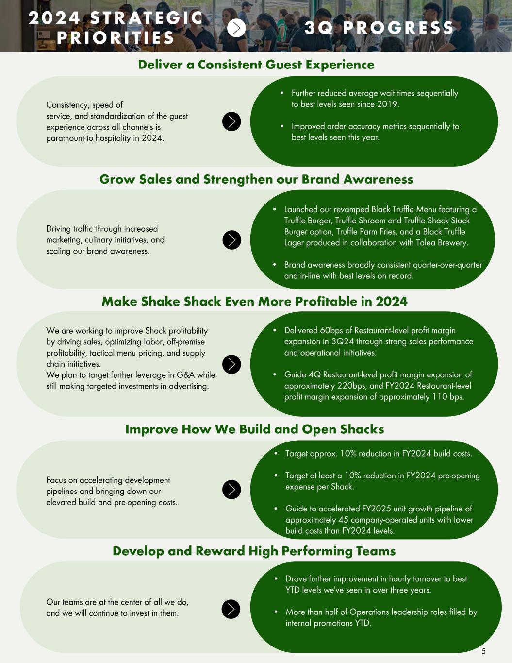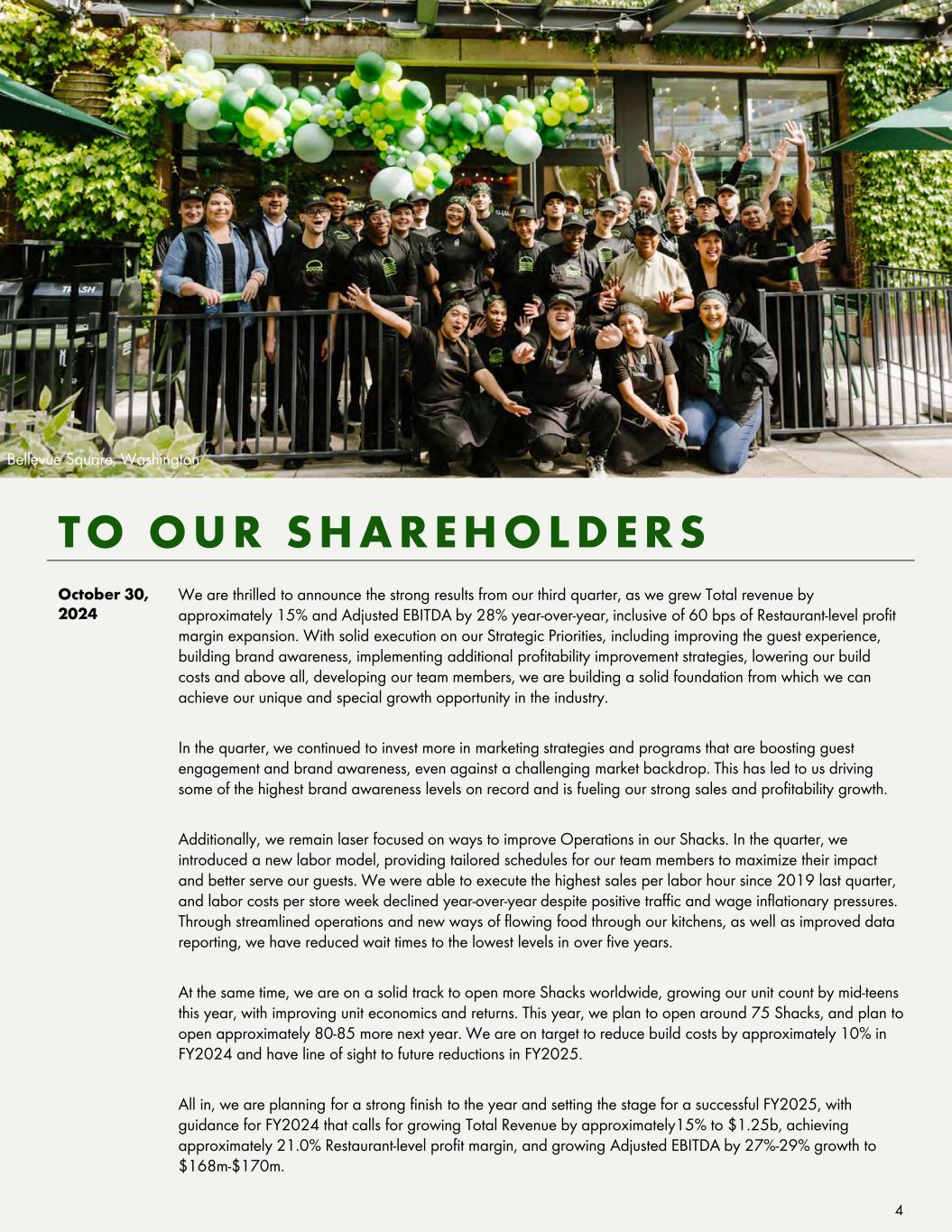 4 TO O U R S H A R E H O L D E R S We are thrilled to announce the strong results from our third quarter, as we grew Total revenue by approximately 15% and Adjusted EBITDA by 28% year-over-year, inclusive of 60 bps of Restaurant-level profit margin expansion. With solid execution on our Strategic Priorities, including improving the guest experience, building brand awareness, implementing additional profitability improvement strategies, lowering our build costs and above all, developing our team members, we are building a solid foundation from which we can achieve our unique and special growth opportunity in the industry. In the quarter, we continued to invest more in marketing strategies and programs that are boosting guest engagement and brand awareness, even against a challenging market backdrop. This has led to us driving some of the highest brand awareness levels on record and is fueling our strong sales and profitability growth. Additionally, we remain laser focused on ways to improve Operations in our Shacks. In the quarter, we introduced a new labor model, providing tailored schedules for our team members to maximize their impact and better serve our guests. We were able to execute the highest sales per labor hour since 2019 last quarter, and labor costs per store week declined year-over-year despite positive traffic and wage inflationary pressures. Through streamlined operations and new ways of flowing food through our kitchens, as well as improved data reporting, we have reduced wait times to the lowest levels in over five years. At the same time, we are on a solid track to open more Shacks worldwide, growing our unit count by mid-teens this year, with improving unit economics and returns. This year, we plan to open around 75 Shacks, and plan to open approximately 80-85 more next year. We are on target to reduce build costs by approximately 10% in FY2024 and have line of sight to future reductions in FY2025. All in, we are planning for a strong finish to the year and setting the stage for a successful FY2025, with guidance for FY2024 that calls for growing Total Revenue by approximately15% to $1.25b, achieving approximately 21.0% Restaurant-level profit margin, and growing Adjusted EBITDA by 27%-29% growth to $168m-$170m. October 30, 2024 Bellevue Square, Washington
