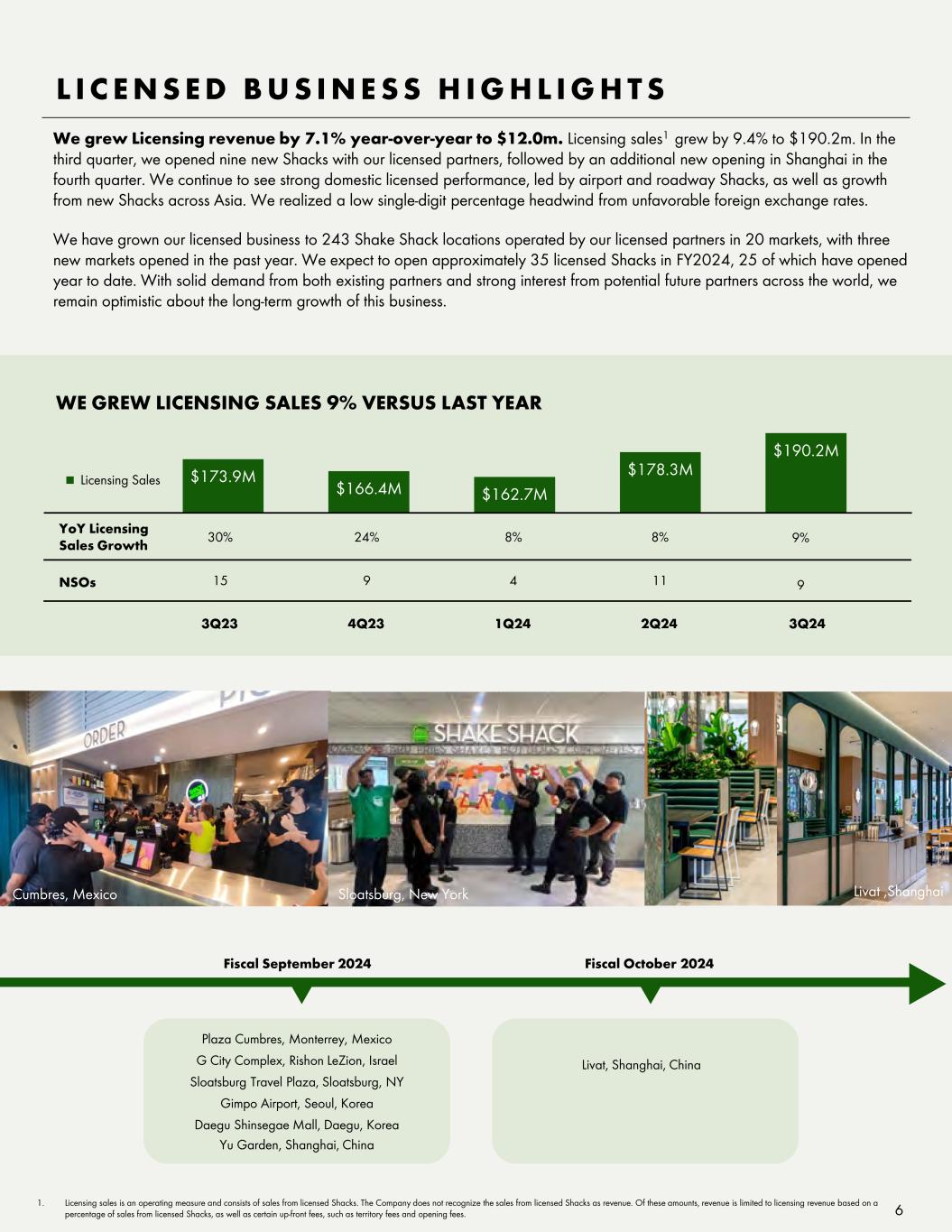 L I C E N S E D B U S I N E S S H I G H L I G H T S 1. Licensing sales is an operating measure and consists of sales from licensed Shacks. The Company does not recognize the sales from licensed Shacks as revenue. Of these amounts, revenue is limited to licensing revenue based on a percentage of sales from licensed Shacks, as well as certain up-front fees, such as territory fees and opening fees. 6 Fiscal September 2024 Fiscal October 2024 $173.9M $166.4M $162.7M $178.3M $190.2M Licensing Sales 9% WE GREW LICENSING SALES 9% VERSUS LAST YEAR 30% 24% YoY Licensing Sales Growth 8% 8% 15 9 4 11NSOs We grew Licensing revenue by 7.1% year-over-year to $12.0m. Licensing sales1 grew by 9.4% to $190.2m. In the third quarter, we opened nine new Shacks with our licensed partners, followed by an additional new opening in Shanghai in the fourth quarter. We continue to see strong domestic licensed performance, led by airport and roadway Shacks, as well as growth from new Shacks across Asia. We realized a low single-digit percentage headwind from unfavorable foreign exchange rates. We have grown our licensed business to 243 Shake Shack locations operated by our licensed partners in 20 markets, with three new markets opened in the past year. We expect to open approximately 35 licensed Shacks in FY2024, 25 of which have opened year to date. With solid demand from both existing partners and strong interest from potential future partners across the world, we remain optimistic about the long-term growth of this business. 3Q23 4Q23 1Q24 2Q24 3Q24 Plaza Cumbres, Monterrey, Mexico G City Complex, Rishon LeZion, Israel Sloatsburg Travel Plaza, Sloatsburg, NY Gimpo Airport, Seoul, Korea Daegu Shinsegae Mall, Daegu, Korea Yu Garden, Shanghai, China Livat, Shanghai, China 9 Cumbres, Mexico Livat ,ShanghaiSloatsburg, New York