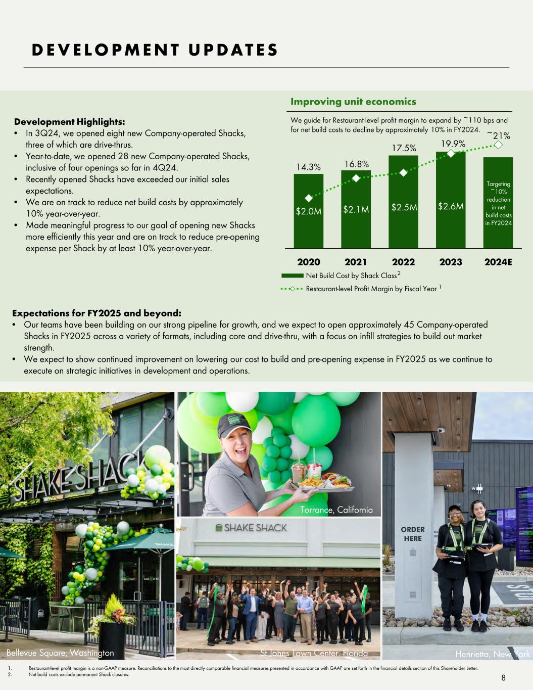 2% 3% 2% 4% 4% (4%) 1% (2%) (1%) 0% 7% 1% 4% 5% 4% Third Quarter 2023 Fourth Quarter 2023 First Quarter 2024 Second Quarter 2024 Third Quarter 2024 Total SSS % Traffic % Price/Mix % Same-Shack sales grew 4.4% year-over-year in 3Q24, improvement since 2Q24 driven by traffic. Our marketing strategies are supporting our solid SSS momentum. We had particularly strong SSS% growth in Florida, Virginia, Arizona and Georgia. Our strength continued exiting the quarter, as we relaunched our Chicken Sundays promotion along with our Limited Time Truffle Menu in mid-September. • Traffic increased 0.3% driven by marketing strategies and operational improvements, somewhat offset by in-fill pressures as we executed on our growth strategy and more deeply penetrated strategic markets. Excluding the impact from weather and in-fill pressures, our trends improved in many of our markets in the quarter, led by California, Texas, the Midwest and New York City. • Price / mix grew 4.1% supported by blended ~6% menu price in the quarter as we offset food and labor inflationary pressures. Higher menu price was partially offset by modest mix pressures – a result of our planned investments in marketing – that were at a consistent level with 2Q24. Items per check was slightly positive and consistent sequentially. 3Q24 SSS1 UP 4.4%, IMPROVEMENT VERSUS PRIOR QUARTER AW S A N D S A M E - S H A C K S A L E S 1 ( S S S ) 7 1. Same-Shack sales, or “SSS”, and same-Shack sales growth are key metrics. As a reminder, SSS excludes the impact of closures that are two consecutive days or more, but one day closures and the impact of operating with fewer hours are included. SSS1 BY REGION VERSUS PRIOR YEAR 4% (0%) 4% 5% 5% 9% 1% 5% (3%) 2% Third Quarter 2023 Fourth Quarter 2023 First Quarter 2024 Second Quarter 2024 Third Quarter 2024 NYC (incl. Manhattan) Northeast South Midwest West Third quarter AWS was $76k, 3% improvement from 3Q23 at $74k. AWS trends outperformed last year’s seasonality. We saw continued success from our sales- driving initiatives in the quarter. $74K $76K $73K $77K $78K $78K $72K $77K Q3 2024 AWS $76K Total YoY Shack Sales Growth Fiscal September 2024 21% Fourth Quarter 2023 17% 16% First Quarter 2024 20% Second Quarter 2024 15% Third Quarter 2023 13% Fiscal August 2024 16% Fiscal July 2024 We continued our strong momentum into October with 4.5% SSS and approximately flat traffic as we continued to see success with our sales-driving strategies. NYC saw slightly negative SSS in 3Q yet has continued to improve throughout the year. All other regions saw positive SSS this past quarter. Fiscal October 2024 14%