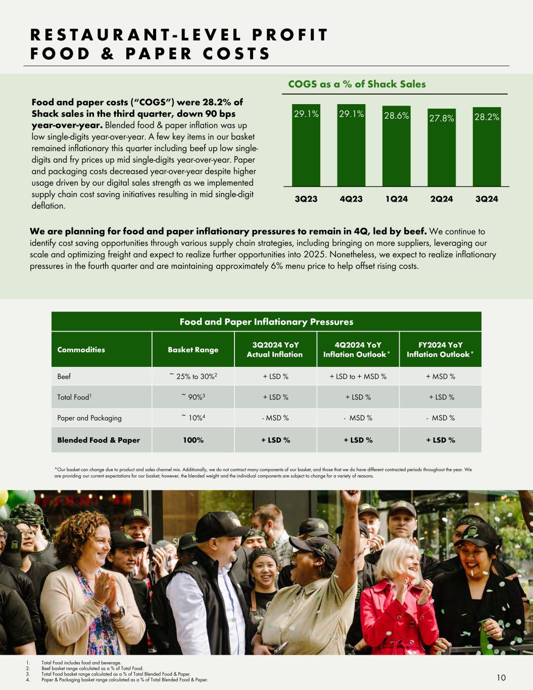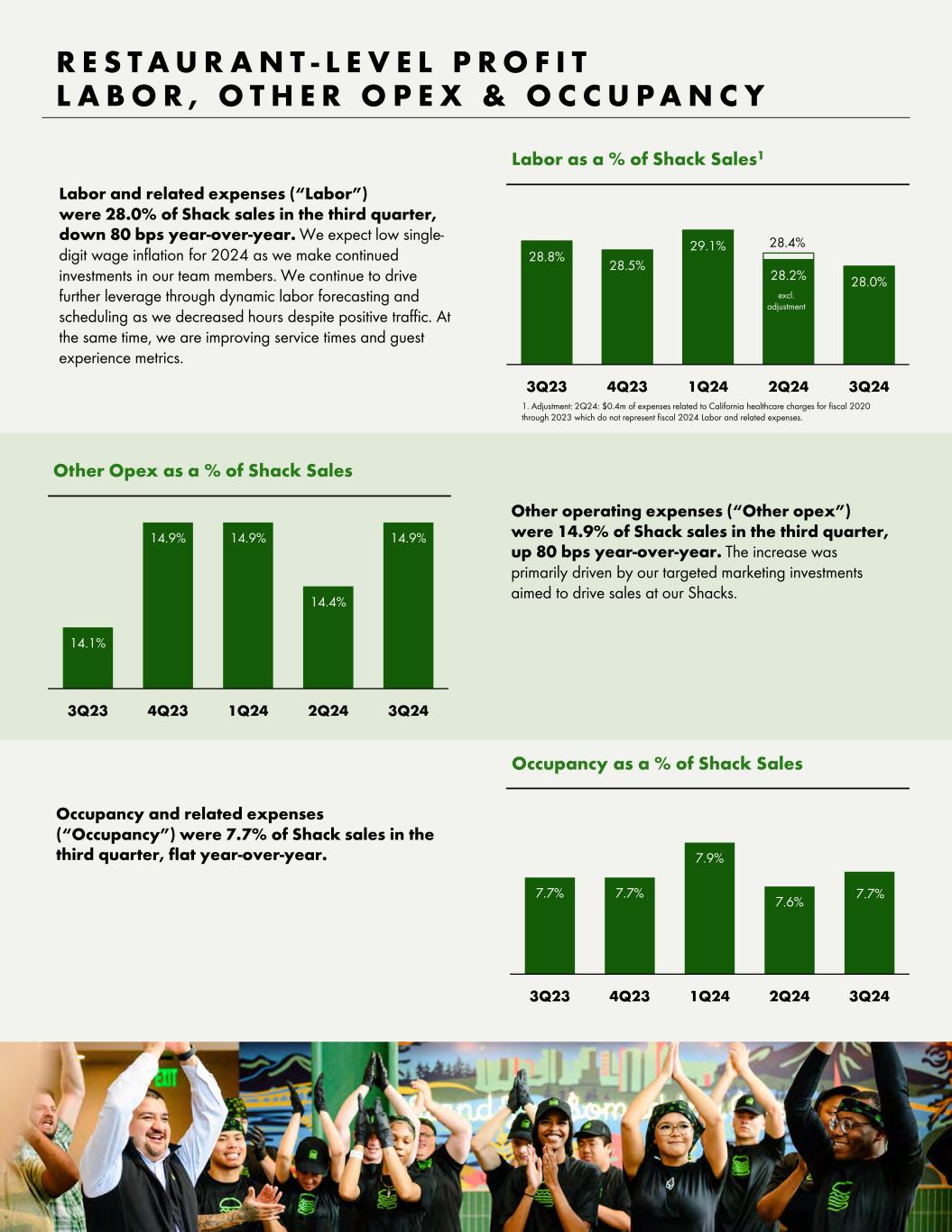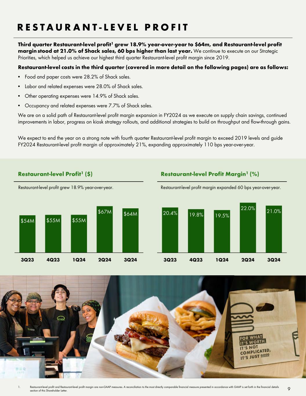 9 R E S T A U R A N T - L E V E L P R O F I T Third quarter Restaurant-level profit1 grew 18.9% year-over-year to $64m, and Restaurant-level profit margin stood at 21.0% of Shack sales, 60 bps higher than last year. We continue to execute on our Strategic Priorities, which helped us achieve our highest third quarter Restaurant-level profit margin since 2019. Restaurant-level costs in the third quarter (covered in more detail on the following pages) are as follows: • Food and paper costs were 28.2% of Shack sales. • Labor and related expenses were 28.0% of Shack sales. • Other operating expenses were 14.9% of Shack sales. • Occupancy and related expenses were 7.7% of Shack sales. We are on a solid path of Restaurant-level profit margin expansion in FY2024 as we execute on supply chain savings, continued improvements in labor, progress on kiosk strategy rollouts, and additional strategies to build on throughput and flow-through gains. We expect to end the year on a strong note with fourth quarter Restaurant-level profit margin to exceed 2019 levels and guide FY2024 Restaurant-level profit margin of approximately 21%, expanding approximately 110 bps year-over-year. 1. Restaurant-level profit and Restaurant-level profit margin are non-GAAP measures. A reconciliation to the most directly comparable financial measure presented in accordance with GAAP is set forth in the financial details section of this Shareholder Letter. $54M $55M $55M $67M $64M 3Q23 4Q23 1Q24 2Q24 3Q24 Restaurant-level Profit1 ($) 20.4% 19.8% 19.5% 22.0% 21.0% 3Q23 4Q23 1Q24 2Q24 3Q24 Restaurant-level Profit Margin1 (%) Restaurant-level profit grew 18.9% year-over-year. Restaurant-level profit margin expanded 60 bps year-over-year.