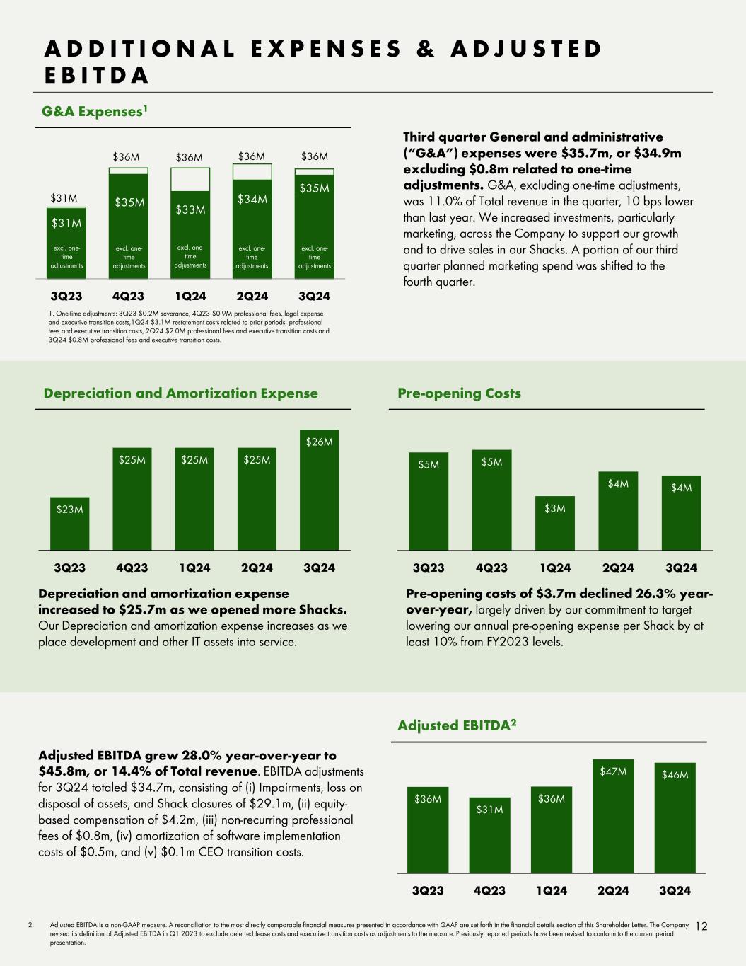 $31M $35M $33M $34M $35M 3Q23 4Q23 1Q24 2Q24 3Q24 G&A Expenses1 Third quarter General and administrative (“G&A”) expenses were $35.7m, or $34.9m excluding $0.8m related to one-time adjustments. G&A, excluding one-time adjustments, was 11.0% of Total revenue in the quarter, 10 bps lower than last year. We increased investments, particularly marketing, across the Company to support our growth and to drive sales in our Shacks. A portion of our third quarter planned marketing spend was shifted to the fourth quarter. $23M $25M $25M $25M $26M 3Q23 4Q23 1Q24 2Q24 3Q24 Depreciation and Amortization Expense $5M $5M $3M $4M $4M 3Q23 4Q23 1Q24 2Q24 3Q24 Pre-opening Costs A D D I T I O N A L E X P E N S E S & A D J U S T E D E B I T D A 2. Adjusted EBITDA is a non-GAAP measure. A reconciliation to the most directly comparable financial measures presented in accordance with GAAP are set forth in the financial details section of this Shareholder Letter. The Company revised its definition of Adjusted EBITDA in Q1 2023 to exclude deferred lease costs and executive transition costs as adjustments to the measure. Previously reported periods have been revised to conform to the current period presentation. Adjusted EBITDA grew 28.0% year-over-year to $45.8m, or 14.4% of Total revenue. EBITDA adjustments for 3Q24 totaled $34.7m, consisting of (i) Impairments, loss on disposal of assets, and Shack closures of $29.1m, (ii) equity- based compensation of $4.2m, (iii) non-recurring professional fees of $0.8m, (iv) amortization of software implementation costs of $0.5m, and (v) $0.1m CEO transition costs. $36M $31M $36M $47M $46M 3Q23 4Q23 1Q24 2Q24 3Q24 Adjusted EBITDA2 12 1. One-time adjustments: 3Q23 $0.2M severance, 4Q23 $0.9M professional fees, legal expense and executive transition costs,1Q24 $3.1M restatement costs related to prior periods, professional fees and executive transition costs, 2Q24 $2.0M professional fees and executive transition costs and 3Q24 $0.8M professional fees and executive transition costs. excl. one- time adjustments $36M $36M Depreciation and amortization expense increased to $25.7m as we opened more Shacks. Our Depreciation and amortization expense increases as we place development and other IT assets into service. Pre-opening costs of $3.7m declined 26.3% year- over-year, largely driven by our commitment to target lowering our annual pre-opening expense per Shack by at least 10% from FY2023 levels. $36M $31M $36M excl. one- time adjustments excl. one- time adjustments excl. one- time adjustments excl. one- time adjustments