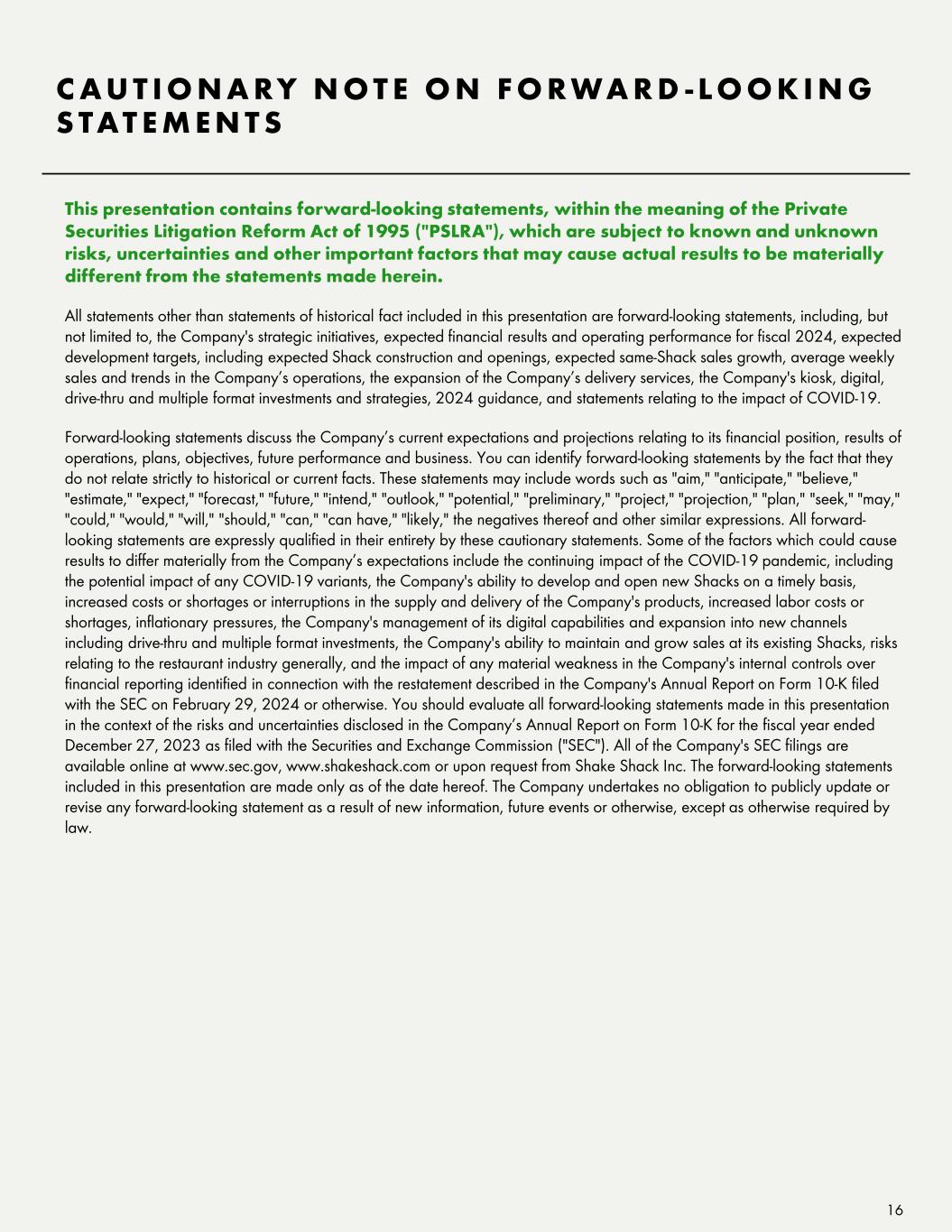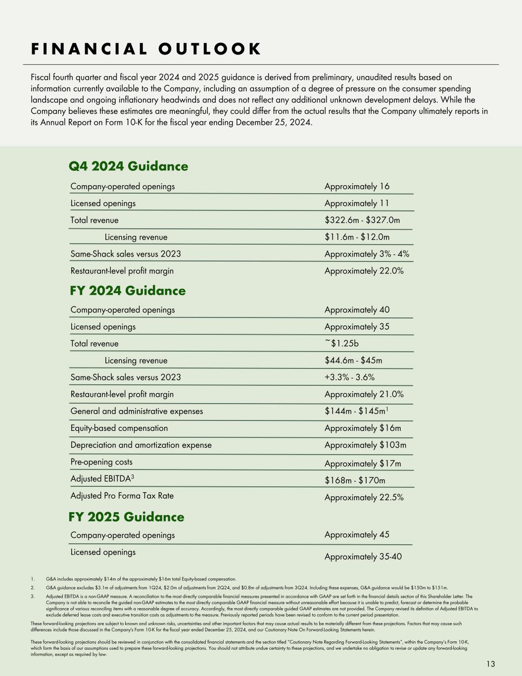 Fiscal fourth quarter and fiscal year 2024 and 2025 guidance is derived from preliminary, unaudited results based on information currently available to the Company, including an assumption of a degree of pressure on the consumer spending landscape and ongoing inflationary headwinds and does not reflect any additional unknown development delays. While the Company believes these estimates are meaningful, they could differ from the actual results that the Company ultimately reports in its Annual Report on Form 10-K for the fiscal year ending December 25, 2024. F I N A N C I A L O U T L O O K 13 1. G&A includes approximately $14m of the approximately $16m total Equity-based compensation. 2. G&A guidance excludes $3.1m of adjustments from 1Q24, $2.0m of adjustments from 2Q24, and $0.8m of adjustments from 3Q24. Including these expenses, G&A guidance would be $150m to $151m. 3. Adjusted EBITDA is a non-GAAP measure. A reconciliation to the most directly comparable financial measures presented in accordance with GAAP are set forth in the financial details section of this Shareholder Letter. The Company is not able to reconcile the guided non-GAAP estimates to the most directly comparable GAAP financial measure without unreasonable effort because it is unable to predict, forecast or determine the probable significance of various reconciling items with a reasonable degree of accuracy. Accordingly, the most directly comparable guided GAAP estimates are not provided. The Company revised its definition of Adjusted EBITDA to exclude deferred lease costs and executive transition costs as adjustments to the measure. Previously reported periods have been revised to conform to the current period presentation. These forward-looking projections are subject to known and unknown risks, uncertainties and other important factors that may cause actual results to be materially different from these projections. Factors that may cause such differences include those discussed in the Company's Form 10-K for the fiscal year ended December 25, 2024, and our Cautionary Note On Forward-Looking Statements herein. These forward-looking projections should be reviewed in conjunction with the consolidated financial statements and the section titled “Cautionary Note Regarding Forward-Looking Statements”, within the Company’s Form 10-K, which form the basis of our assumptions used to prepare these forward-looking projections. You should not attribute undue certainty to these projections, and we undertake no obligation to revise or update any forward-looking information, except as required by law. Company-operated openings Licensed openings Total revenue Licensing revenue Same-Shack sales versus 2023 Restaurant-level profit margin Company-operated openings Licensed openings Total revenue Licensing revenue Same-Shack sales versus 2023 Restaurant-level profit margin General and administrative expenses Equity-based compensation Depreciation and amortization expense Pre-opening costs Adjusted EBITDA3 Adjusted Pro Forma Tax Rate Company-operated openings Licensed openings Approximately 16 Approximately 11 $322.6m - $327.0m $11.6m - $12.0m Approximately 3% - 4% Approximately 22.0% Approximately 40 Approximately 35 ~$1.25b $44.6m - $45m +3.3% - 3.6% Approximately 21.0% $144m - $145m1 Approximately $16m Approximately $103m Approximately $17m $168m - $170m Approximately 22.5% Approximately 45 Approximately 35-40 Q4 2024 Guidance FY 2024 Guidance FY 2025 Guidance