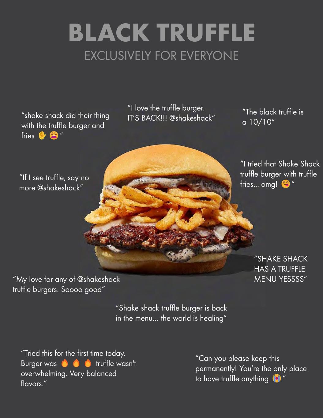 “shake shack did their thing with the truffle burger and fries ” “I tried that Shake Shack truffle burger with truffle fries... omg! ” “I love the truffle burger. IT’S BACK!!! @shakeshack” “The black truffle is a 10/10” “Can you please keep this permanently! You’re the only place to have truffle anything ” “If I see truffle, say no more @shakeshack” “Shake shack truffle burger is back in the menu… the world is healing” “SHAKE SHACK HAS A TRUFFLE MENU YESSSS” “Tried this for the first time today. Burger was truffle wasn't overwhelming. Very balanced flavors.” “My love for any of @shakeshack truffle burgers. Soooo good” BLACK TRUFFLE EXCLUSIVELY FOR EVERYONE