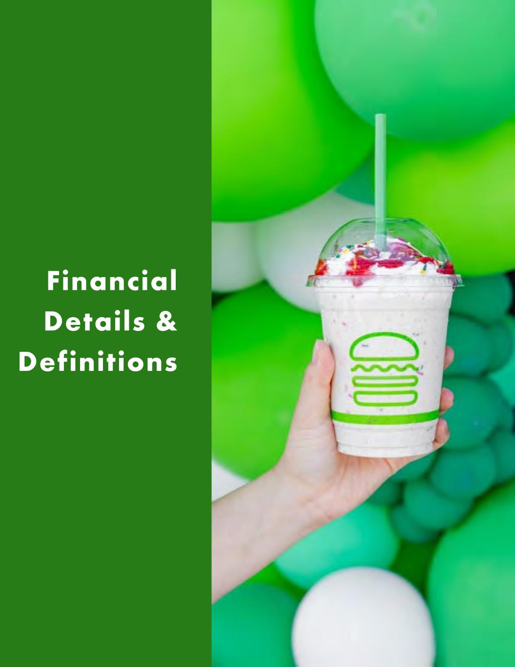 D E F I N I T I O N S 17 The following definitions, and definitions on the subsequent pages, apply to terms as used in this shareholder letter: "Shack sales" is defined as the aggregate sales of food, beverages, gift card breakage income, and Shake Shack branded merchandise at Company-operated Shacks and excludes sales from licensed Shacks. “System-wide sales” is an operating measure and consists of sales from Company-operated Shacks and licensed Shacks. The Company does not recognize the sales from licensed Shacks as revenue. Of these amounts, revenue is limited to licensing revenue based on a percentage of sales from licensed Shacks, as well as certain up-front fees, such as territory fees and opening fees. "Same-Shack sales" or “SSS” represents Shack sales for the comparable Shack base, which is defined as the number of Company- operated Shacks open for 24 full fiscal months or longer. For consecutive days that Shacks were temporarily closed, the comparative period was also adjusted. "Average weekly sales" or “AWS” is calculated by dividing total Shack sales by the number of operating weeks for all Shacks in operation during the period. For Shacks that are not open for the entire period, fractional adjustments are made to the number of operating weeks open such that it corresponds to the period of associated sales. “Adjusted pro forma net income," a non-GAAP measure, represents Net income (loss) attributable to Shake Shack Inc. assuming the full exchange of all outstanding SSE Holdings, LLC membership interests ("LLC Interests") for shares of Class A common stock, adjusted for certain non-recurring and other items that the Company does not believe directly reflect its core operations and may not be indicative of the Company’s recurring business operations. “EBITDA,” a non-GAAP measure, is defined as Net income (loss) before interest expense (net of interest income), Income tax expense (benefit), and Depreciation and amortization expense. “Adjusted EBITDA,” a non-GAAP measure, is defined as EBITDA (as defined above), excluding equity-based compensation expense, Impairments, loss on disposal of assets and Shack closures, amortization of cloud-based software implementation costs, as well as certain non-recurring items that the Company does not believe directly reflect its core operations and may not be indicative of the Company's recurring business operations. “Adjusted EBITDA margin,” a non-GAAP measure, is defined as Net income (loss) before interest expense (net of interest income), Income tax expense (benefit) and Depreciation and amortization expense, which also excludes equity-based compensation expense, Impairments, loss on disposal of assets and Shack closures, amortization of cloud-based software implementation costs, as well as certain non-recurring items that the Company does not believe directly reflect its core operations and may not be indicative of the Company's recurring business operations, as a percentage of Total revenue. “Restaurant-level profit,” a non-GAAP measure, formerly referred to as Shack-level operating profit, is defined as Shack sales less Shack-level operating expenses, including Food and paper costs, Labor and related expenses, Other operating expenses, and Occupancy and related expenses. "Restaurant-level profit margin," a non-GAAP measure, formerly referred to as Shack-level operating profit margin, is defined as Shack sales less Shack-level operating expenses, including Food and paper costs, Labor and related expenses, Other operating expenses and Occupancy and related expenses as a percentage of Shack sales.
