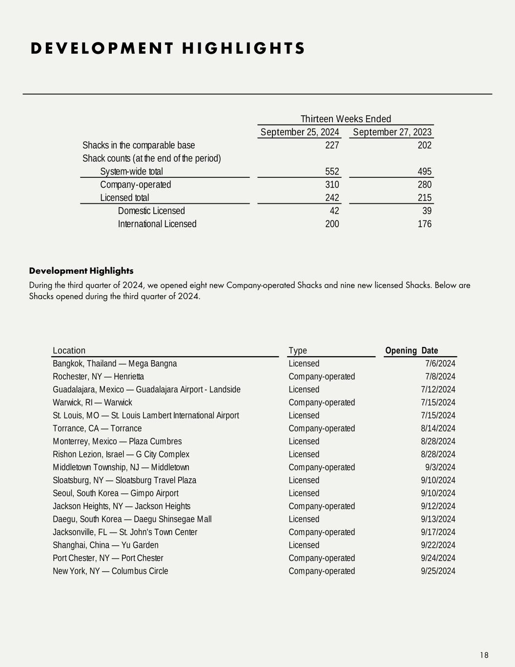 D E V E L O P M E N T H I G H L I G H T S 18 Development Highlights During the third quarter of 2024, we opened eight new Company-operated Shacks and nine new licensed Shacks. Below are Shacks opened during the third quarter of 2024. Location Type Opening Date Bangkok, Thailand — Mega Bangna Licensed 7/6/2024 Rochester, NY — Henrietta Company-operated 7/8/2024 Guadalajara, Mexico — Guadalajara Airport - Landside Licensed 7/12/2024 Warwick, RI — Warwick Company-operated 7/15/2024 St. Louis, MO — St. Louis Lambert International Airport Licensed 7/15/2024 Torrance, CA — Torrance Company-operated 8/14/2024 Monterrey, Mexico — Plaza Cumbres Licensed 8/28/2024 Rishon Lezion, Israel — G City Complex Licensed 8/28/2024 Middletown Township, NJ — Middletown Company-operated 9/3/2024 Sloatsburg, NY — Sloatsburg Travel Plaza Licensed 9/10/2024 Seoul, South Korea — Gimpo Airport Licensed 9/10/2024 Jackson Heights, NY — Jackson Heights Company-operated 9/12/2024 Daegu, South Korea — Daegu Shinsegae Mall Licensed 9/13/2024 Jacksonville, FL — St. John's Town Center Company-operated 9/17/2024 Shanghai, China — Yu Garden Licensed 9/22/2024 Port Chester, NY — Port Chester Company-operated 9/24/2024 New York, NY — Columbus Circle Company-operated 9/25/2024 September 25, 2024 September 27, 2023 Shacks in the comparable base 227 202 Shack counts (at the end of the period) System-wide total 552 495 Company-operated 310 280 Licensed total 242 215 Domestic Licensed 42 39 International Licensed 200 176 Thirteen Weeks Ended