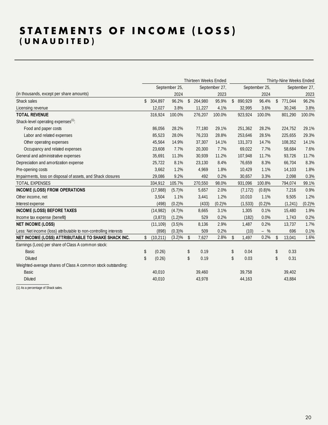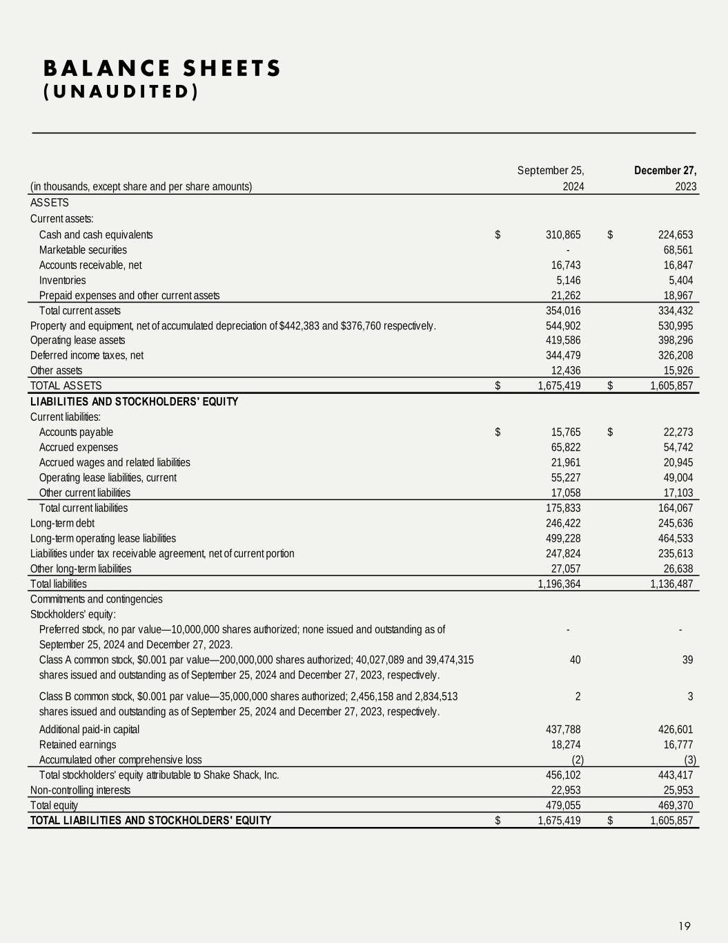 B A L A N C E S H E E T S ( U N A U D I T E D ) 19 September 25, December 27, 2024 2023 ASSETS Current assets: Cash and cash equivalents 310,865$ 224,653$ Marketable securities - 68,561 Accounts receivable, net 16,743 16,847 Inventories 5,146 5,404 Prepaid expenses and other current assets 21,262 18,967 Total current assets 354,016 334,432 Property and equipment, net of accumulated depreciation of $442,383 and $376,760 respectively. 544,902 530,995 Operating lease assets 419,586 398,296 Deferred income taxes, net 344,479 326,208 Other assets 12,436 15,926 TOTAL ASSETS 1,675,419$ 1,605,857$ LIABILITIES AND STOCKHOLDERS' EQUITY Current liabilities: Accounts payable 15,765$ 22,273$ Accrued expenses 65,822 54,742 Accrued wages and related liabilities 21,961 20,945 Operating lease liabilities, current 55,227 49,004 Other current liabilities 17,058 17,103 Total current liabilities 175,833 164,067 Long-term debt 246,422 245,636 Long-term operating lease liabilities 499,228 464,533 Liabilities under tax receivable agreement, net of current portion 247,824 235,613 Other long-term liabilities 27,057 26,638 Total liabilities 1,196,364 1,136,487 Commitments and contingencies Stockholders' equity: Preferred stock, no par value—10,000,000 shares authorized; none issued and outstanding as of September 25, 2024 and December 27, 2023. - - Class A common stock, $0.001 par value—200,000,000 shares authorized; 40,027,089 and 39,474,315 shares issued and outstanding as of September 25, 2024 and December 27, 2023, respectively. 40 39 Class B common stock, $0.001 par value—35,000,000 shares authorized; 2,456,158 and 2,834,513 shares issued and outstanding as of September 25, 2024 and December 27, 2023, respectively. 2 3 Additional paid-in capital 437,788 426,601 Retained earnings 18,274 16,777 Accumulated other comprehensive loss (2) (3) Total stockholders' equity attributable to Shake Shack, Inc. 456,102 443,417 Non-controlling interests 22,953 25,953 Total equity 479,055 469,370 TOTAL LIABILITIES AND STOCKHOLDERS' EQUITY 1,675,419$ 1,605,857$ (in thousands, except share and per share amounts)