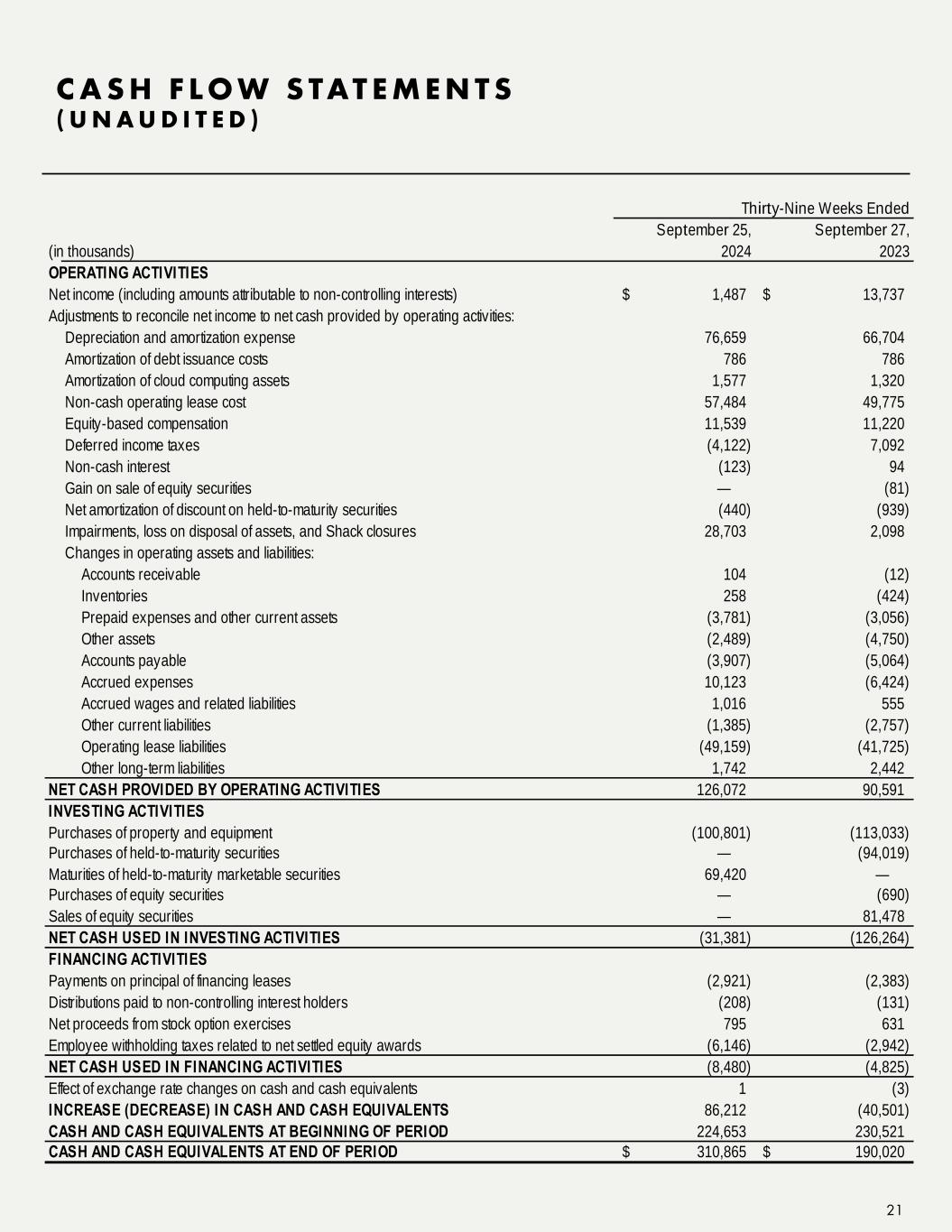 C A S H F L O W S TAT E M E N T S ( U N A U D I T E D ) 21 September 25, September 27, (in thousands) 2024 2023 OPERATING ACTIVITIES Net income (including amounts attributable to non-controlling interests) 1,487$ 13,737$ Adjustments to reconcile net income to net cash provided by operating activities: Depreciation and amortization expense 76,659 66,704 Amortization of debt issuance costs 786 786 Amortization of cloud computing assets 1,577 1,320 Non-cash operating lease cost 57,484 49,775 Equity-based compensation 11,539 11,220 Deferred income taxes (4,122) 7,092 Non-cash interest (123) 94 Gain on sale of equity securities — (81) Net amortization of discount on held-to-maturity securities (440) (939) Impairments, loss on disposal of assets, and Shack closures 28,703 2,098 Changes in operating assets and liabilities: Accounts receivable 104 (12) Inventories 258 (424) Prepaid expenses and other current assets (3,781) (3,056) Other assets (2,489) (4,750) Accounts payable (3,907) (5,064) Accrued expenses 10,123 (6,424) Accrued wages and related liabilities 1,016 555 Other current liabilities (1,385) (2,757) Operating lease liabilities (49,159) (41,725) Other long-term liabilities 1,742 2,442 NET CASH PROVIDED BY OPERATING ACTIVITIES 126,072 90,591 INVESTING ACTIVITIES Purchases of property and equipment (100,801) (113,033) Purchases of held-to-maturity securities — (94,019) Maturities of held-to-maturity marketable securities 69,420 — Purchases of equity securities — (690) Sales of equity securities — 81,478 NET CASH USED IN INVESTING ACTIVITIES (31,381) (126,264) FINANCING ACTIVITIES Payments on principal of financing leases (2,921) (2,383) Distributions paid to non-controlling interest holders (208) (131) Net proceeds from stock option exercises 795 631 Employee withholding taxes related to net settled equity awards (6,146) (2,942) NET CASH USED IN FINANCING ACTIVITIES (8,480) (4,825) Effect of exchange rate changes on cash and cash equivalents 1 (3) INCREASE (DECREASE) IN CASH AND CASH EQUIVALENTS 86,212 (40,501) CASH AND CASH EQUIVALENTS AT BEGINNING OF PERIOD 224,653 230,521 CASH AND CASH EQUIVALENTS AT END OF PERIOD 310,865$ 190,020$ Thirty-Nine Weeks Ended