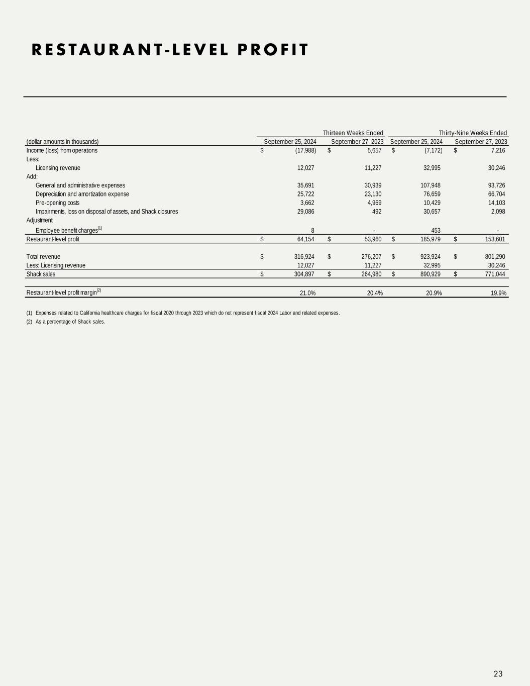 R E S TA U R A N T - L E V E L P R O F I T D E F I N I T I O N S 22 Restaurant-Level Profit “Restaurant-level profit,” a non-GAAP measure, formerly referred to as Shack-level operating profit, is defined as Shack sales less Shack-level operating expenses, including Food and paper costs, Labor and related expenses, Other operating expenses, and Occupancy and related expenses. Restaurant-level Profit Margin "Restaurant-level profit margin," a non-GAAP measure, formerly referred to as Shack-level operating profit margin, is defined as Shack sales less Shack-level operating expenses, including Food and paper costs, Labor and related expenses, Other operating expenses and Occupancy and related expenses as a percentage of Shack sales. How This Measure Is Useful When used in conjunction with GAAP financial measures, Restaurant-level profit and Restaurant-level profit margin are supplemental measures of operating performance that the Company believes are useful measures to evaluate the performance and profitability of its Shacks. Additionally, Restaurant-level profit and Restaurant-level profit margin are key metrics used internally by management to develop internal budgets and forecasts, as well as assess the performance of its Shacks relative to budget and against prior periods. It is also used to evaluate employee compensation as it serves as a metric in certain performance-based employee bonus arrangements. The Company believes presentation of Restaurant-level profit and Restaurant-level profit margin provides investors with a supplemental view of its operating performance that can provide meaningful insights to the underlying operating performance of the Shacks, as these measures depict the operating results that are directly impacted by the Shacks and exclude items that may not be indicative of, or are unrelated to, the ongoing operations of the Shacks. It may also assist investors to evaluate the Company's performance relative to peers of various sizes and maturities and provides greater transparency with respect to how management evaluates the business, as well as the financial and operational decision-making. Limitations of the Usefulness of this Measure Restaurant-level profit and Restaurant-level profit margin may differ from similarly titled measures used by other companies due to different methods of calculation. Presentation of Restaurant-level profit and Restaurant-level profit margin is not intended to be considered in isolation or as a substitute for, or superior to, the financial information prepared and presented in accordance with GAAP. Restaurant-level profit excludes certain costs, such as General and administrative expenses and Pre-opening costs, which are considered normal, recurring cash operating expenses and are essential to support the operation and development of the Company's Shacks. Therefore, this measure may not provide a complete understanding of the Company's operating results as a whole and Restaurant-level profit and Restaurant-level profit margin should be reviewed in conjunction with the Company’s GAAP financial results. A reconciliation of Restaurant-level profit to operating income (loss), the most directly comparable GAAP financial measure, is set forth on next slide.
