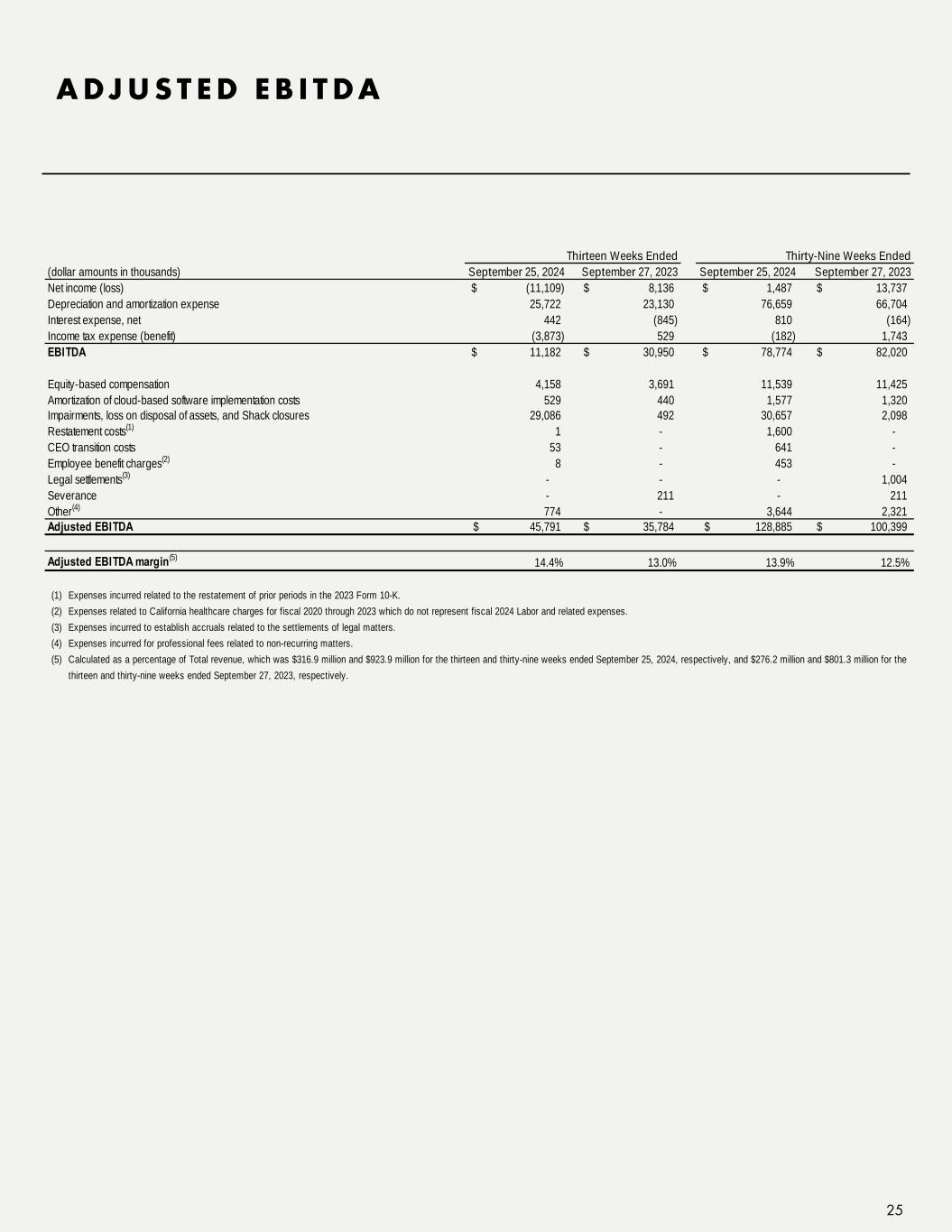 R E S TA U R A N T - L E V E L P R O F I T 23 (dollar amounts in thousands) September 25, 2024 September 27, 2023 September 25, 2024 September 27, 2023 Income (loss) from operations (17,988)$ 5,657$ (7,172)$ 7,216$ Less: Licensing revenue 12,027 11,227 32,995 30,246 Add: General and administrative expenses 35,691 30,939 107,948 93,726 Depreciation and amortization expense 25,722 23,130 76,659 66,704 Pre-opening costs 3,662 4,969 10,429 14,103 Impairments, loss on disposal of assets, and Shack closures 29,086 492 30,657 2,098 Adjustment: Employee benefit charges(1) 8 - 453 - Restaurant-level profit 64,154$ 53,960$ 185,979$ 153,601$ Total revenue 316,924$ 276,207$ 923,924$ 801,290$ Less: Licensing revenue 12,027 11,227 32,995 30,246 Shack sales 304,897$ 264,980$ 890,929$ 771,044$ Restaurant-level profit margin(2) 21.0% 20.4% 20.9% 19.9% (1) (2) As a percentage of Shack sales. Thirteen Weeks Ended Thirty-Nine Weeks Ended Expenses related to California healthcare charges for fiscal 2020 through 2023 which do not represent fiscal 2024 Labor and related expenses.