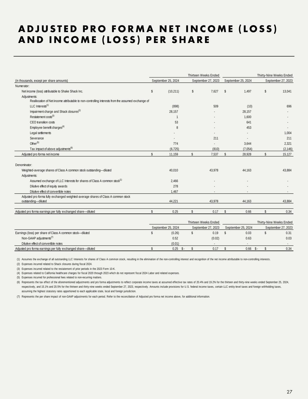 Adjusted Pro Forma Net Income (Loss) and Adjusted Pro Forma Earnings (Loss) Per Fully Exchanged and Diluted Share Adjusted pro forma net loss represents Net loss attributable to Shake Shack Inc. assuming the full exchange of all outstanding SSE Holdings, LLC membership interests ("LLC Interests") for shares of Class A common stock, adjusted for certain non-recurring items that the Company does not believe are directly related to its core operations and may not be indicative of recurring business operations. Adjusted pro forma loss per fully exchanged and diluted share is calculated by dividing adjusted pro forma net loss by the weighted-average shares of Class A common stock outstanding, assuming the full exchange of all outstanding LLC Interests, after giving effect to the dilutive effect of outstanding equity-based awards. How These Measures Are Useful When used in conjunction with GAAP financial measures, adjusted pro forma net income (loss) and adjusted pro forma earnings (loss) per fully exchanged and diluted share are supplemental measures of operating performance that the Company believes are useful measures to evaluate performance period over period and relative to its competitors. By assuming the full exchange of all outstanding LLC Interests, the Company believes these measures facilitate comparisons with other companies that have different organizational and tax structures, as well as comparisons period over period because it eliminates the effect of any changes in Net income (loss) attributable to Shake Shack Inc. driven by increases in its ownership of SSE Holdings, which are unrelated to the Company's operating performance, and excludes items that are non-recurring or may not be indicative of ongoing operating performance. Limitations of the Usefulness of These Measures Adjusted pro forma net income (loss) and adjusted pro forma earnings (loss) per fully exchanged and diluted share may differ from similarly titled measures used by other companies due to different methods of calculation. Presentation of adjusted pro forma net income (loss) and adjusted pro forma earnings (loss) per fully exchanged and diluted share should not be considered alternatives to Net income (loss) and earnings (loss) per share, as determined under GAAP. While these measures are useful in evaluating the Company's performance, it does not account for the earnings attributable to the non-controlling interest holders and therefore does not provide a complete understanding of the Net income (loss) attributable to Shake Shack Inc. Adjusted pro forma net income (loss) and adjusted pro forma earnings (loss) per fully exchanged and diluted share should be evaluated in conjunction with GAAP financial results. A DJ U S T E D P R O F O R M A N E T I N C O M E ( L O S S ) A N D I N C O M E ( L O S S ) P E R S H A R E D E F I N I T I O N S 26