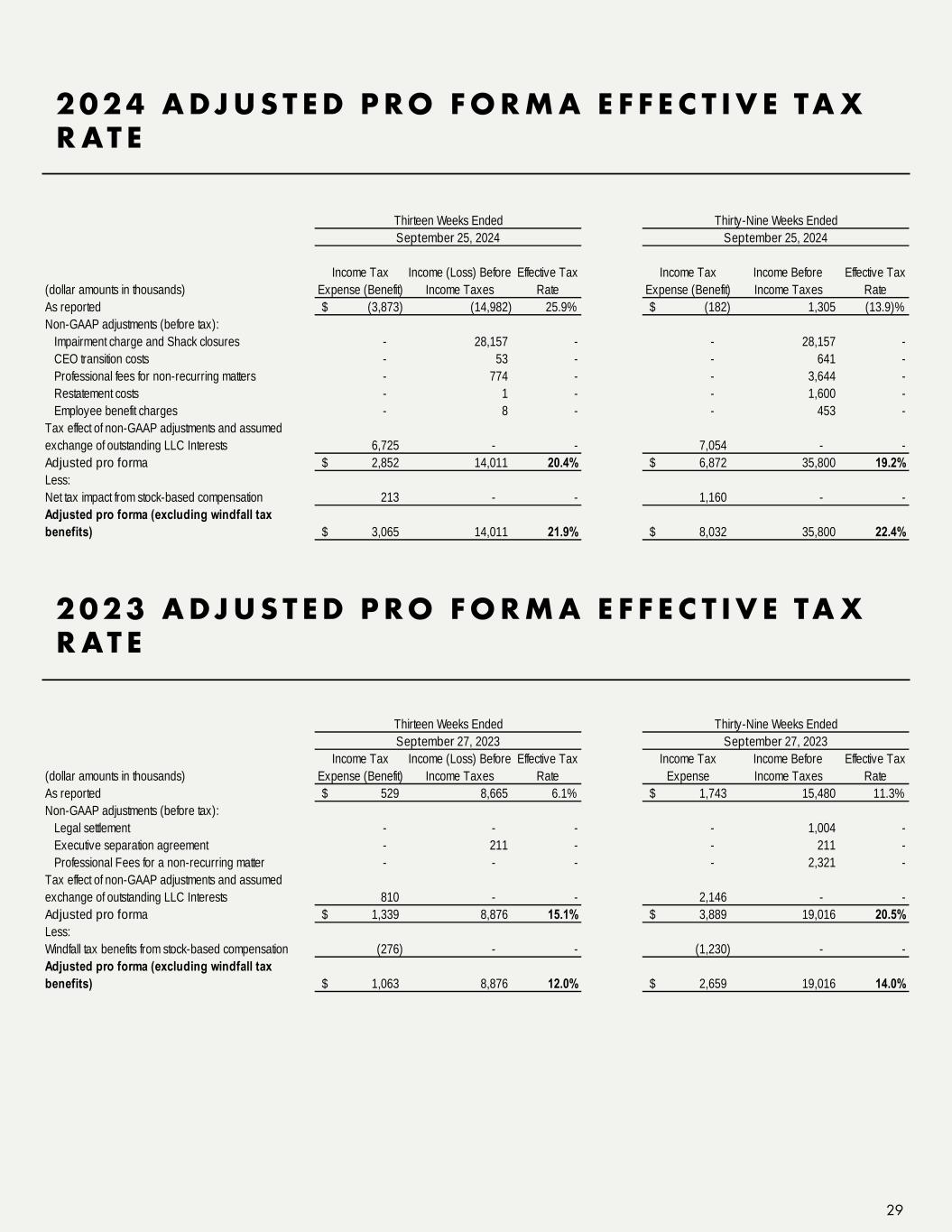 2 0 2 4 A DJ U S T E D P R O F O R M A E F F E C T I V E TA X R AT E 29 2 0 2 3 A DJ U S T E D P R O F O R M A E F F E C T I V E TA X R AT E (dollar amounts in thousands) Income Tax Expense (Benefit) Income (Loss) Before Income Taxes Effective Tax Rate Income Tax Expense (Benefit) Income Before Income Taxes Effective Tax Rate As reported (3,873)$ (14,982) 25.9% (182)$ 1,305 (13.9)% Non-GAAP adjustments (before tax): Impairment charge and Shack closures - 28,157 - - 28,157 - CEO transition costs - 53 - - 641 - Professional fees for non-recurring matters - 774 - - 3,644 - Restatement costs - 1 - - 1,600 - Employee benefit charges - 8 - - 453 - Tax effect of non-GAAP adjustments and assumed exchange of outstanding LLC Interests 6,725 - - 7,054 - - Adjusted pro forma 2,852$ 14,011 20.4% 6,872$ 35,800 19.2% Less: Net tax impact from stock-based compensation 213 - - 1,160 - - Adjusted pro forma (excluding windfall tax benefits) 3,065$ 14,011 21.9% 8,032$ 35,800 22.4% Thirteen Weeks Ended Thirty-Nine Weeks Ended September 25, 2024 September 25, 2024 (dollar amounts in thousands) Income Tax Expense (Benefit) Income (Loss) Before Income Taxes Effective Tax Rate Income Tax Expense Income Before Income Taxes Effective Tax Rate As reported 529$ 8,665 6.1% 1,743$ 15,480 11.3% Non-GAAP adjustments (before tax): Legal settlement - - - - 1,004 - Executive separation agreement - 211 - - 211 - Professional Fees for a non-recurring matter - - - - 2,321 - Tax effect of non-GAAP adjustments and assumed exchange of outstanding LLC Interests 810 - - 2,146 - - Adjusted pro forma 1,339$ 8,876 15.1% 3,889$ 19,016 20.5% Less: Windfall tax benefits from stock-based compensation (276) - - (1,230) - - Adjusted pro forma (excluding windfall tax benefits) 1,063$ 8,876 12.0% 2,659$ 19,016 14.0% September 27, 2023 September 27, 2023 Thirteen Weeks Ended Thirty-Nine Weeks Ended