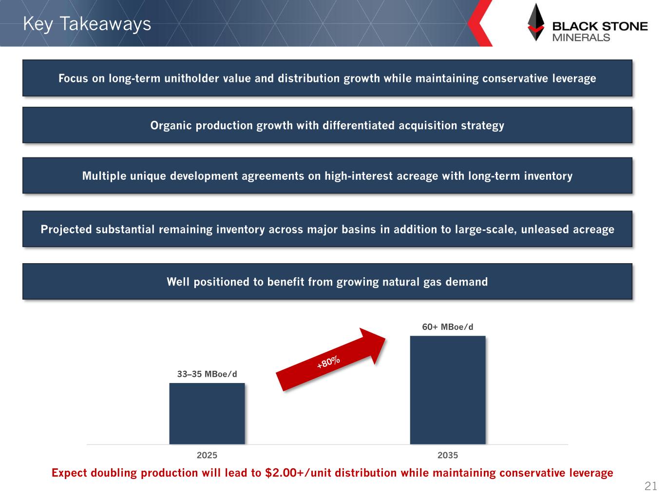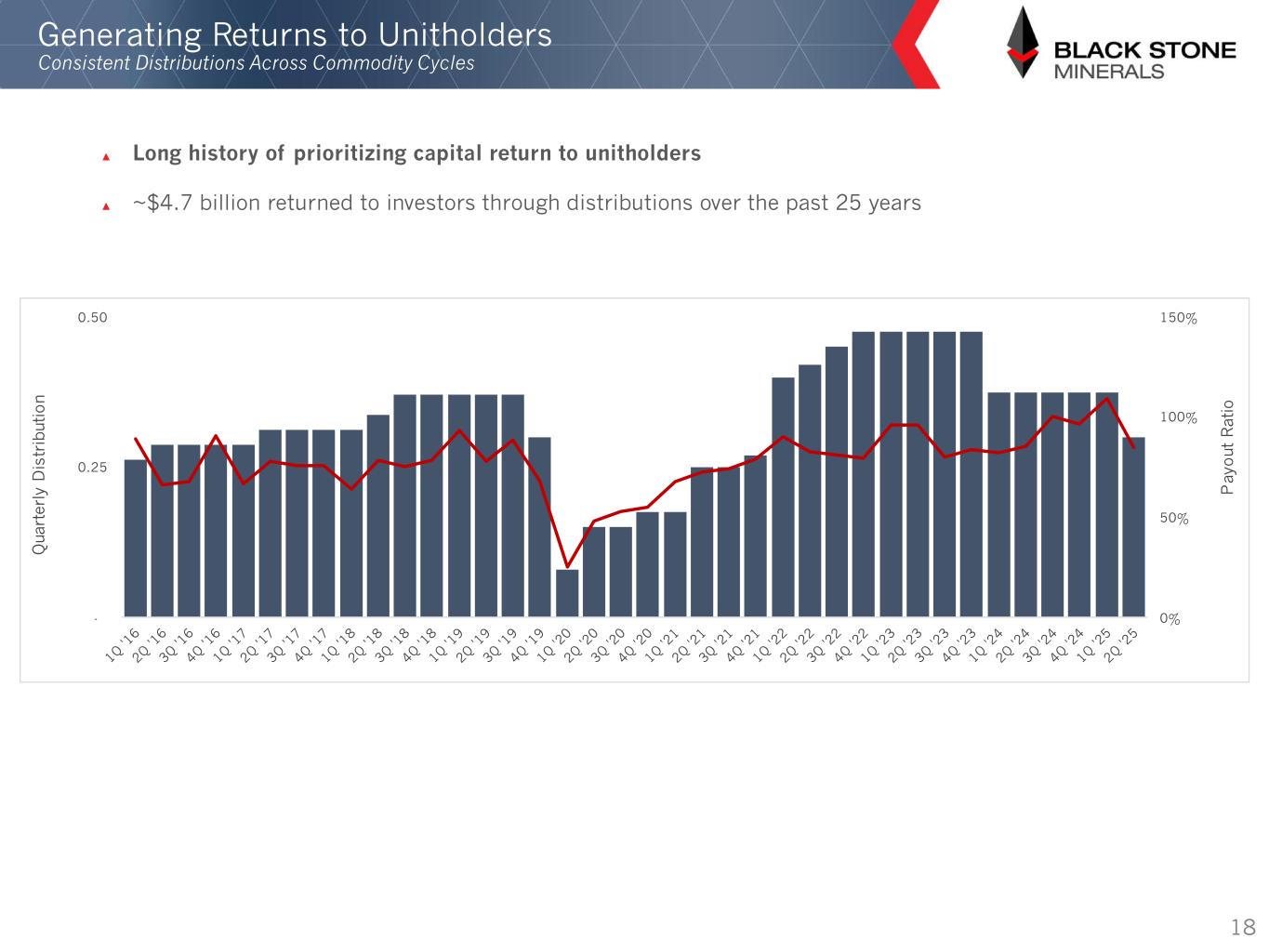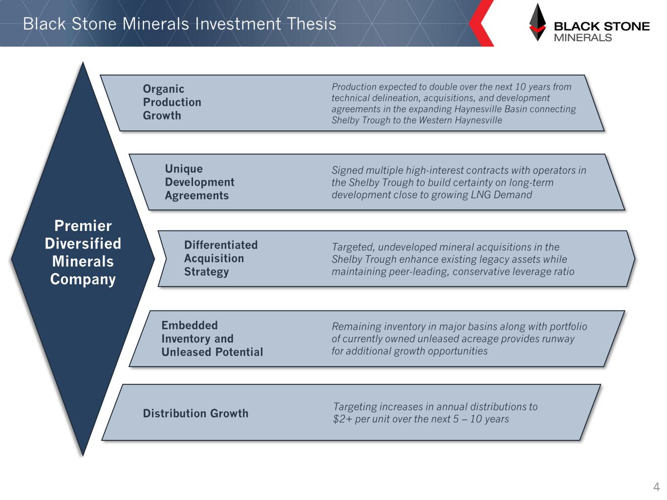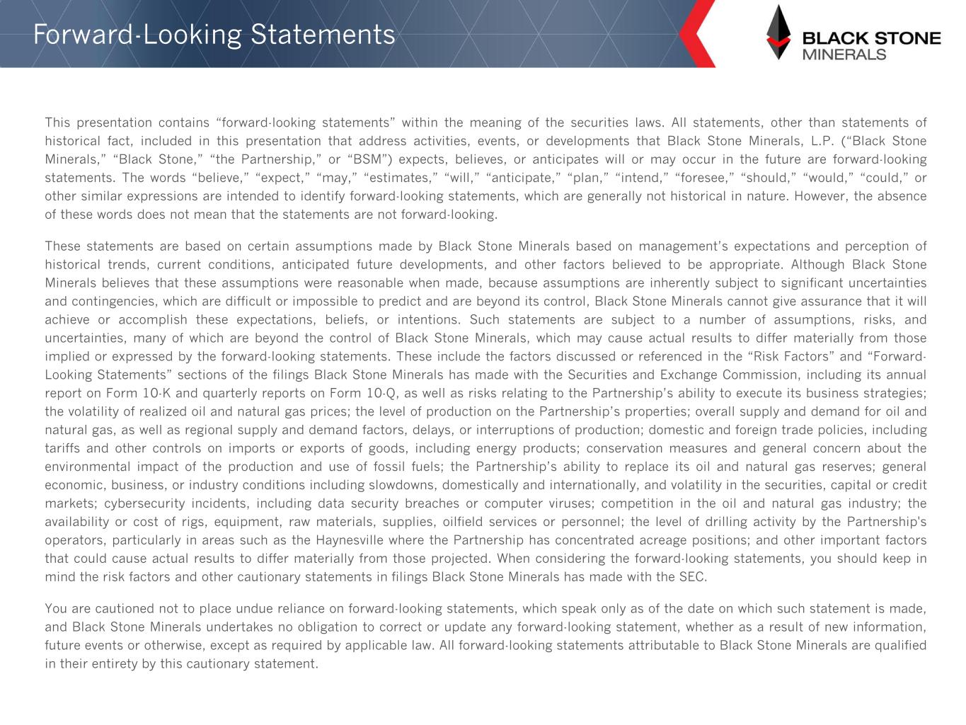 Forward-Looking Statements This presentation contains “forward-looking statements” within the meaning of the securities laws. All statements, other than statements of historical fact, included in this presentation that address activities, events, or developments that Black Stone Minerals, L.P. (“Black Stone Minerals,” “Black Stone,” “the Partnership,” or “BSM”) expects, believes, or anticipates will or may occur in the future are forward-looking statements. The words “believe,” “expect,” “may,” “estimates,” “will,” “anticipate,” “plan,” “intend,” “foresee,” “should,” “would,” “could,” or other similar expressions are intended to identify forward-looking statements, which are generally not historical in nature. However, the absence of these words does not mean that the statements are not forward-looking. These statements are based on certain assumptions made by Black Stone Minerals based on management’s expectations and perception of historical trends, current conditions, anticipated future developments, and other factors believed to be appropriate. Although Black Stone Minerals believes that these assumptions were reasonable when made, because assumptions are inherently subject to significant uncertainties and contingencies, which are difficult or impossible to predict and are beyond its control, Black Stone Minerals cannot give assurance that it will achieve or accomplish these expectations, beliefs, or intentions. Such statements are subject to a number of assumptions, risks, and uncertainties, many of which are beyond the control of Black Stone Minerals, which may cause actual results to differ materially from those implied or expressed by the forward-looking statements. These include the factors discussed or referenced in the “Risk Factors” and “Forward- Looking Statements” sections of the filings Black Stone Minerals has made with the Securities and Exchange Commission, including its annual report on Form 10-K and quarterly reports on Form 10-Q, as well as risks relating to the Partnership’s ability to execute its business strategies; the volatility of realized oil and natural gas prices; the level of production on the Partnership’s properties; overall supply and demand for oil and natural gas, as well as regional supply and demand factors, delays, or interruptions of production; domestic and foreign trade policies, including tariffs and other controls on imports or exports of goods, including energy products; conservation measures and general concern about the environmental impact of the production and use of fossil fuels; the Partnership’s ability to replace its oil and natural gas reserves; general economic, business, or industry conditions including slowdowns, domestically and internationally, and volatility in the securities, capital or credit markets; cybersecurity incidents, including data security breaches or computer viruses; competition in the oil and natural gas industry; the availability or cost of rigs, equipment, raw materials, supplies, oilfield services or personnel; the level of drilling activity by the Partnership's operators, particularly in areas such as the Haynesville where the Partnership has concentrated acreage positions; and other important factors that could cause actual results to differ materially from those projected. When considering the forward-looking statements, you should keep in mind the risk factors and other cautionary statements in filings Black Stone Minerals has made with the SEC. You are cautioned not to place undue reliance on forward-looking statements, which speak only as of the date on which such statement is made, and Black Stone Minerals undertakes no obligation to correct or update any forward-looking statement, whether as a result of new information, future events or otherwise, except as required by applicable law. All forward-looking statements attributable to Black Stone Minerals are qualified in their entirety by this cautionary statement.